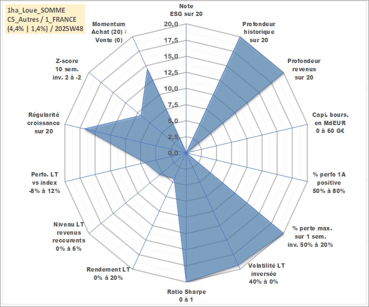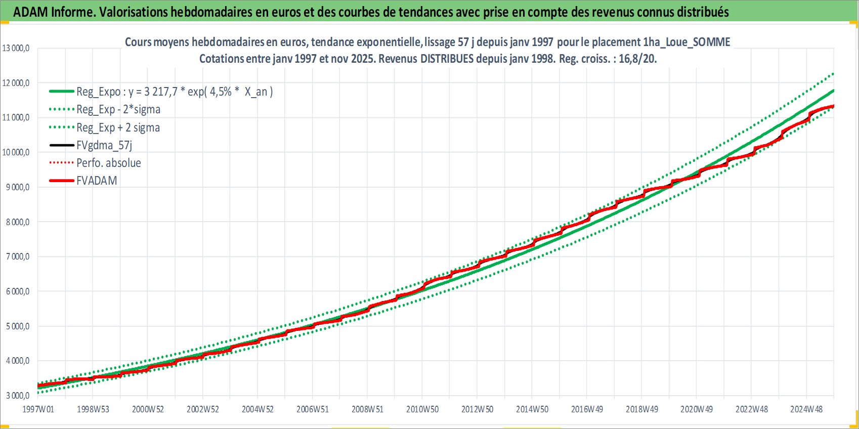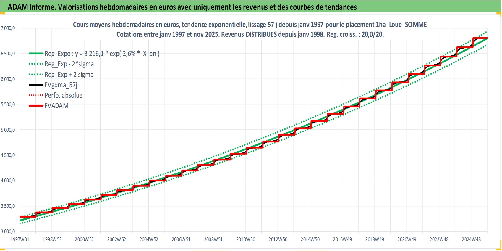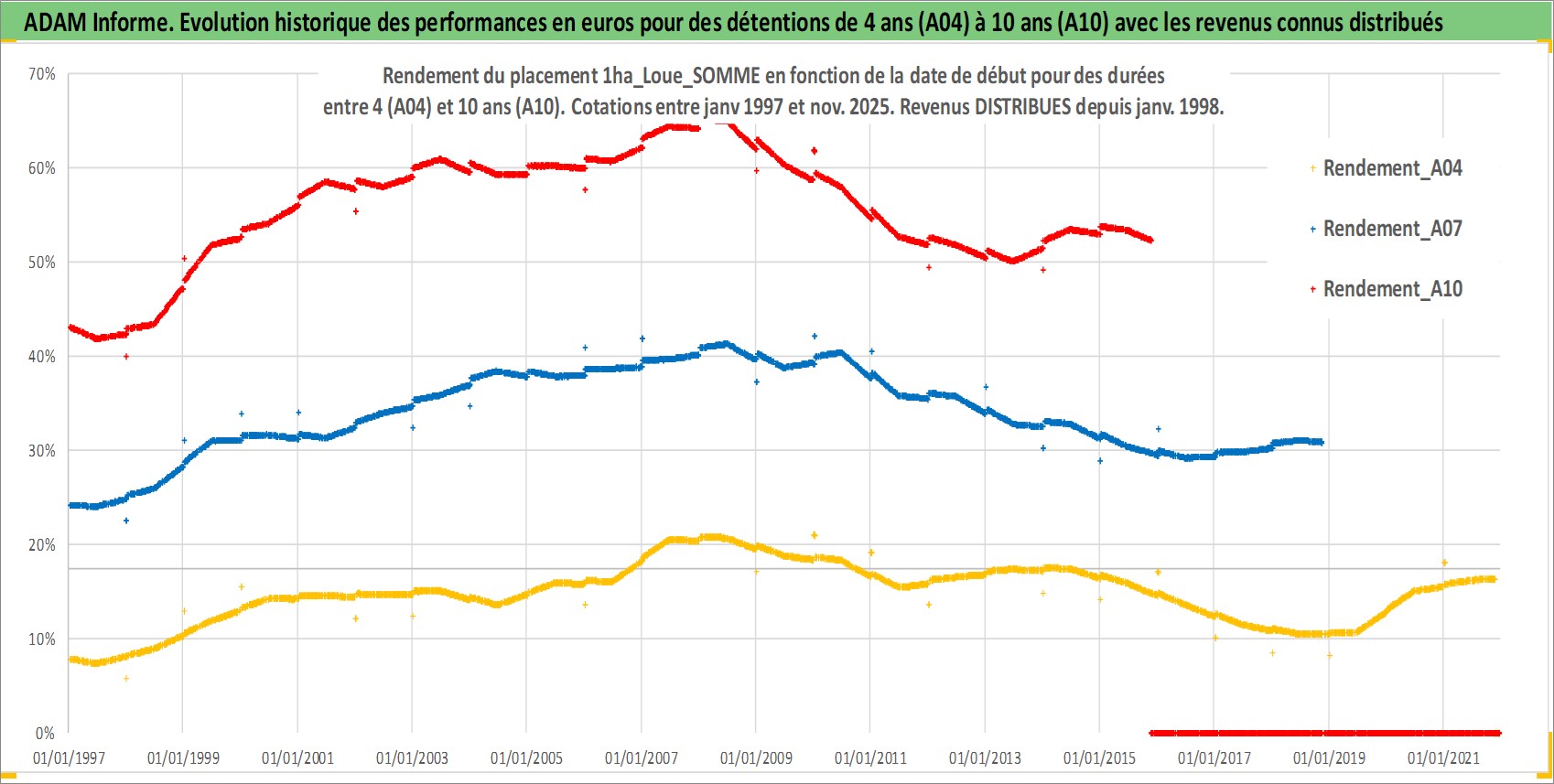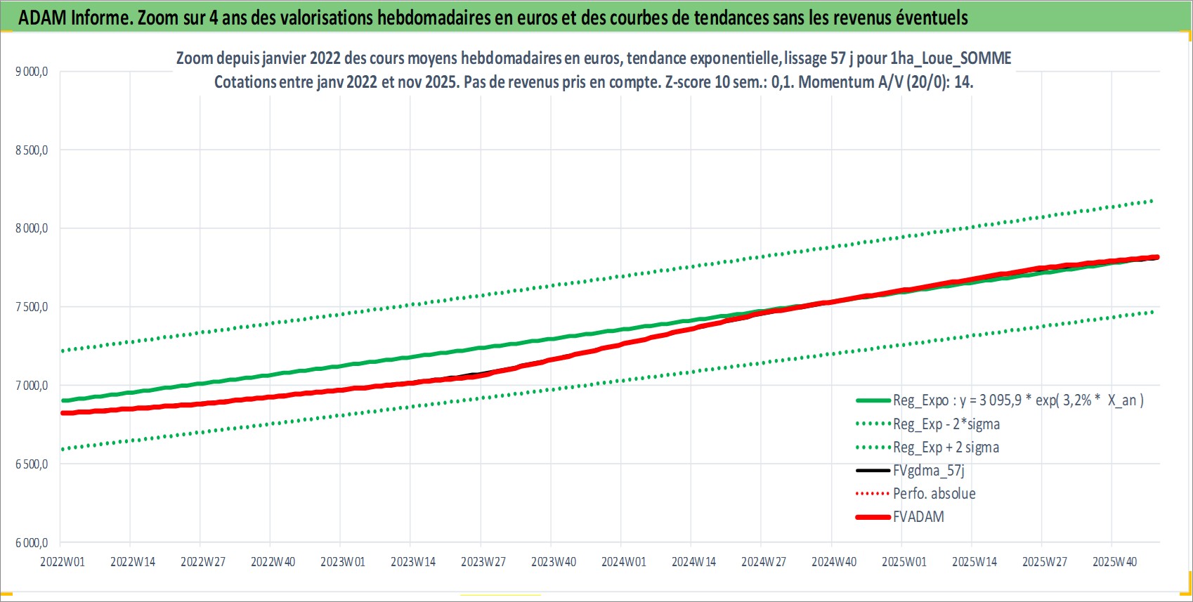 Site dédié aux investisseursPage dédiée sur site financeAnalyse des valorisations hebdomadaires de l'actif 1ha_Loue_SOMME. Cet actif est cote en EUR. Les valorisations couvrent les semaines 1997W01 a 2025W48. Les fermages de ce bien foncier sont pris egaux a 2,5% annuels de la valeur venale du bien.