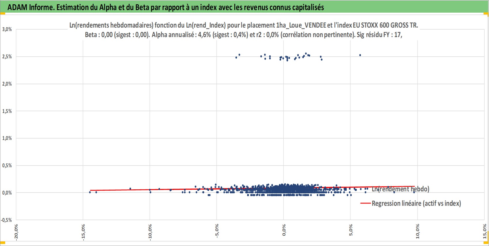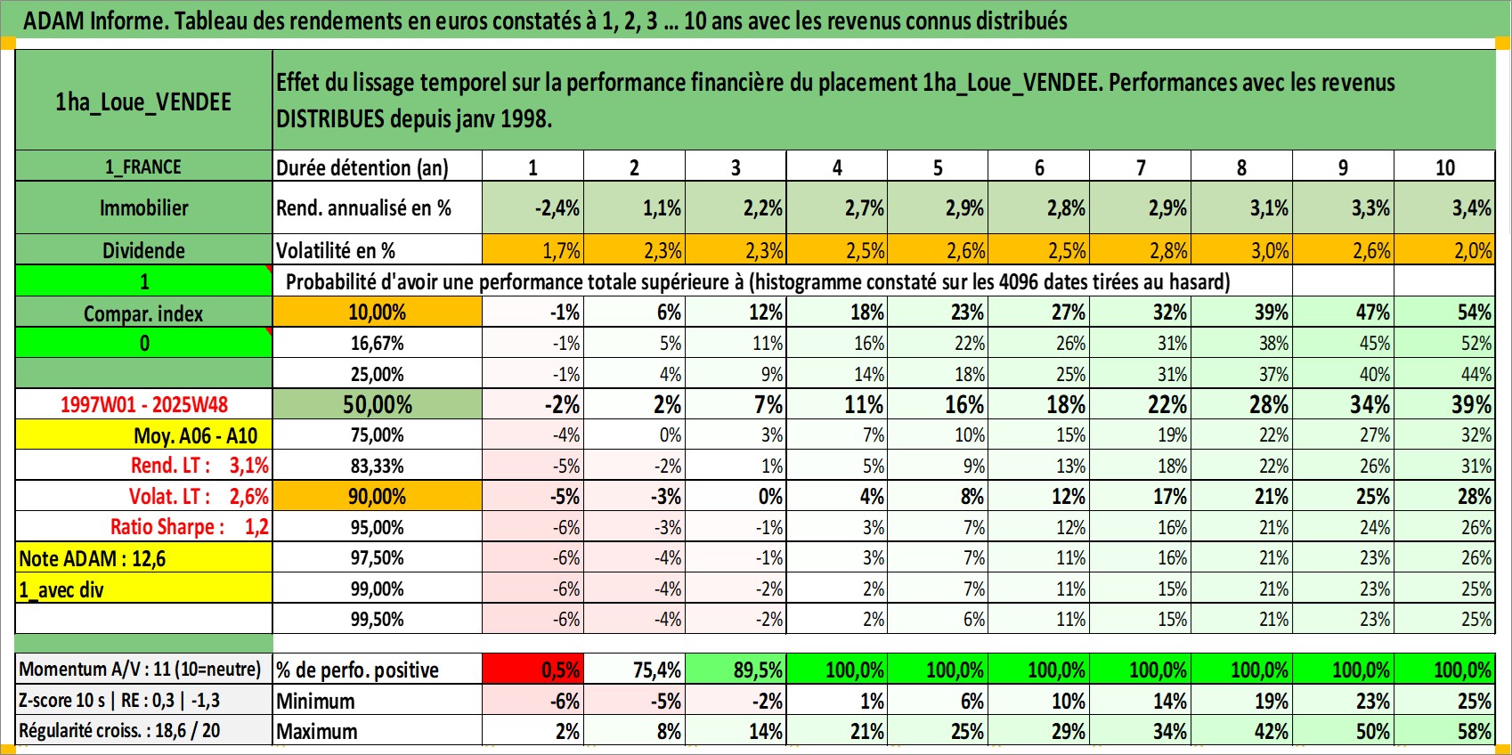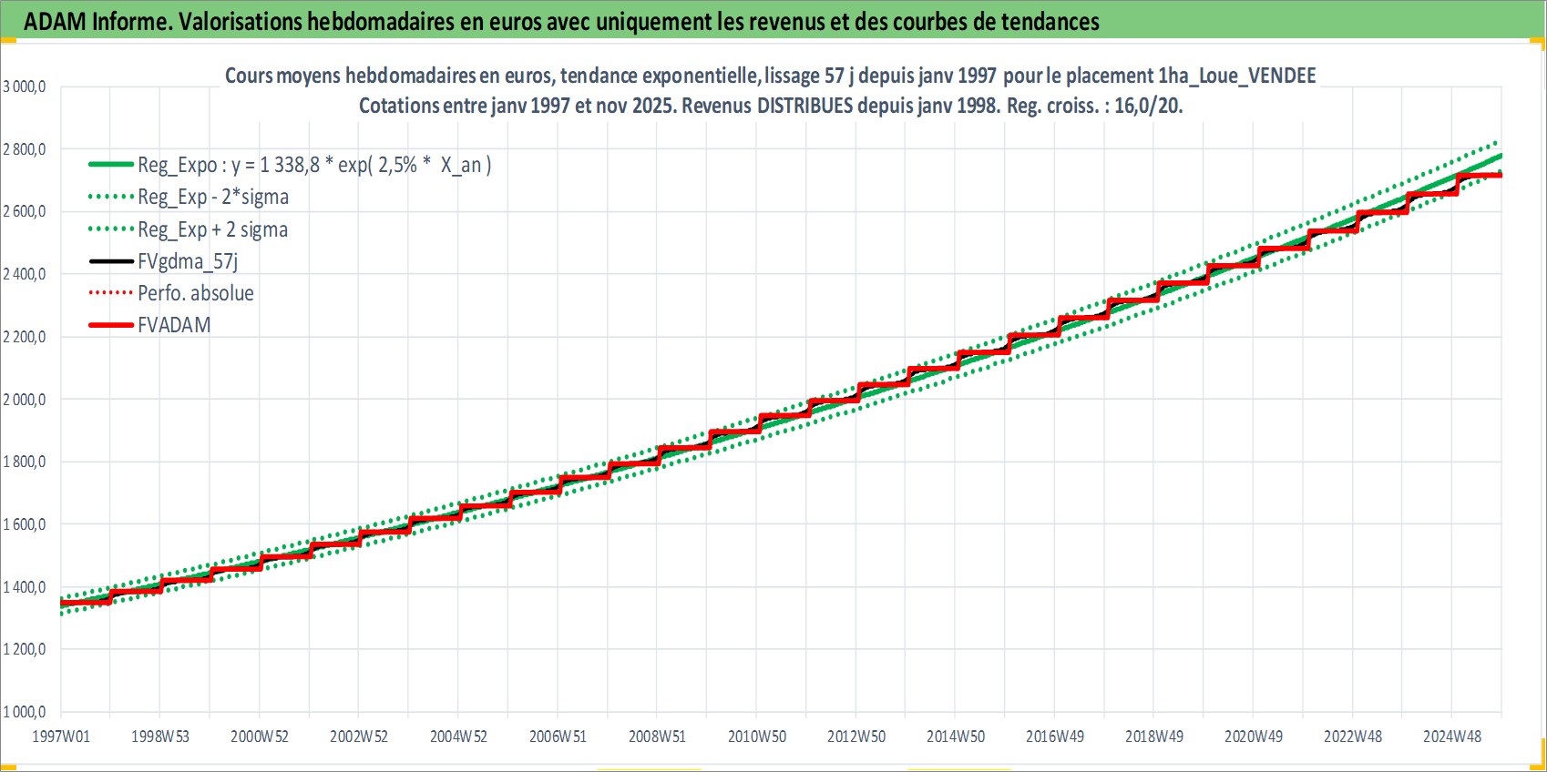 Site dédié aux investisseursPage dédiée sur site financeAnalyse des valorisations hebdomadaires de l'actif 1ha_Loue_VENDEE. Cet actif est cote en EUR. Les valorisations couvrent les semaines 1997W01 a 2025W48. Les fermages de ce bien foncier sont pris egaux a 2,5% annuels de la valeur venale du bien.