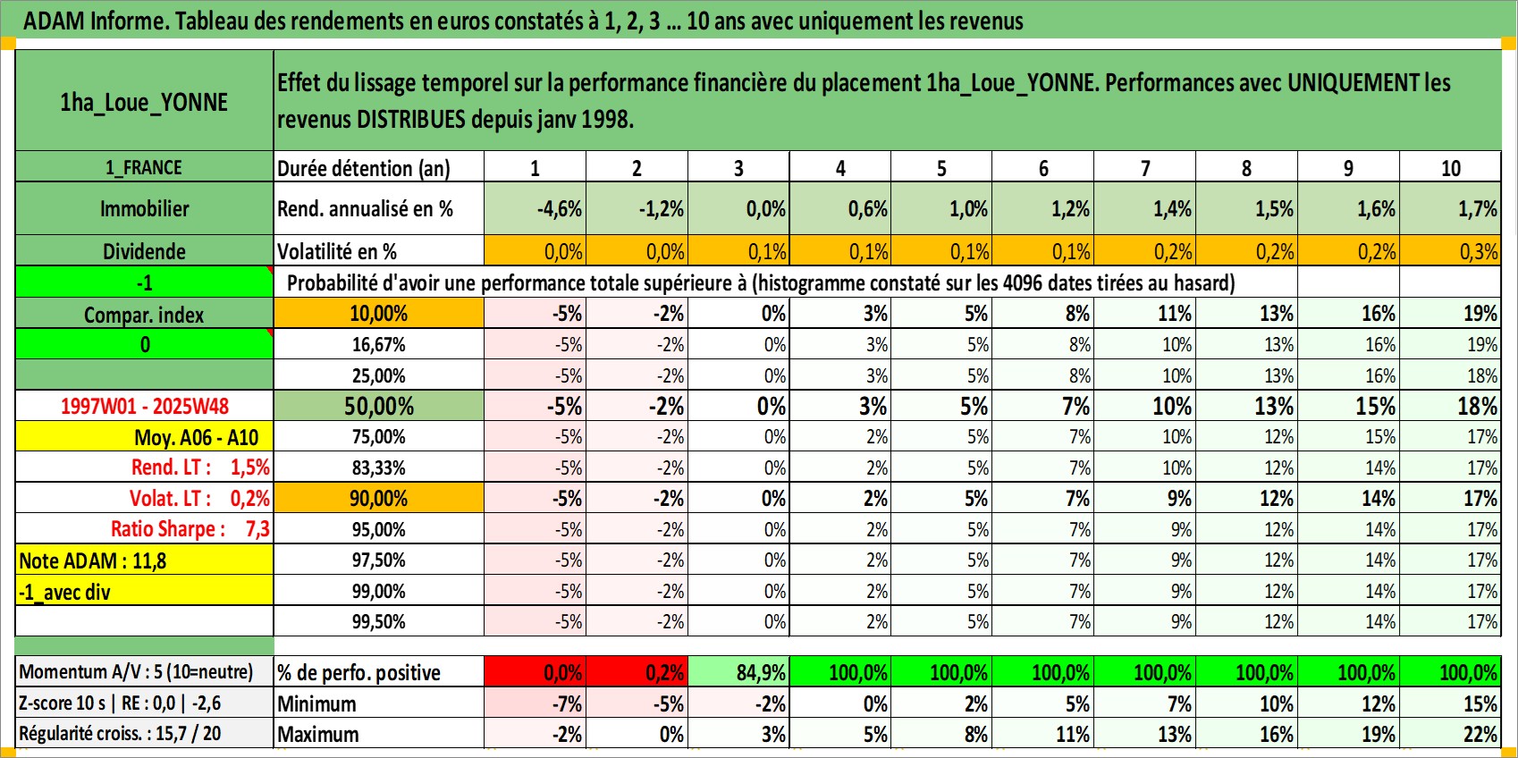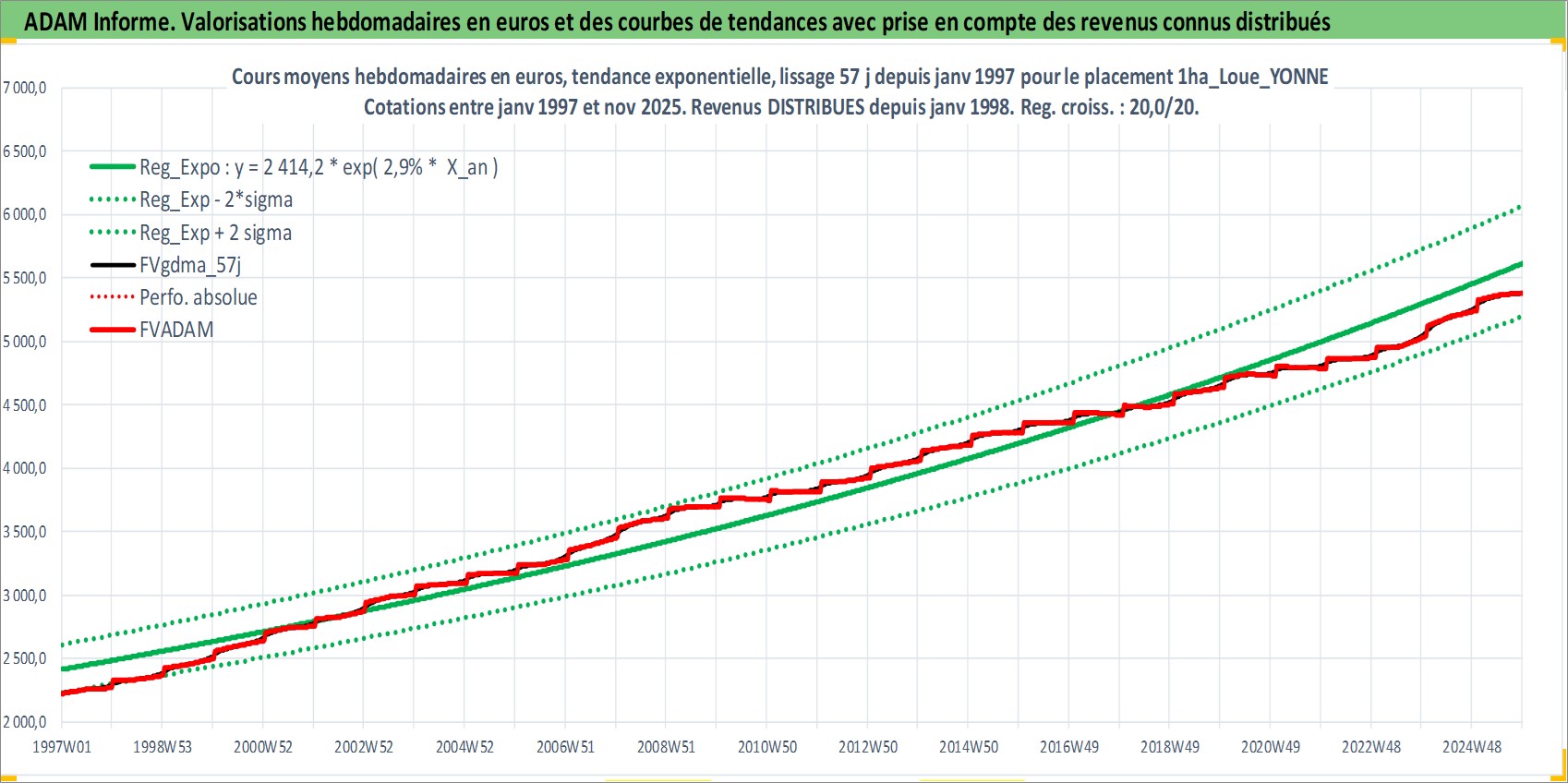 Site dédié aux investisseursPage dédiée sur site financeAnalyse des valorisations hebdomadaires de l'actif 1ha_Loue_YONNE. Cet actif est cote en EUR. Les valorisations couvrent les semaines 1997W01 a 2025W48. Les fermages de ce bien foncier sont pris egaux a 2,5% annuels de la valeur venale du bien.