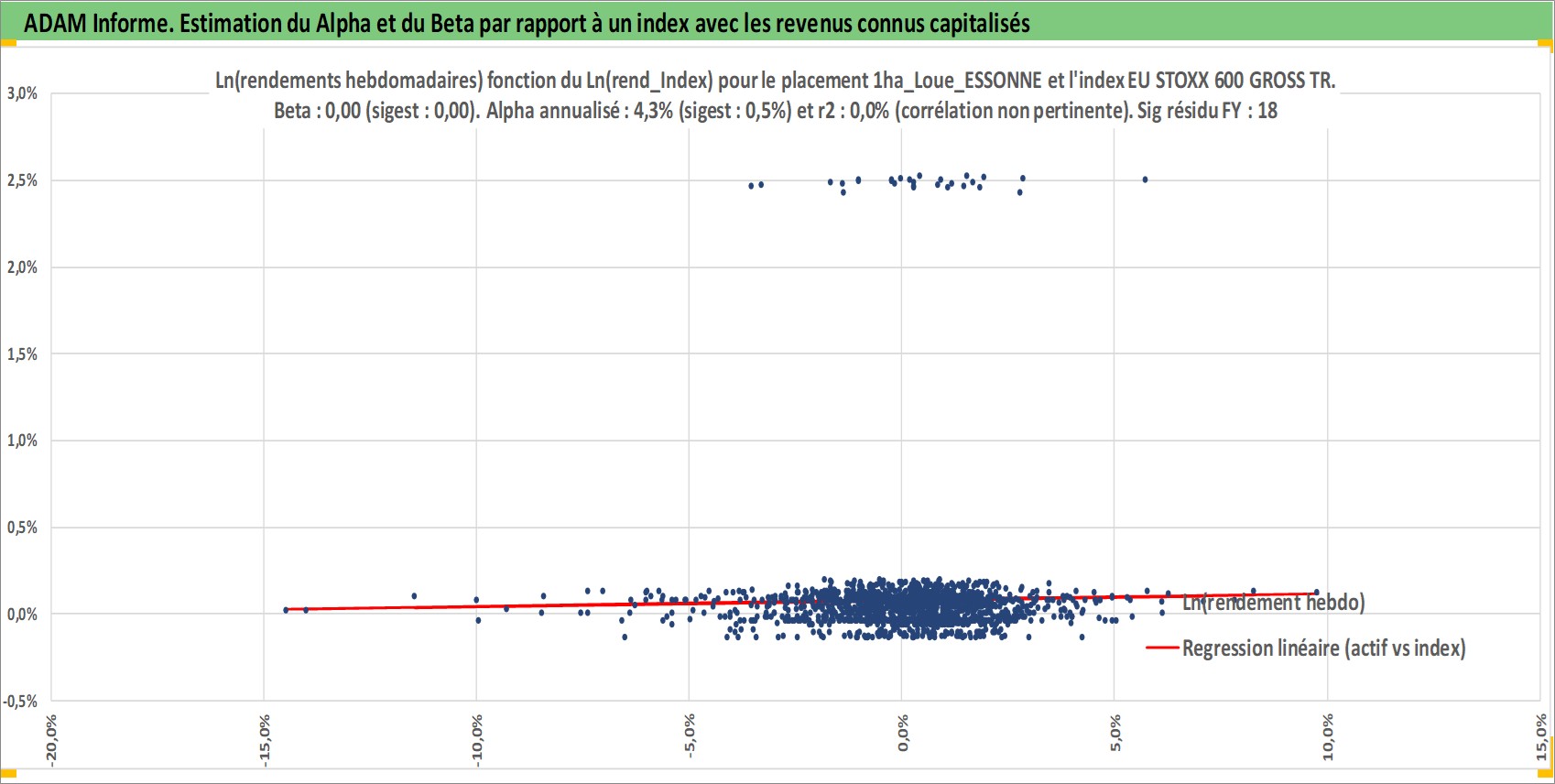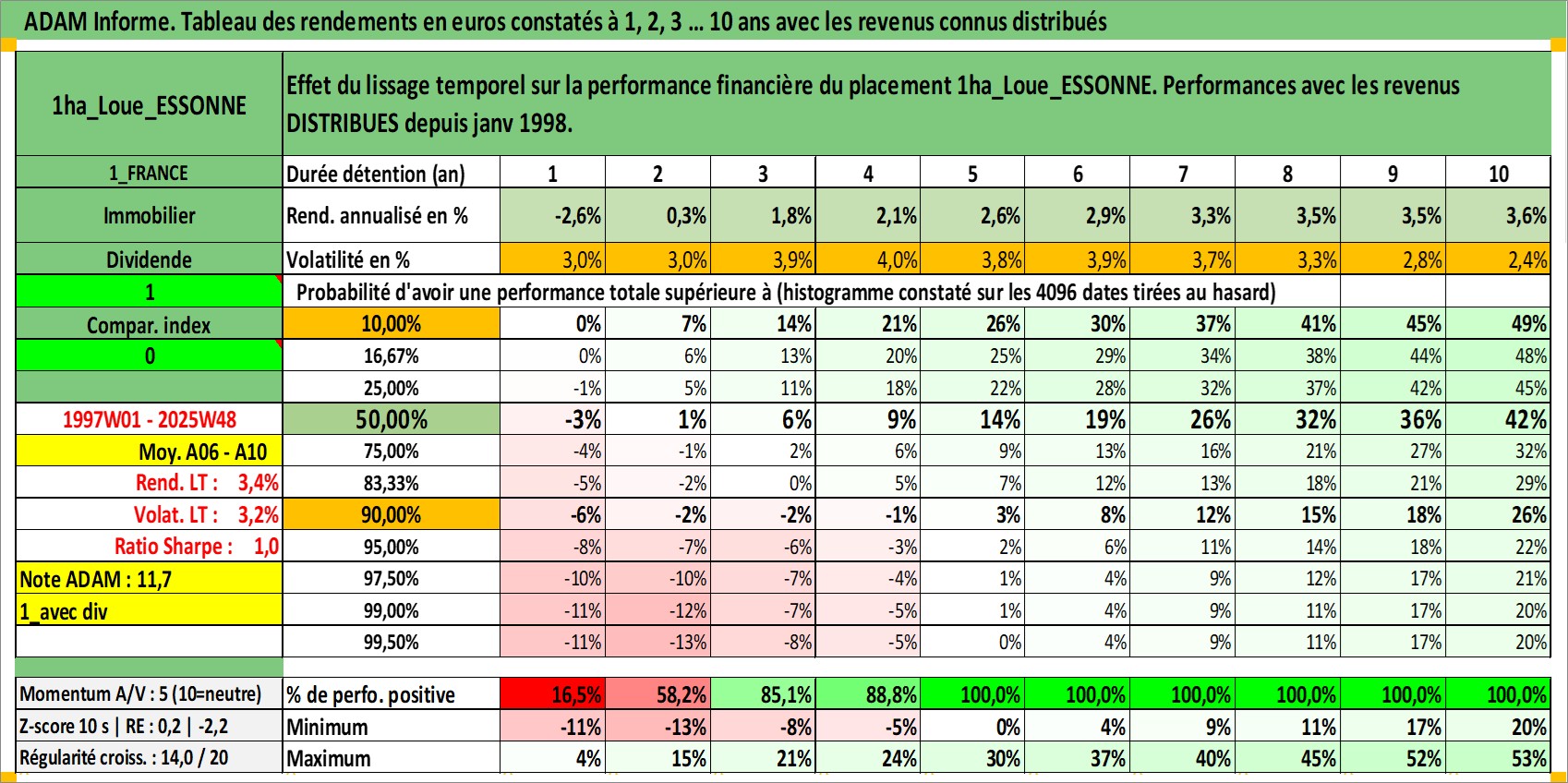 Site dédié aux investisseursPage dédiée sur site financeAnalyse des valorisations hebdomadaires de l'actif 1ha_Loue_ESSONNE. Cet actif est cote en EUR. Les valorisations couvrent les semaines 1997W01 a 2025W48. Les fermages de ce bien foncier sont pris egaux a 2,5% annuels de la valeur venale du bien.