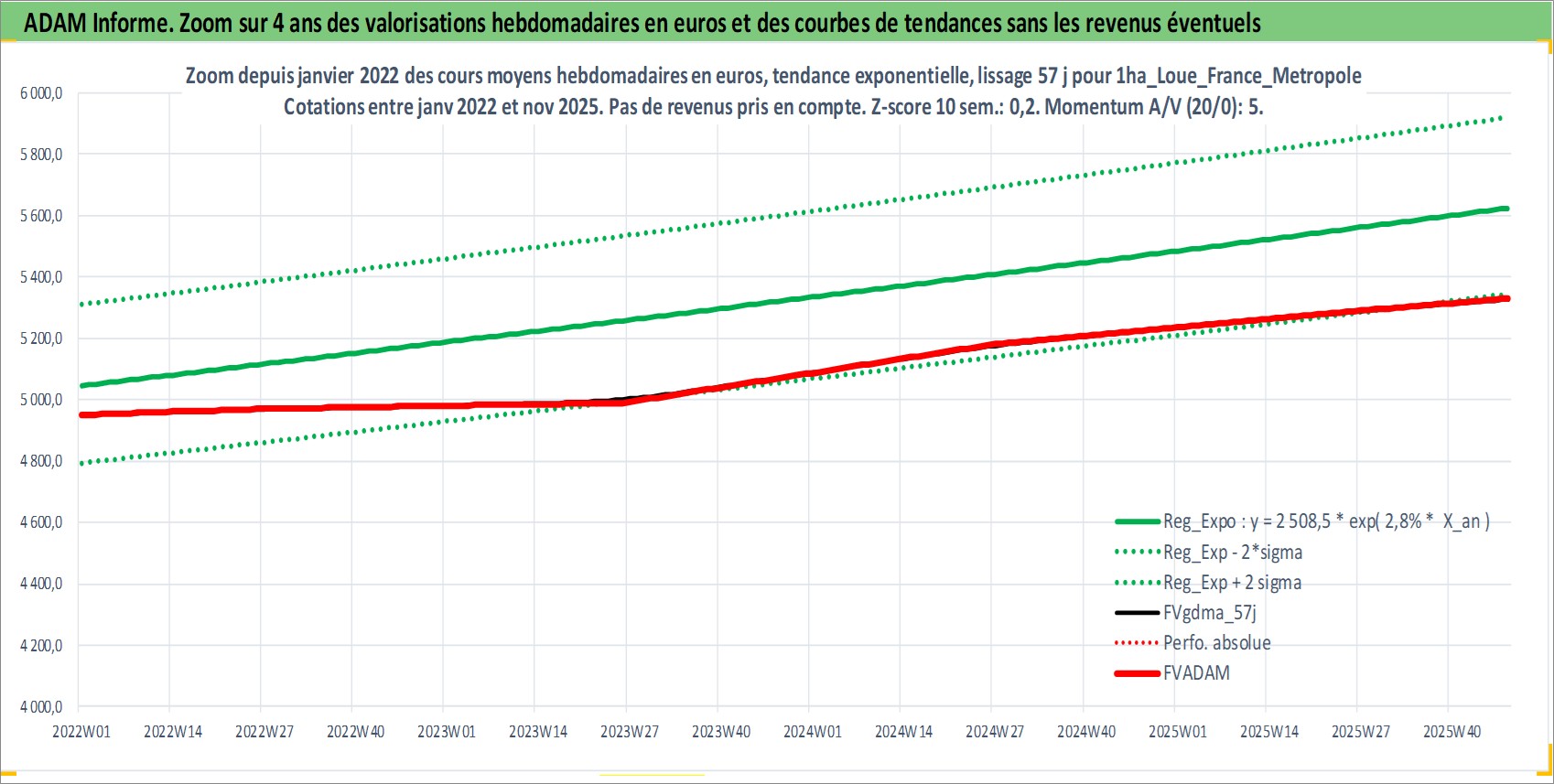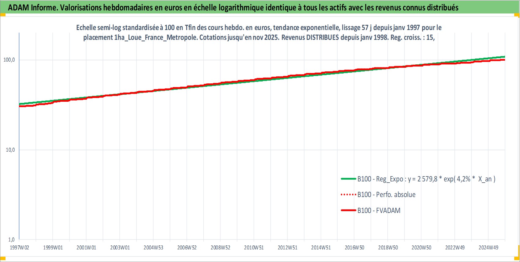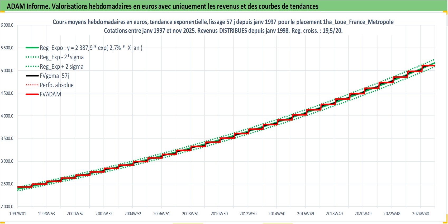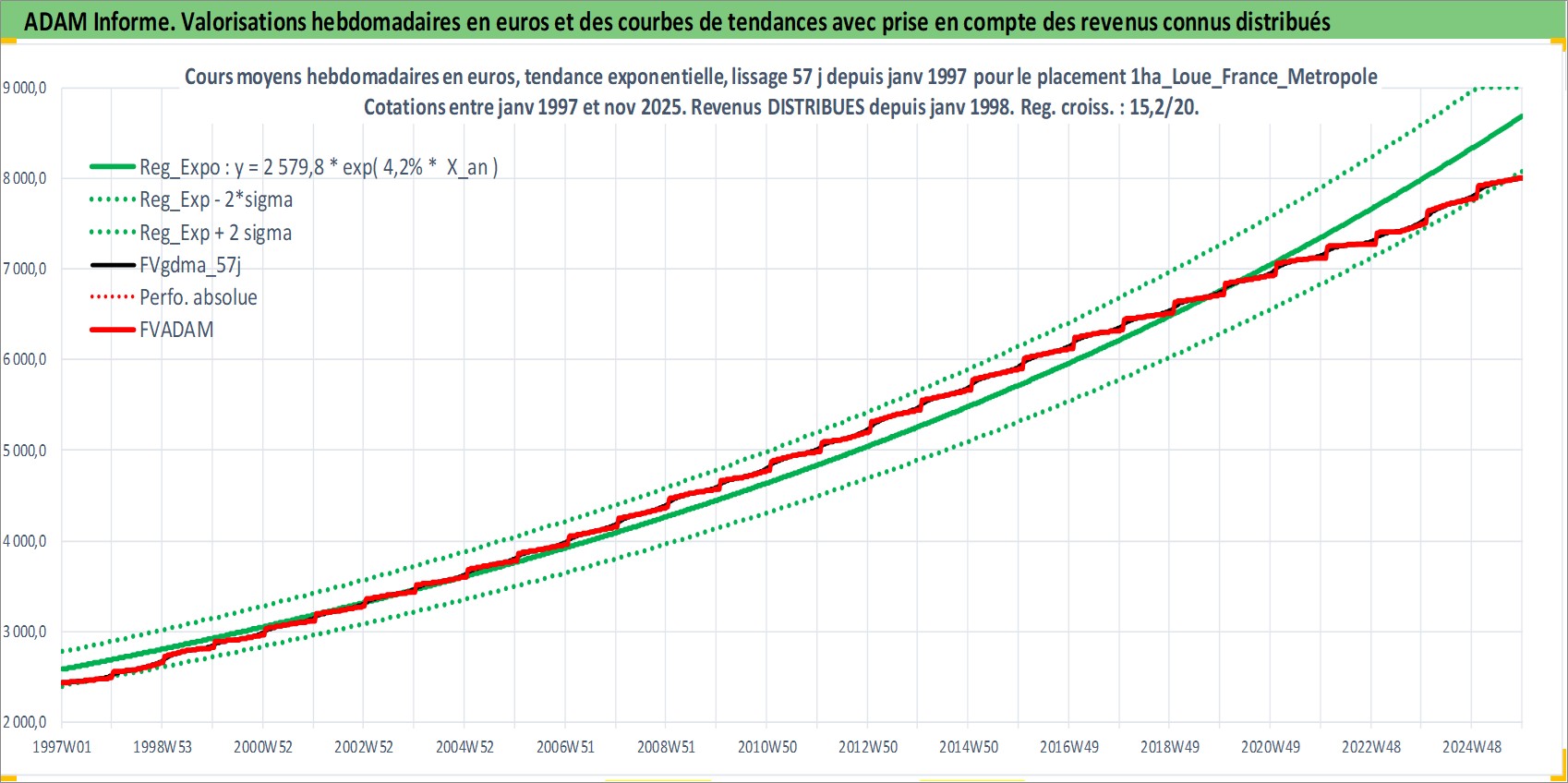 Site dédié aux investisseursPage dédiée sur site financeAnalyse des valorisations hebdomadaires de l'actif 1ha_Loue_France_Metropole. Cet actif est cote en EUR. Les valorisations couvrent les semaines 1997W01 a 2025W48. Les fermages de ce bien foncier sont pris egaux a 2,5% annuels de la valeur venale du bien.