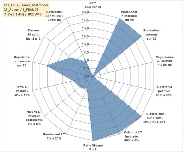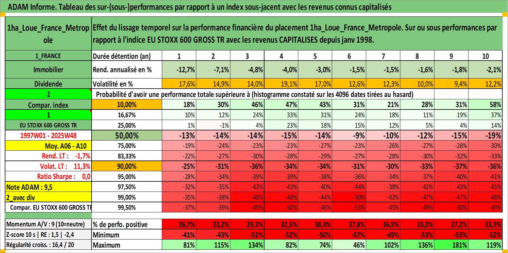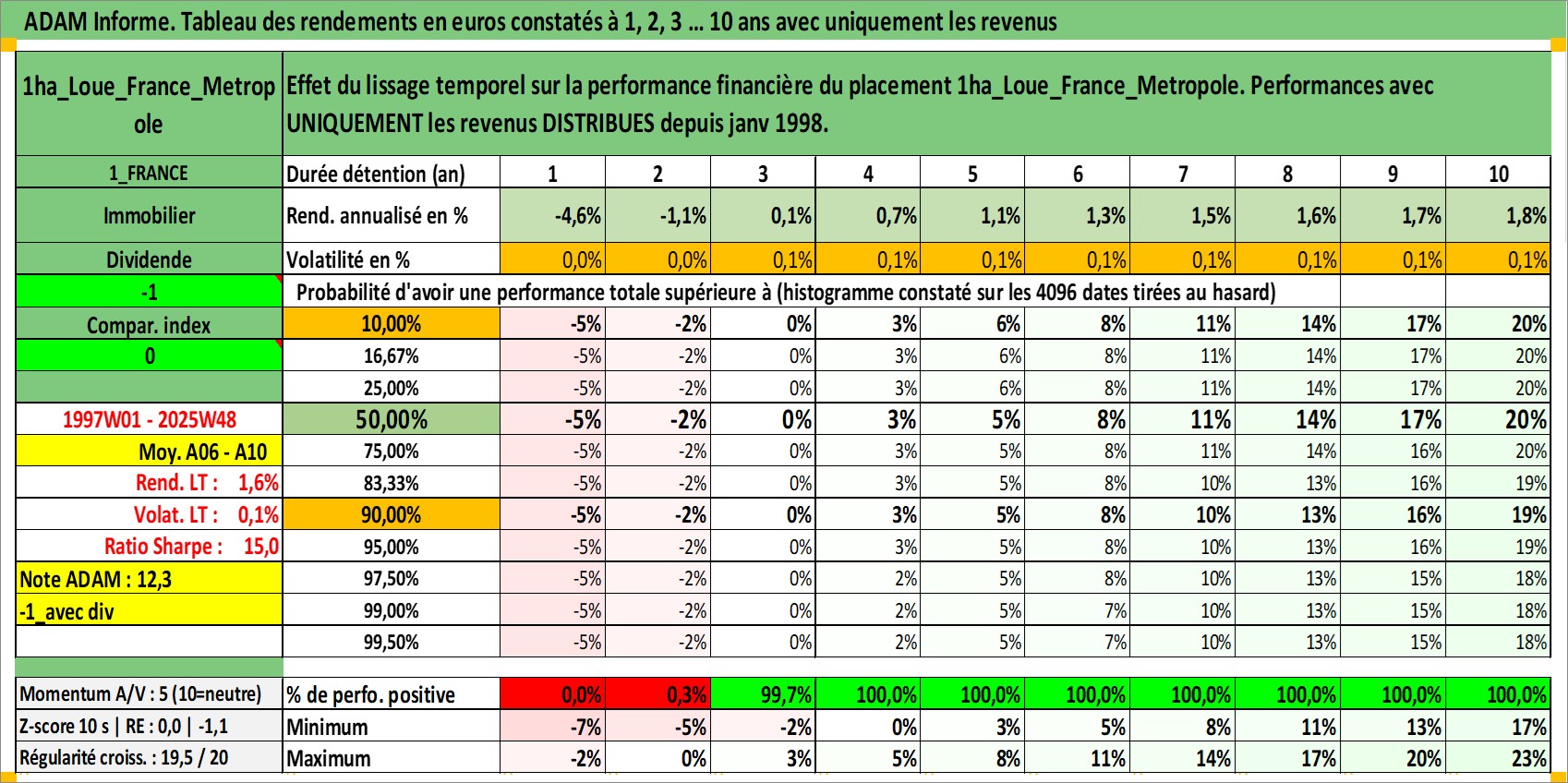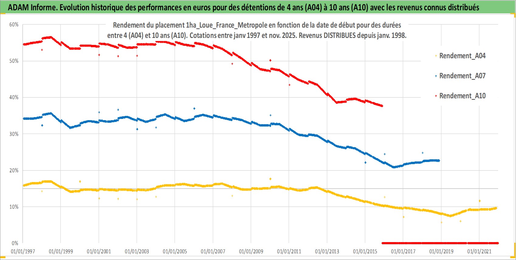 Site dédié aux investisseursPage dédiée sur site financeAnalyse des valorisations hebdomadaires de l'actif 1ha_Loue_France_Metropole. Cet actif est cote en EUR. Les valorisations couvrent les semaines 1997W01 a 2025W48. Les fermages de ce bien foncier sont pris egaux a 2,5% annuels de la valeur venale du bien.