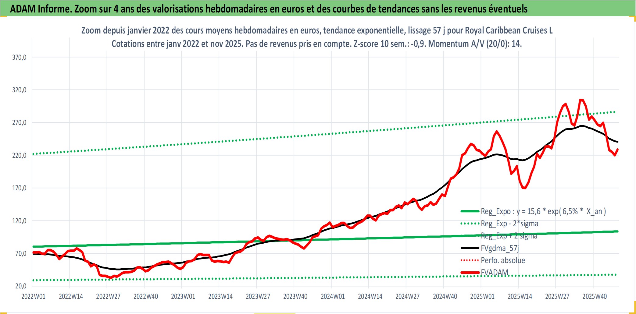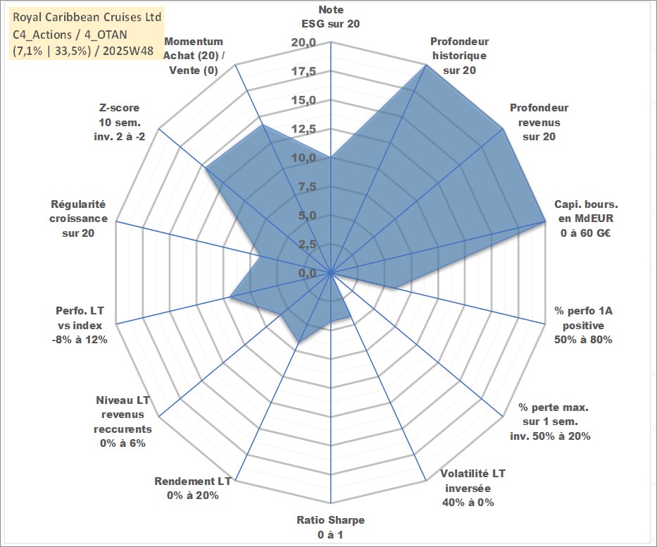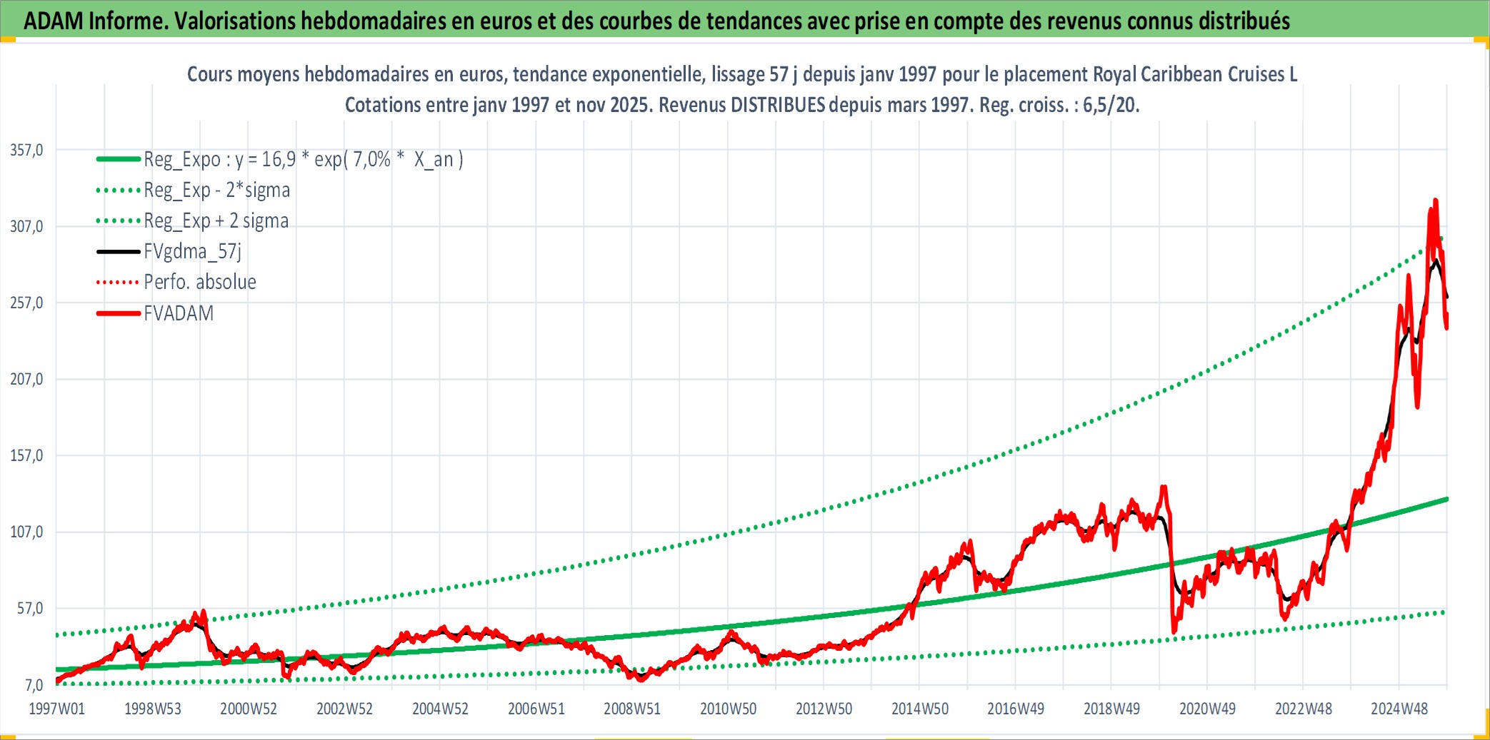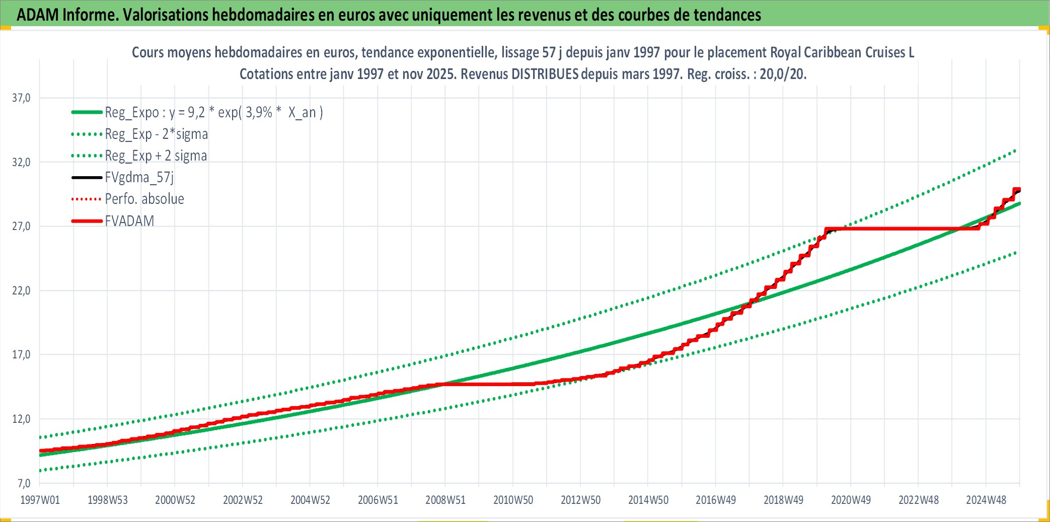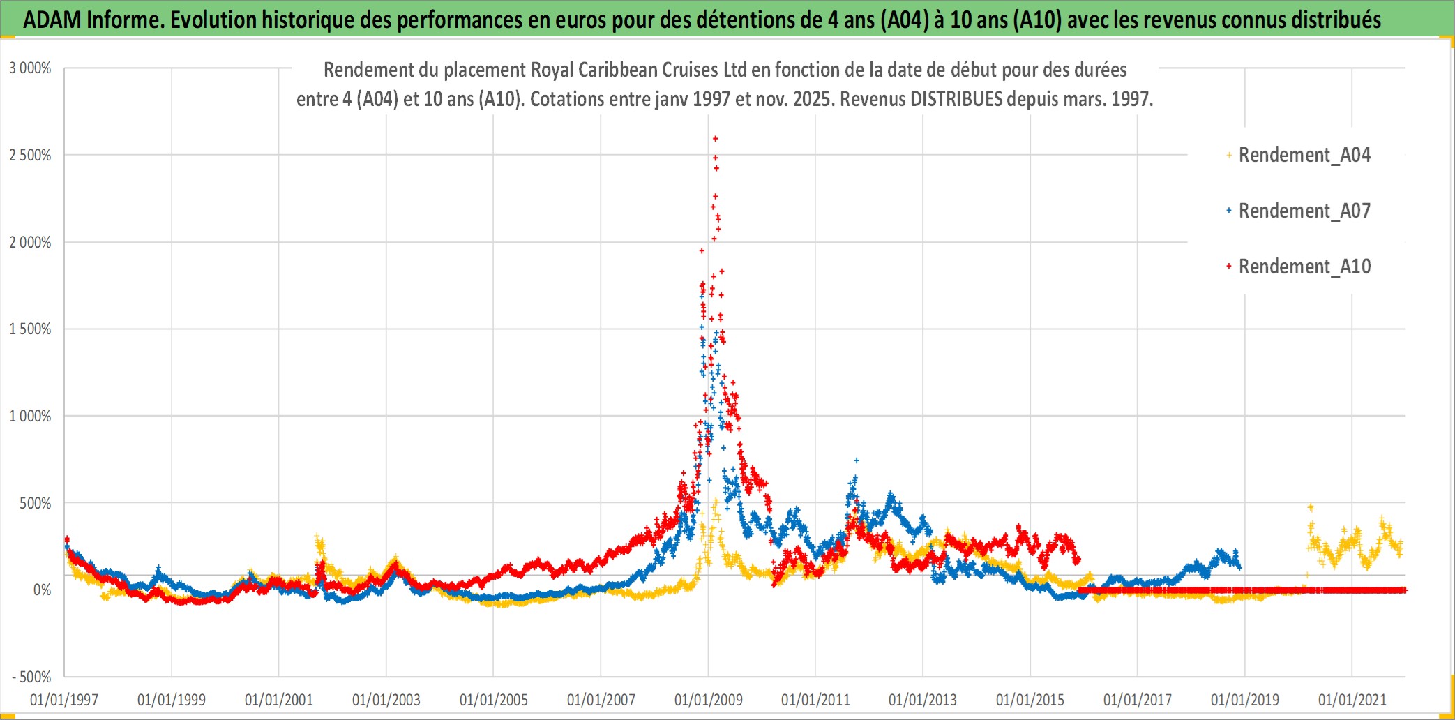 Site dédié aux investisseursPage dédiée sur site financeAnalyse des valorisations hebdomadaires de l'action Royal Caribbean Cruises Ltd. Cet actif est cote en USD. Les valorisations sont en contrevaleur EURO et couvrent les semaines 1997W01 a 2025W48. Les revenus de cet actif financier sont pris en compte depuis la semaine 1997W10. La note globale ESG de cet actif est estimee a 10.0 (apres rebasage entre 0 et 20).