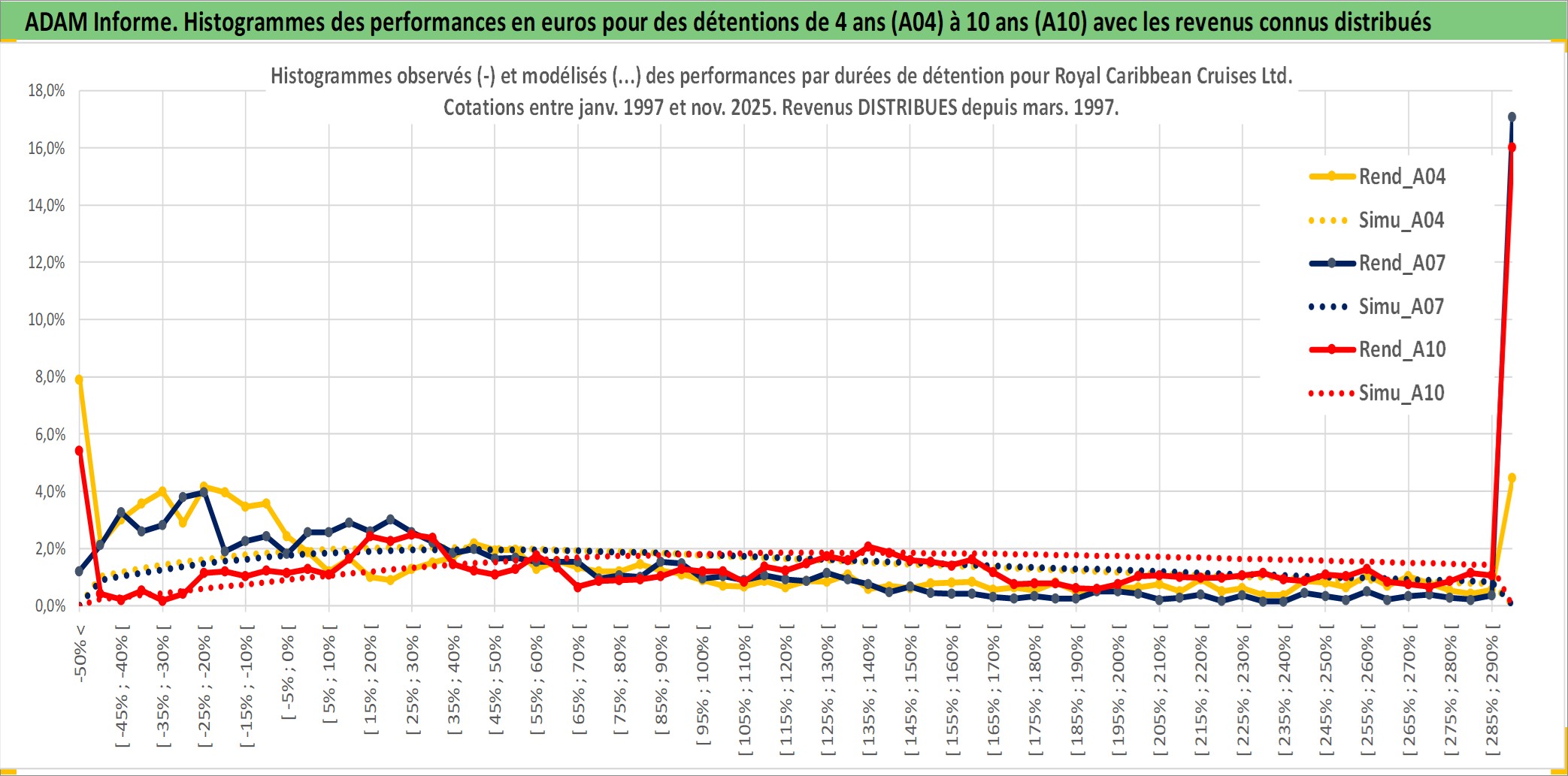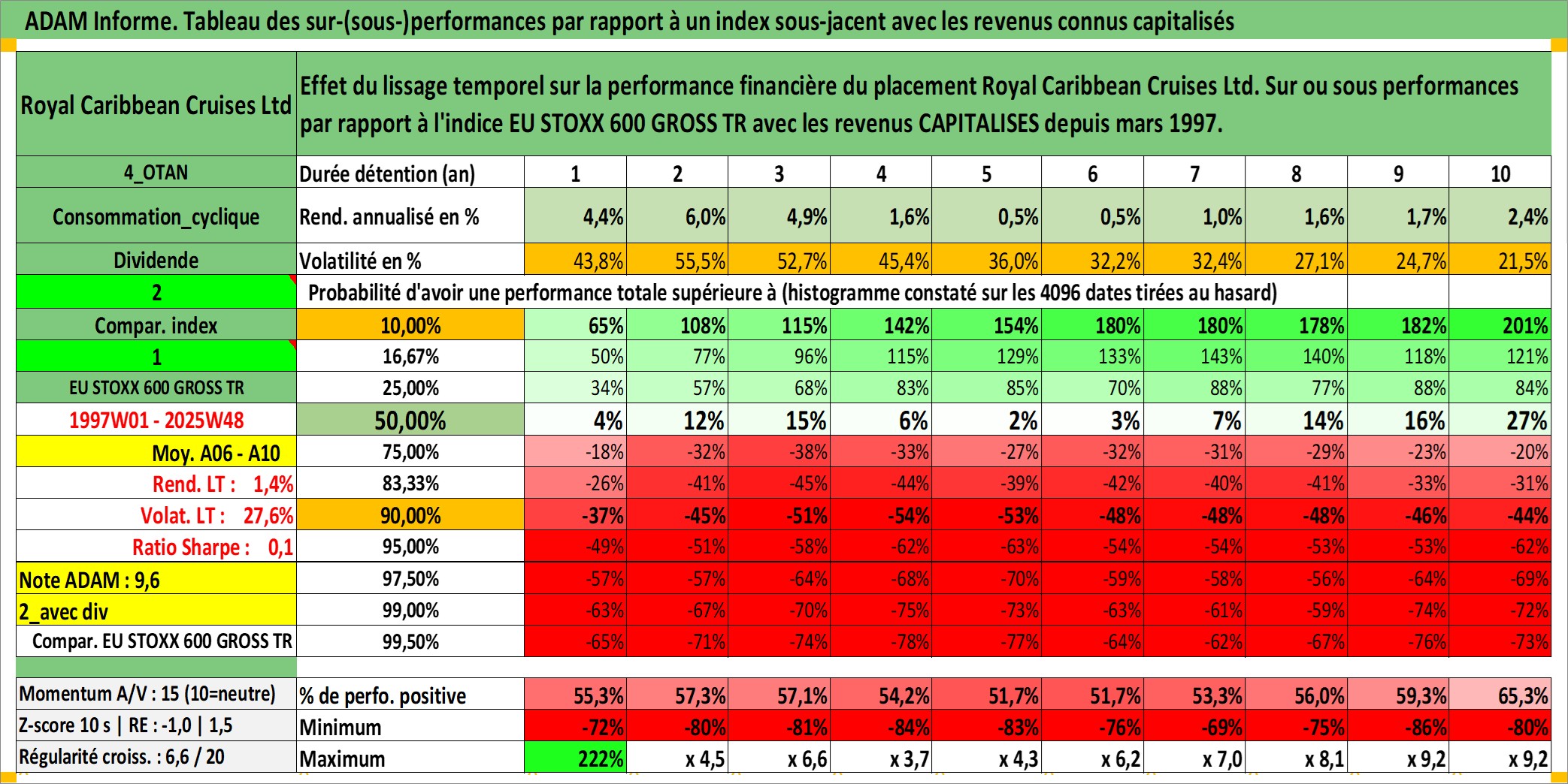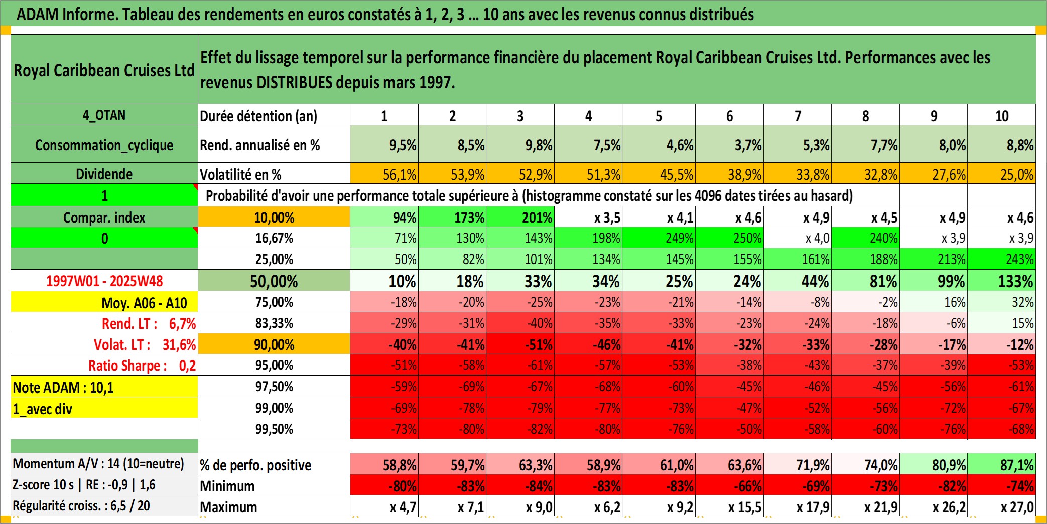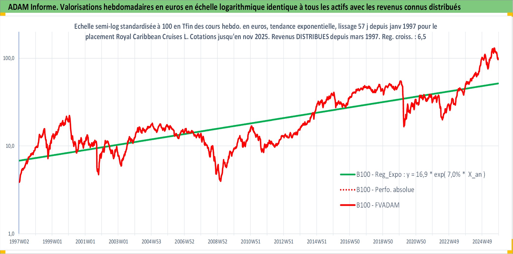 Site dédié aux investisseursPage dédiée sur site financeAnalyse des valorisations hebdomadaires de l'action Royal Caribbean Cruises Ltd. Cet actif est cote en USD. Les valorisations sont en contrevaleur EURO et couvrent les semaines 1997W01 a 2025W48. Les revenus de cet actif financier sont pris en compte depuis la semaine 1997W10. La note globale ESG de cet actif est estimee a 10.0 (apres rebasage entre 0 et 20).