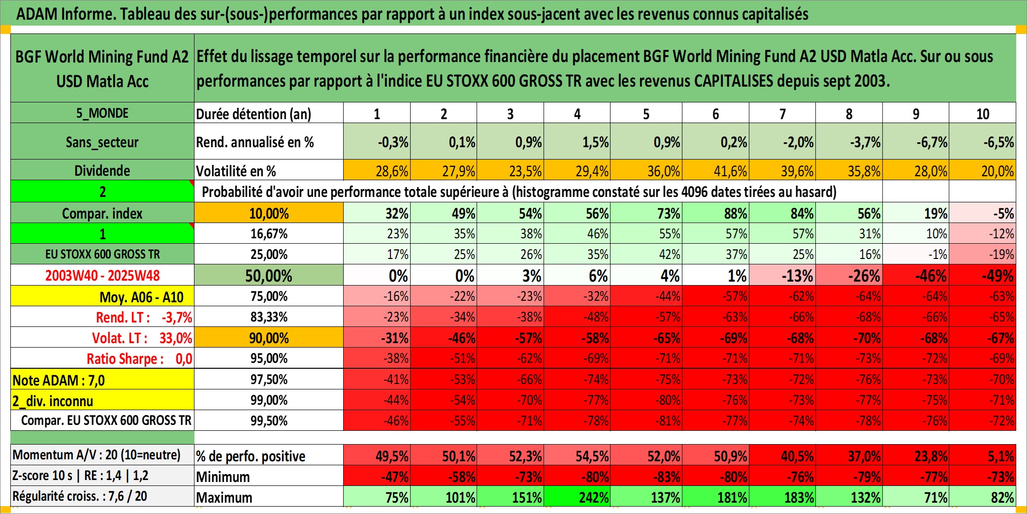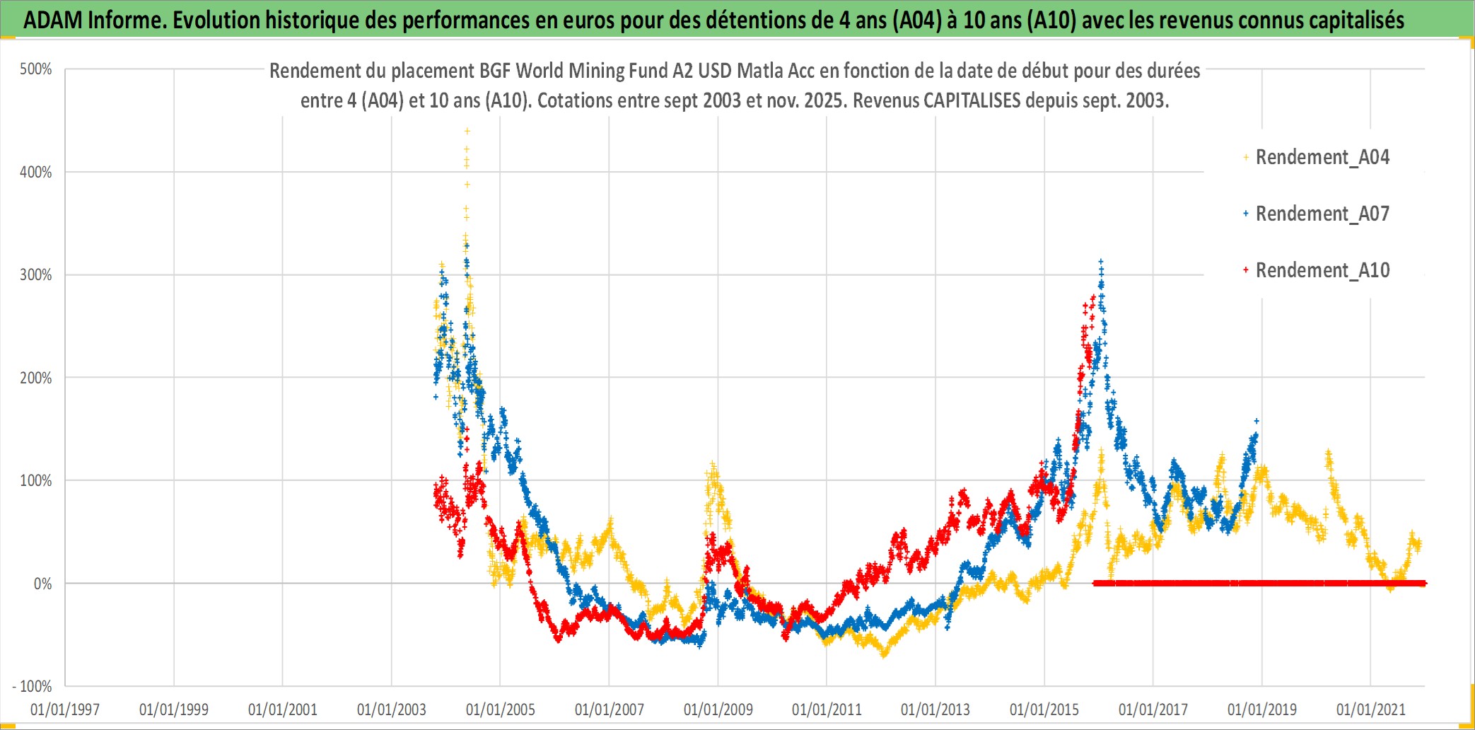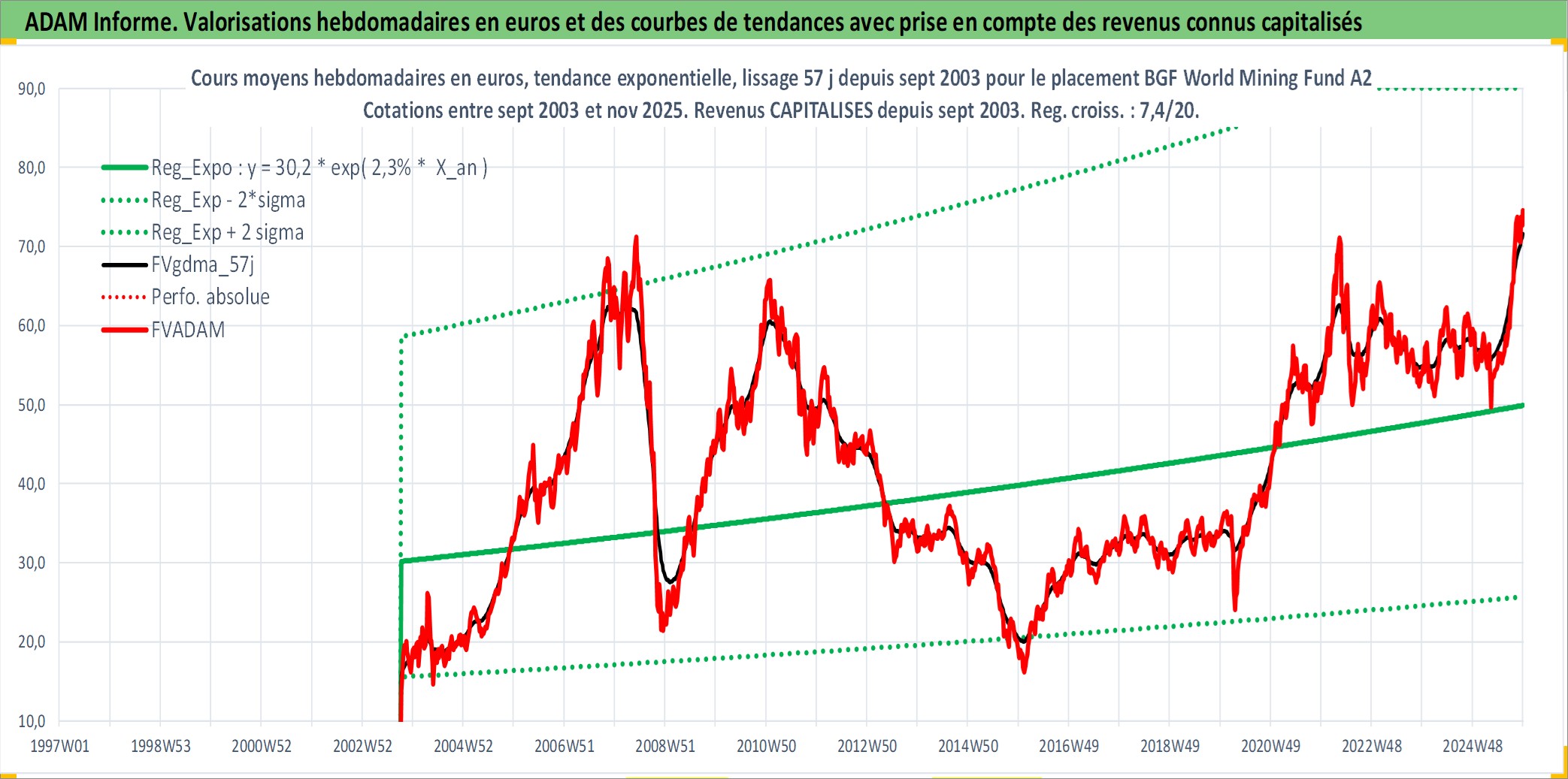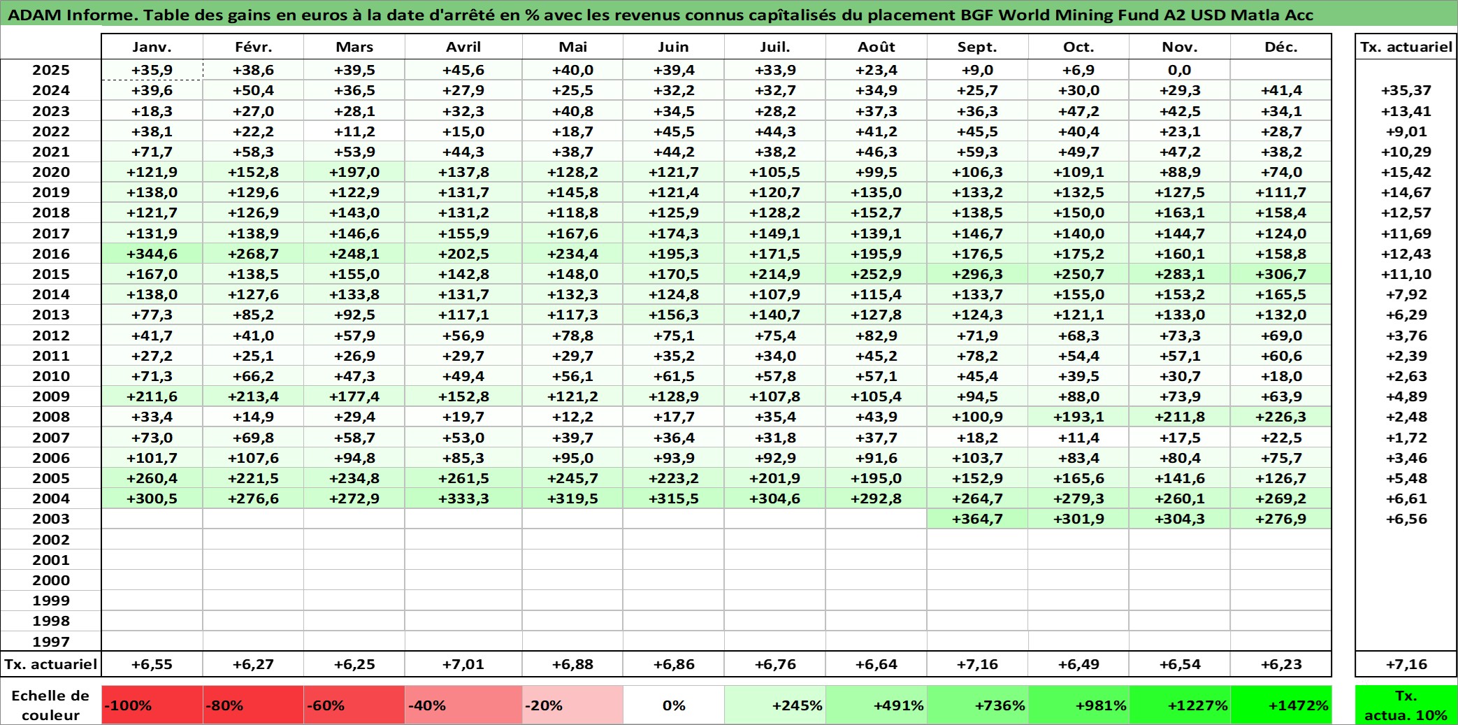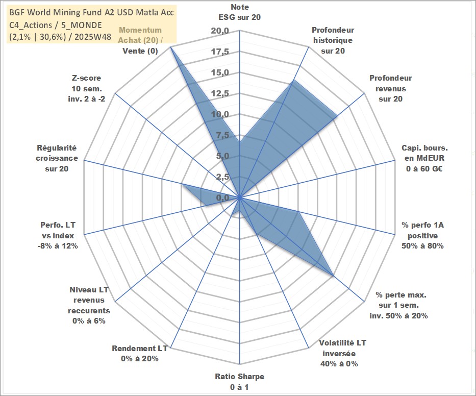 Site dédié aux investisseursPage dédiée sur site financeAnalyse des valorisations hebdomadaires du fonds BGF World Mining Fund A2 USD Matla Acc. Cet actif est cote en USD. Les valorisations sont en contrevaleur EURO et couvrent les semaines 2003W40 a 2025W48. Les revenus de cet actif financier sont pris en compte depuis la semaine 2003W40. La note globale ESG de cet actif est estimee a 6.6 (apres rebasage entre 0 et 20).