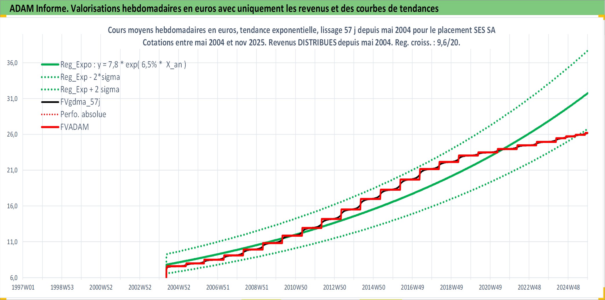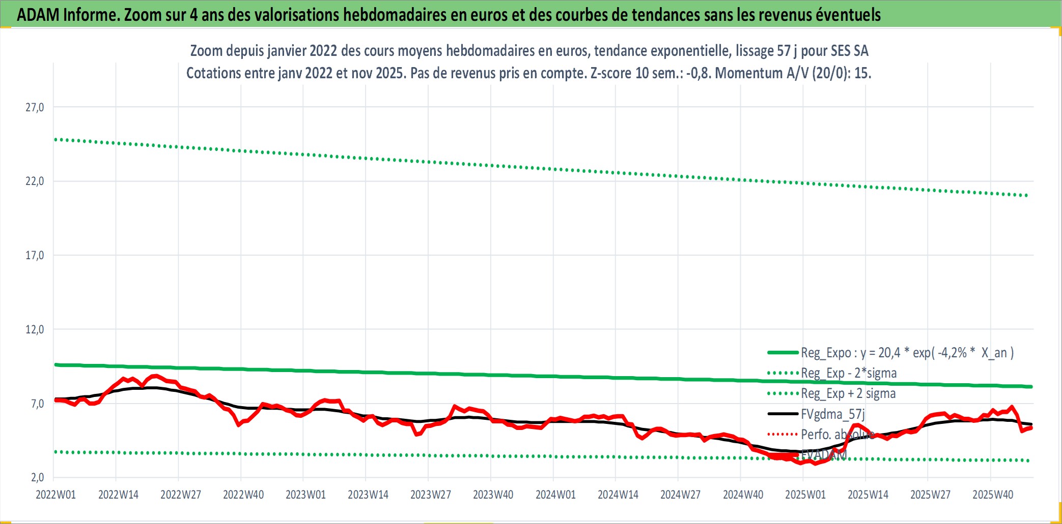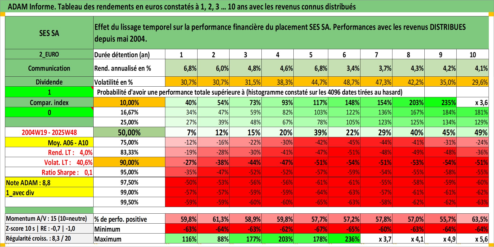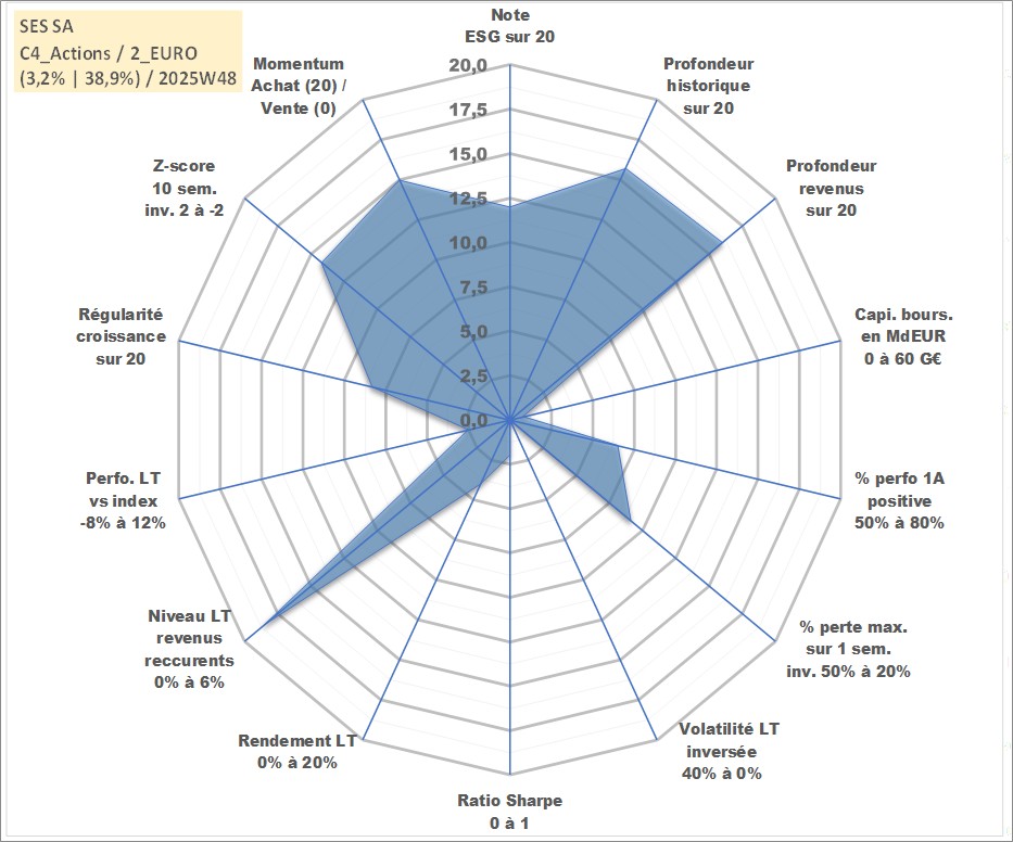 Site dédié aux investisseursPage dédiée sur site financeAnalyse des valorisations hebdomadaires de l'action SES SA. Cet actif est cote en EUR. Les valorisations couvrent les semaines 2004W19 a 2025W48. Les revenus de cet actif financier sont pris en compte depuis la semaine 2004W21. La note globale ESG de cet actif est estimee a 12.0 (apres rebasage entre 0 et 20).