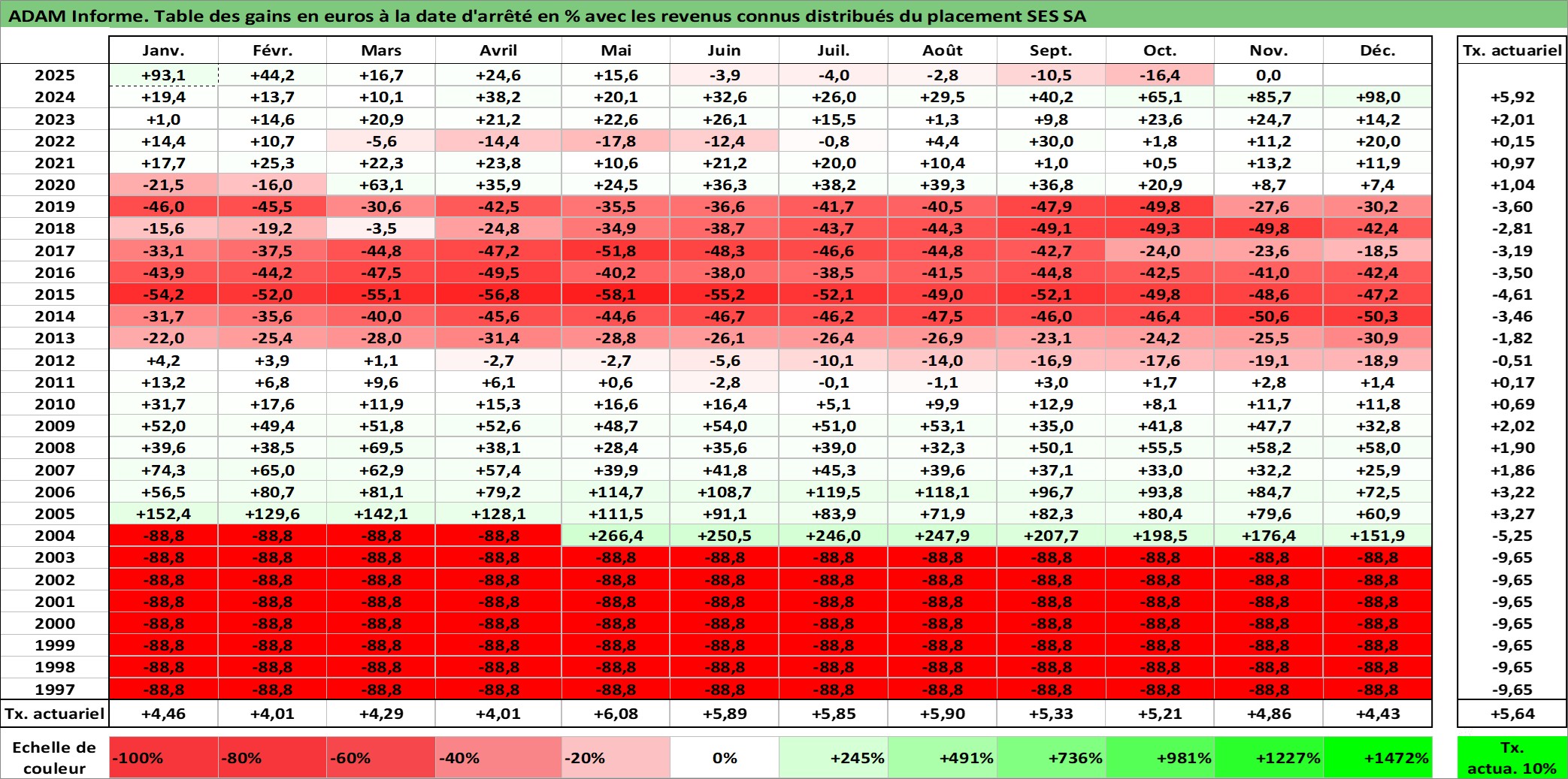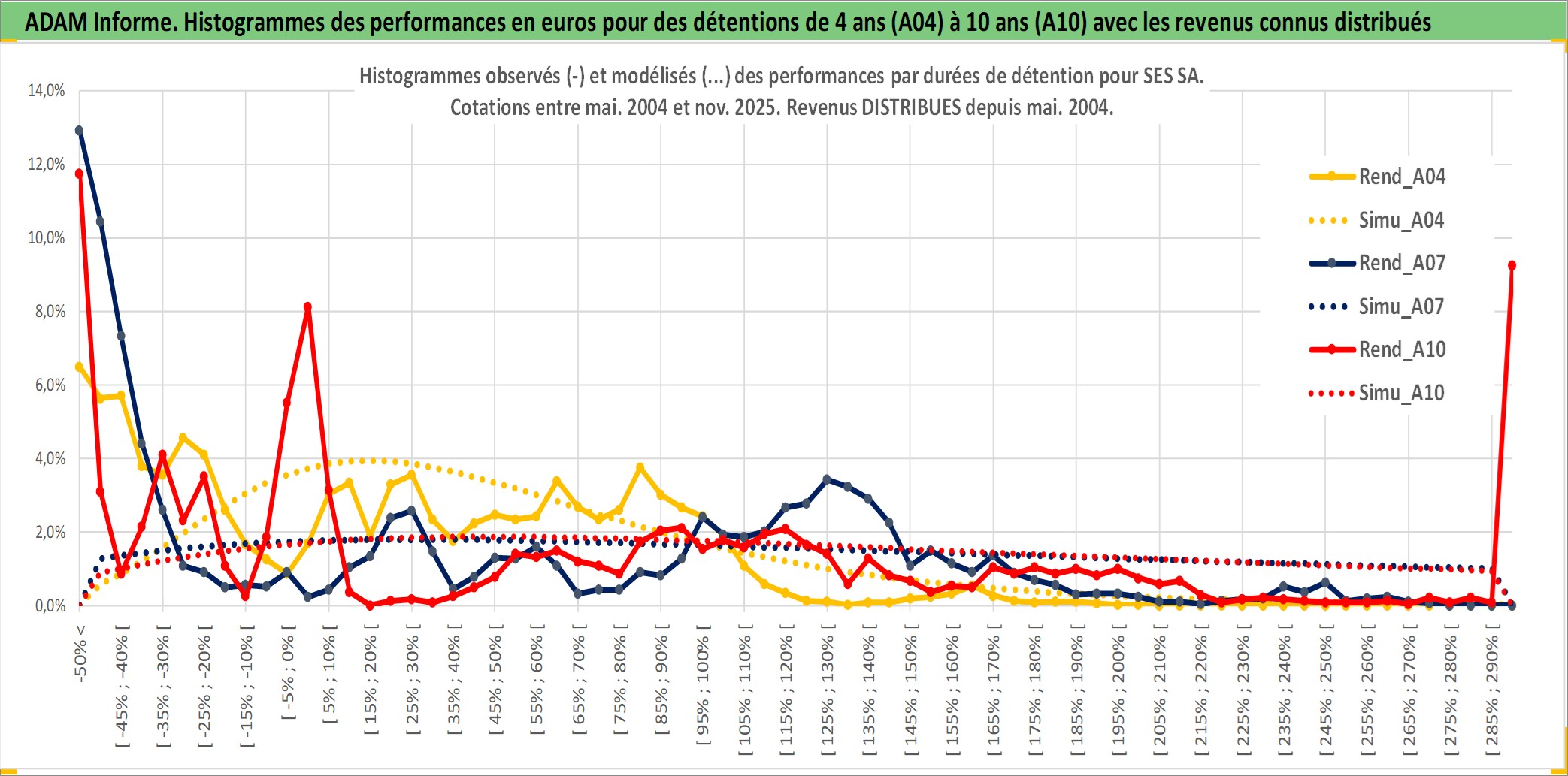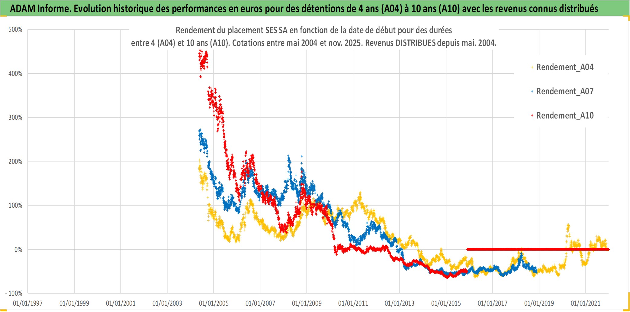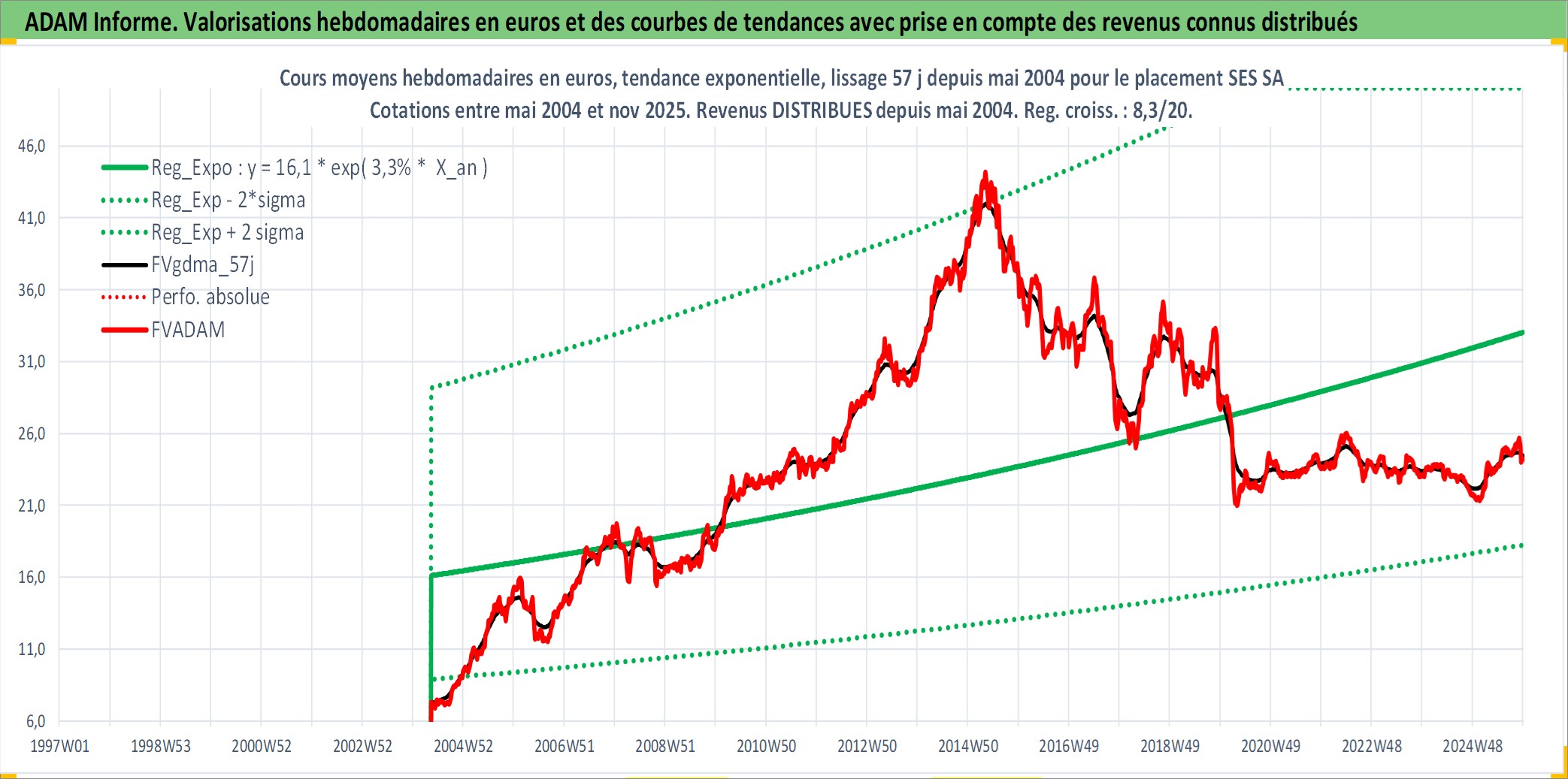 Site dédié aux investisseursPage dédiée sur site financeAnalyse des valorisations hebdomadaires de l'action SES SA. Cet actif est cote en EUR. Les valorisations couvrent les semaines 2004W19 a 2025W48. Les revenus de cet actif financier sont pris en compte depuis la semaine 2004W21. La note globale ESG de cet actif est estimee a 12.0 (apres rebasage entre 0 et 20).