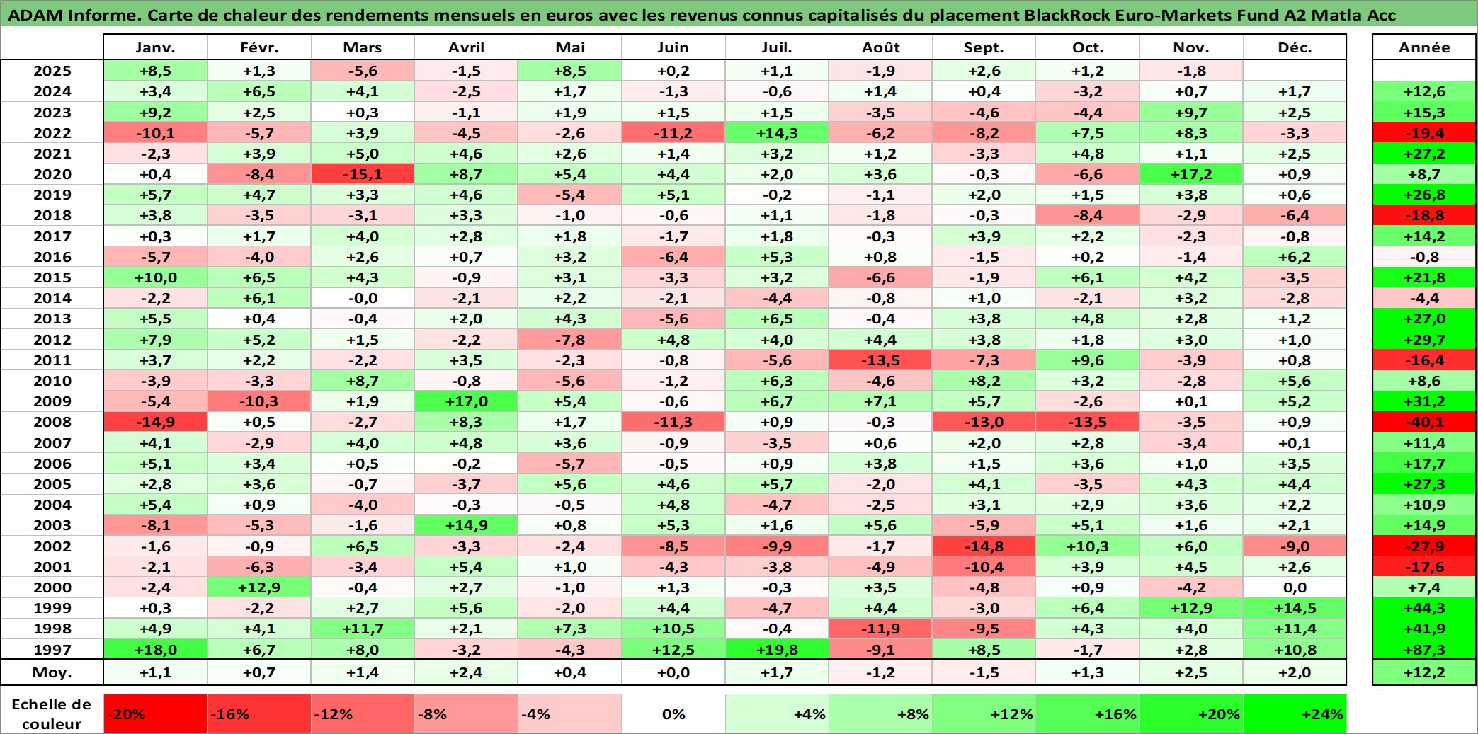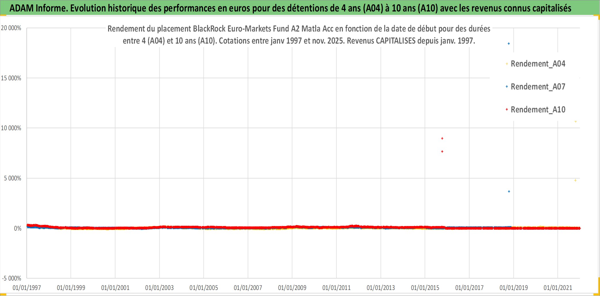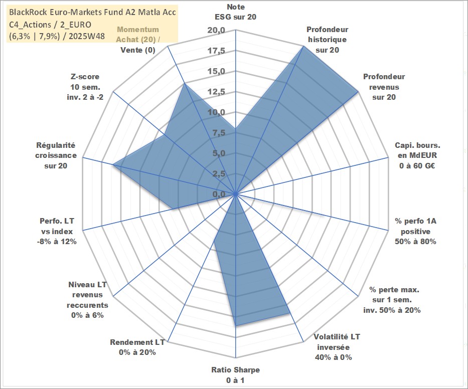 Site dédié aux investisseursPage dédiée sur site financeAnalyse des valorisations hebdomadaires du fonds BlackRock Euro-Markets Fund A2 Matla Acc. Cet actif est cote en EUR. Les valorisations couvrent les semaines 1997W01 a 2025W48. Les revenus de cet actif financier sont pris en compte depuis la semaine 1997W01. La note globale ESG de cet actif est estimee a 7.9 (apres rebasage entre 0 et 20).