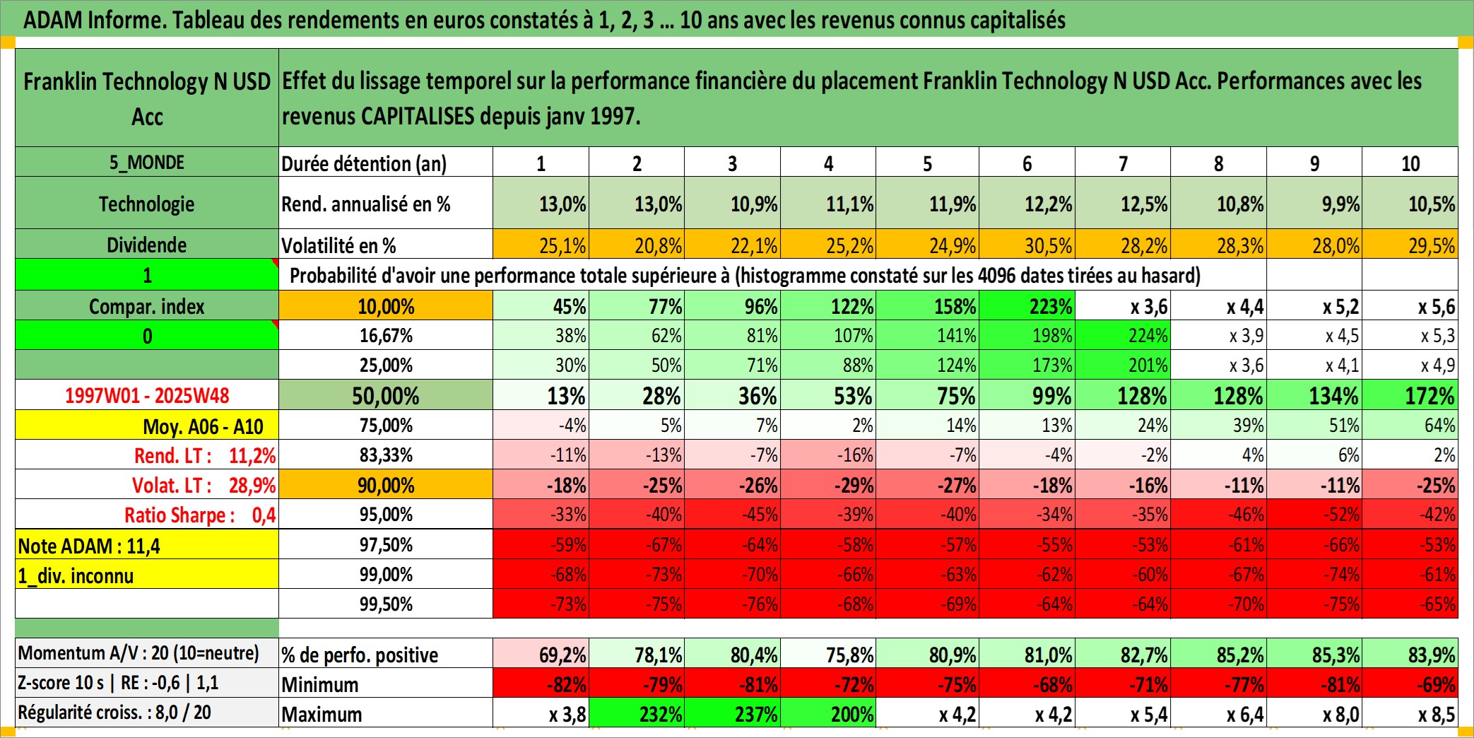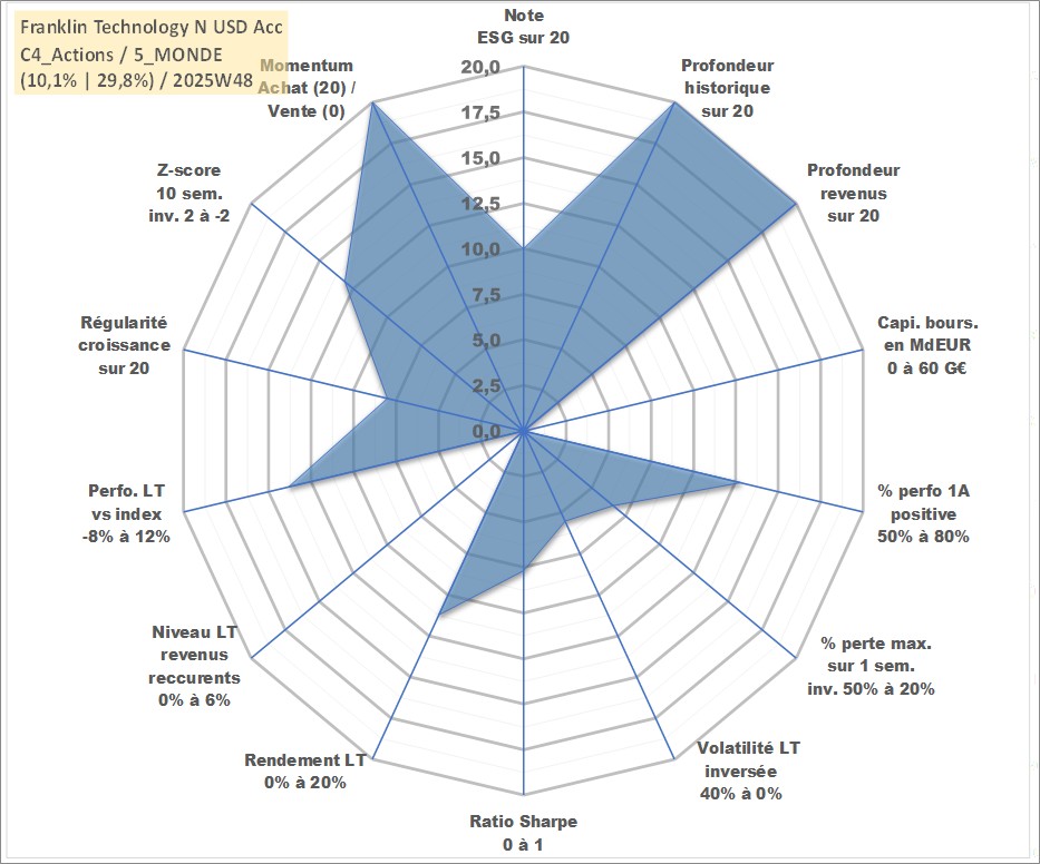 Site dédié aux investisseursPage dédiée sur site financeAnalyse des valorisations hebdomadaires du fonds Franklin Technology N USD Acc. Cet actif est cote en USD. Les valorisations sont en contrevaleur EURO et couvrent les semaines 1997W01 a 2025W48. Les revenus de cet actif financier sont pris en compte depuis la semaine 1997W01. La note globale ESG de cet actif est estimee a 10.0 (apres rebasage entre 0 et 20).