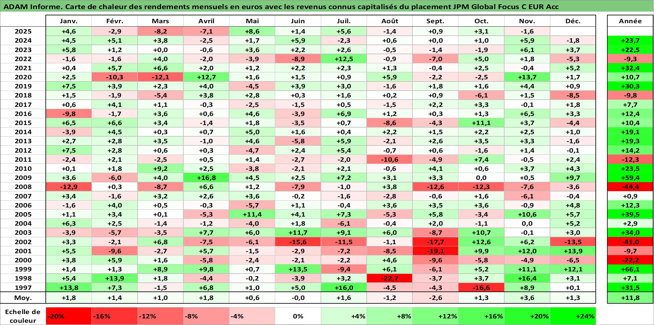 Site dédié aux investisseursPage dédiée sur site financeAnalyse des valorisations hebdomadaires du fonds JPM Global Focus C EUR Acc. Cet actif est cote en EUR. Les valorisations couvrent les semaines 1997W01 a 2025W48. Les revenus de cet actif financier sont pris en compte depuis la semaine 1997W01. La note ESG de cet actif n'est pas connue.
