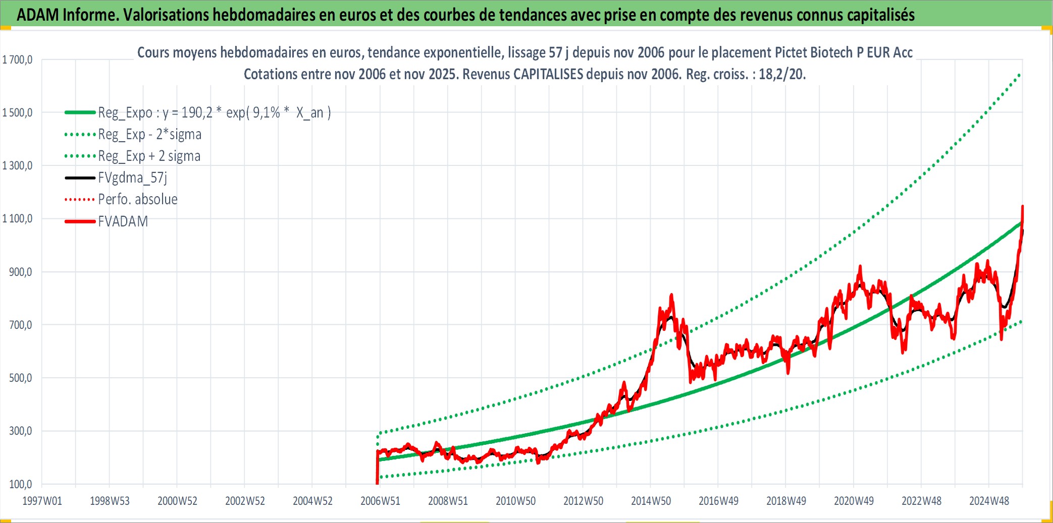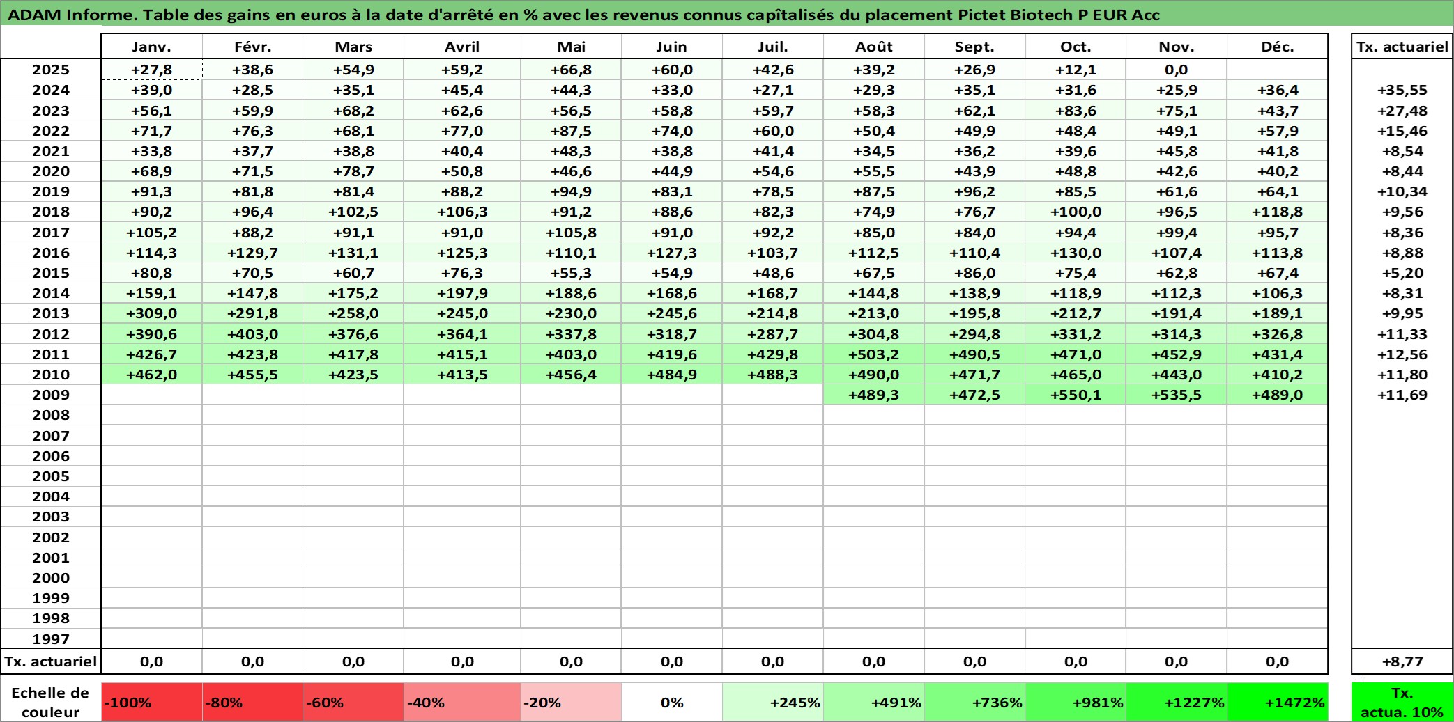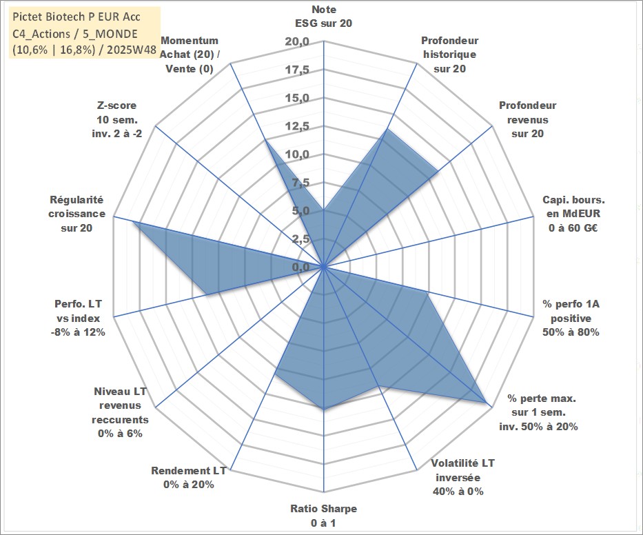 Site dédié aux investisseursPage dédiée sur site financeAnalyse des valorisations hebdomadaires du fonds Pictet Biotech P EUR Acc. Cet actif est cote en EUR. Les valorisations couvrent les semaines 2006W47 a 2025W48. Les revenus de cet actif financier sont pris en compte depuis la semaine 2006W47. La note globale ESG de cet actif est estimee a 5.0 (apres rebasage entre 0 et 20).