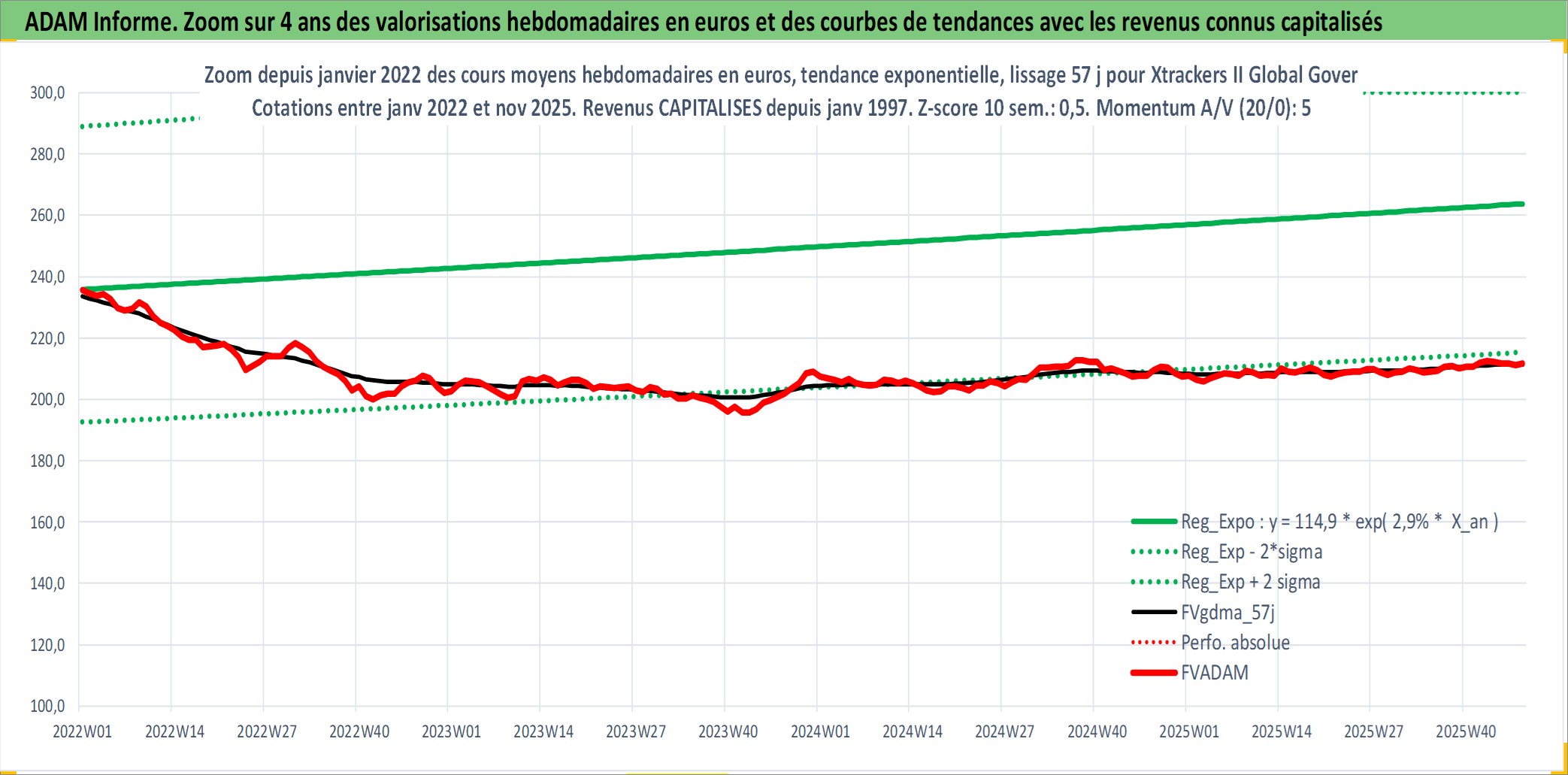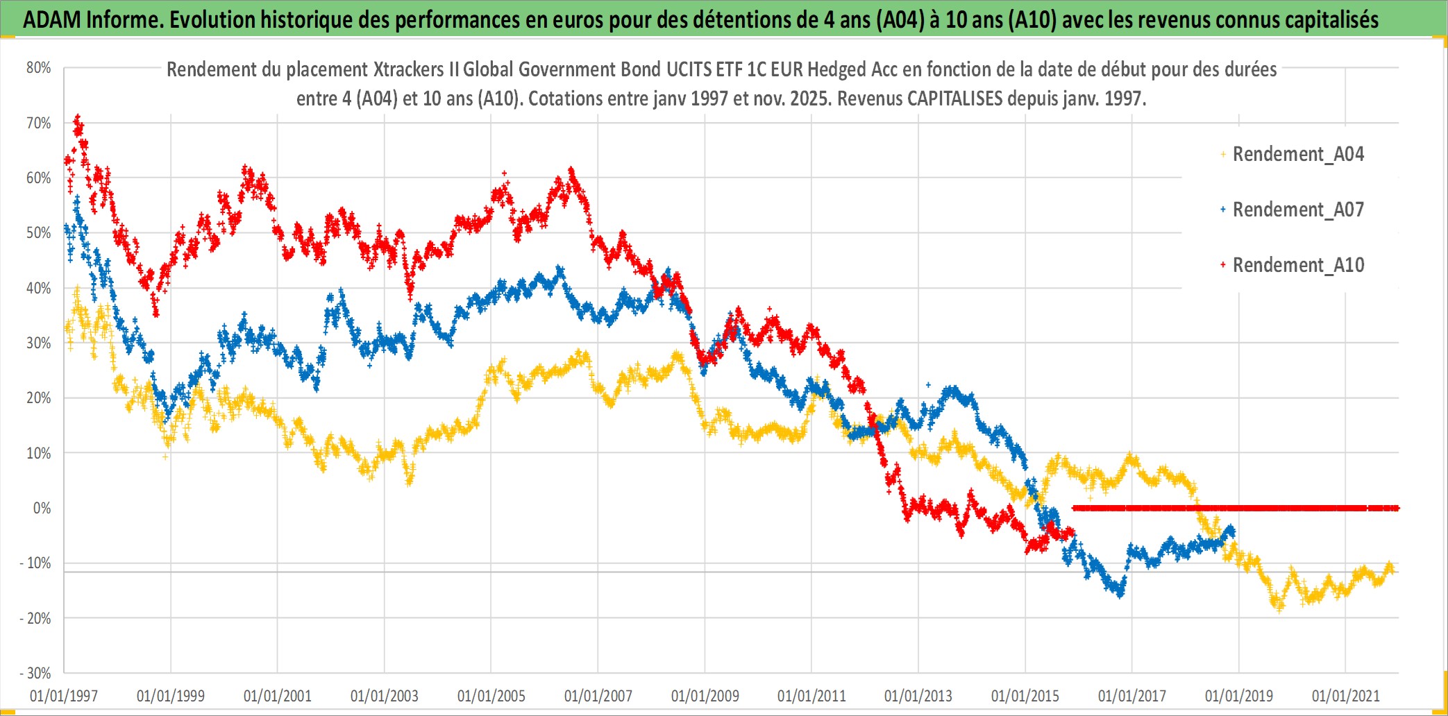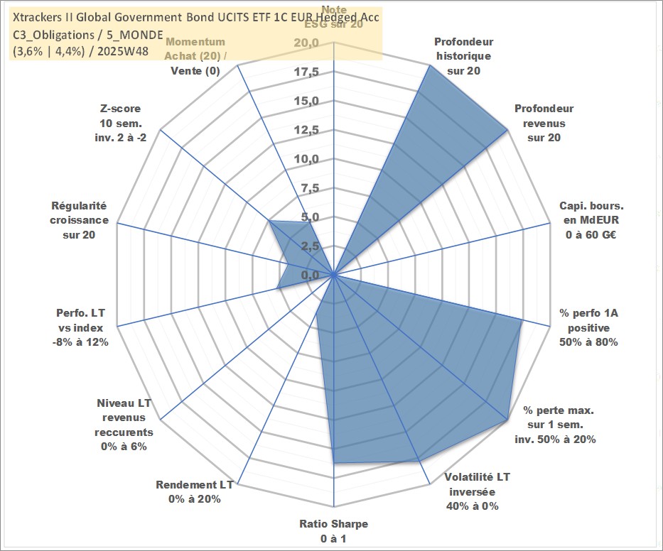 Site dédié aux investisseursPage dédiée sur site financeAnalyse des valorisations hebdomadaires du fonds Xtrackers II Global Government Bond UCITS ETF 1C EUR Hedged Acc. Cet actif est cote en EUR. Les valorisations couvrent les semaines 1997W01 a 2025W48. Les revenus de cet actif financier sont pris en compte depuis la semaine 1997W01. La note ESG de cet actif n'est pas connue.