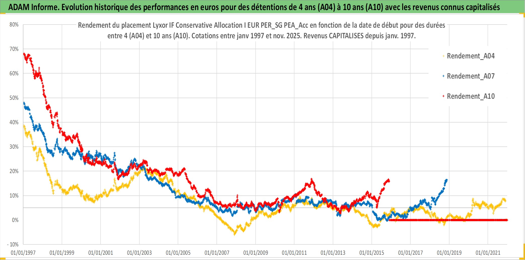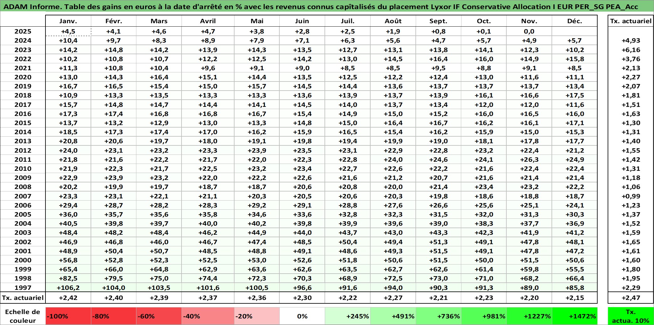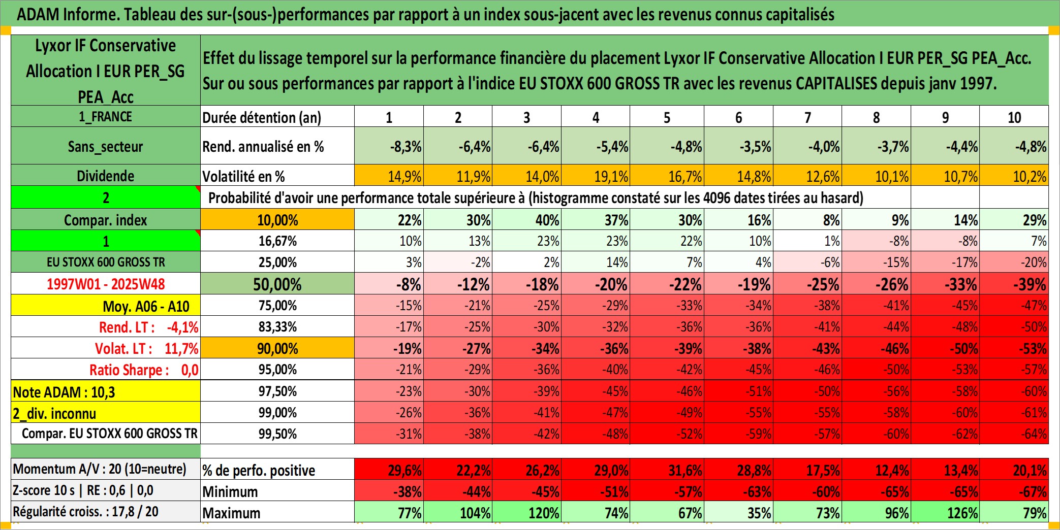 Site dédié aux investisseursPage dédiée sur site financeAnalyse des valorisations hebdomadaires du fonds Lyxor IF Conservative Allocation I EUR PER_SG PEA_Acc. Cet actif est cote en EUR. Les valorisations couvrent les semaines 1997W01 a 2025W48. Les revenus de cet actif financier sont pris en compte depuis la semaine 1997W01. La note ESG de cet actif n'est pas connue.