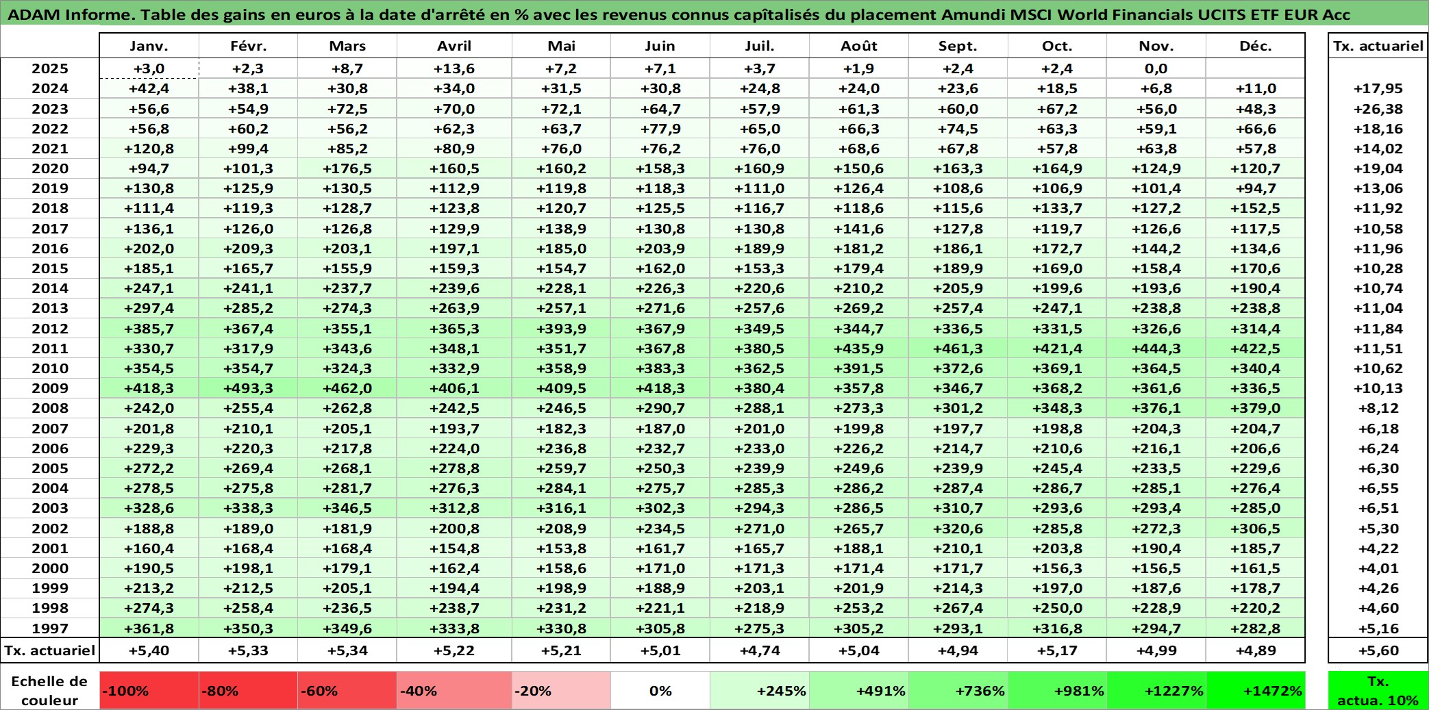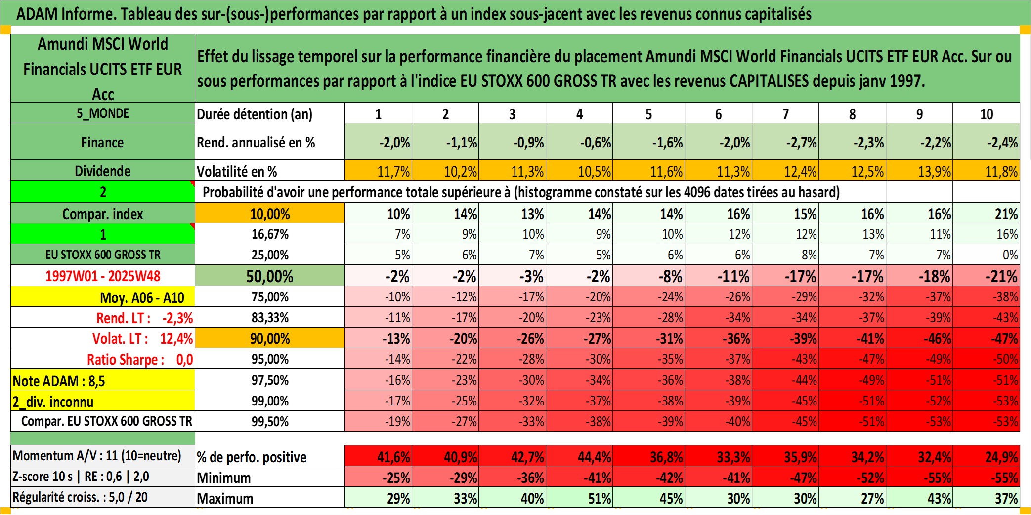 Site dédié aux investisseursPage dédiée sur site financeAnalyse des valorisations hebdomadaires du fonds Amundi MSCI World Financials UCITS ETF EUR Acc. Cet actif est cote en EUR. Les valorisations couvrent les semaines 1997W01 a 2025W48. Les revenus de cet actif financier sont pris en compte depuis la semaine 1997W01. La note ESG de cet actif n'est pas connue.