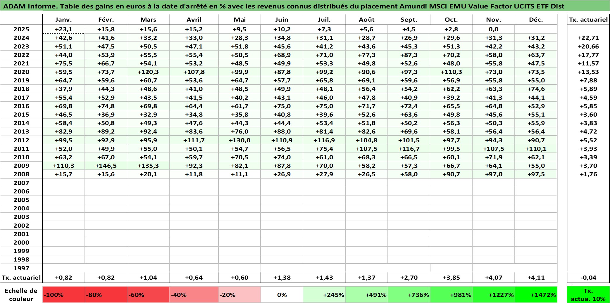Site dédié aux investisseursPage dédiée sur site financeAnalyse des valorisations hebdomadaires du fonds Amundi MSCI EMU Value Factor UCITS ETF Dist. Cet actif est cote en EUR. Les valorisations couvrent les semaines 2008W03 a 2025W48. Les revenus de cet actif financier sont pris en compte depuis la semaine 2024W50. La note ESG de cet actif n'est pas connue.