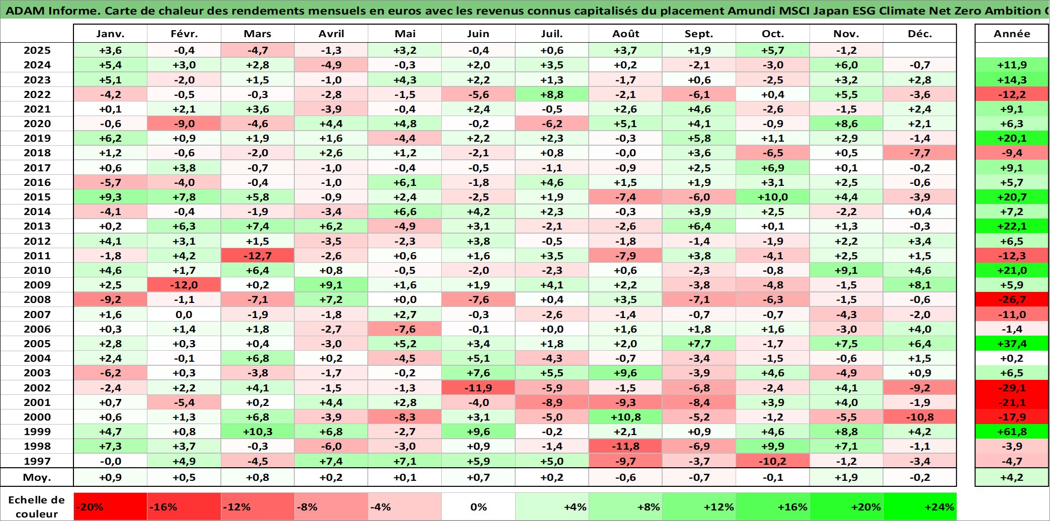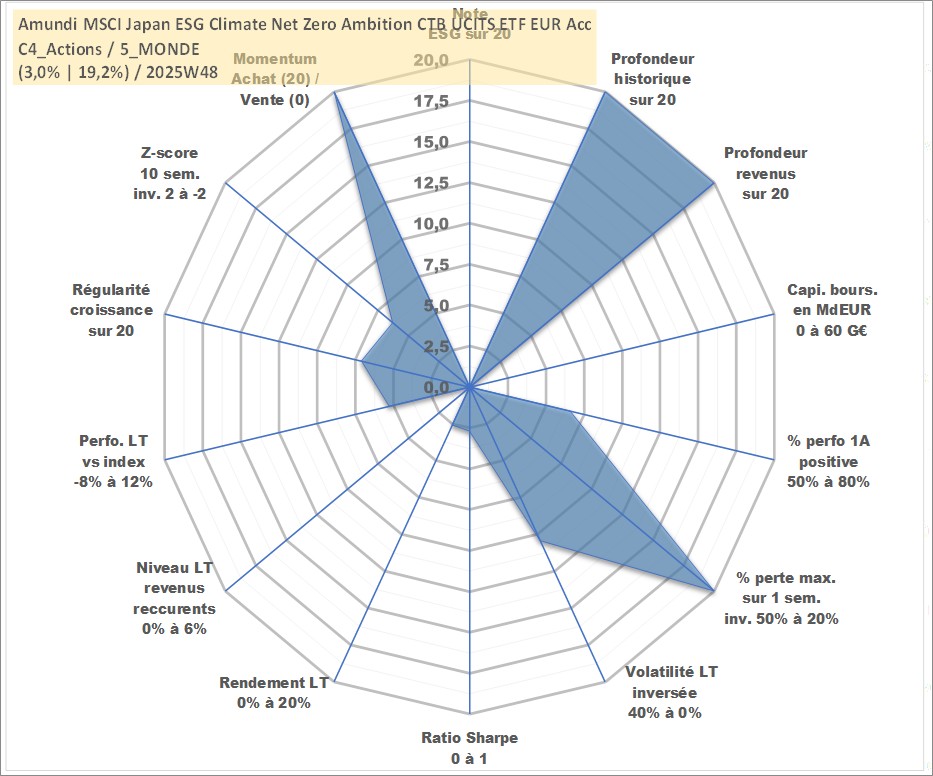 Site dédié aux investisseursPage dédiée sur site financeAnalyse des valorisations hebdomadaires du fonds Amundi MSCI Japan ESG Climate Net Zero Ambition CTB UCITS ETF EUR Acc. Cet actif est cote en EUR. Les valorisations couvrent les semaines 1997W01 a 2025W48. Les revenus de cet actif financier sont pris en compte depuis la semaine 1997W01. La note ESG de cet actif n'est pas connue.