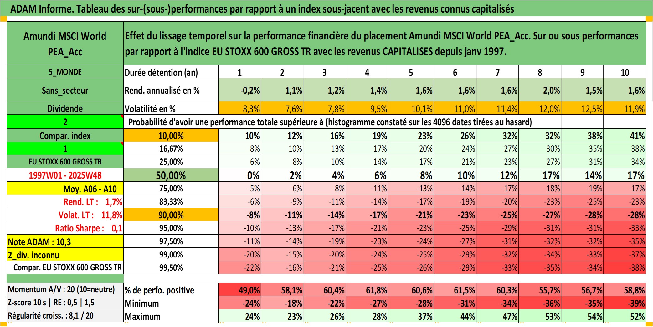 Site dédié aux investisseursPage dédiée sur site financeAnalyse des valorisations hebdomadaires du fonds Amundi MSCI World PEA_Acc. Cet actif est cote en EUR. Les valorisations couvrent les semaines 1997W01 a 2025W48. Les revenus de cet actif financier sont pris en compte depuis la semaine 1997W01. La note ESG de cet actif n'est pas connue.
