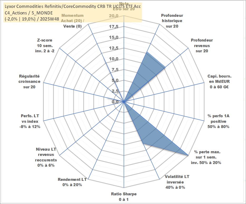 Site dédié aux investisseursPage dédiée sur site financeAnalyse des valorisations hebdomadaires du fonds Lyxor Commodities Refinitiv/CoreCommodity CRB TR UCITS ETF Acc. Cet actif est cote en EUR. Les valorisations couvrent les semaines 2008W01 a 2025W48. Les revenus de cet actif financier sont pris en compte depuis la semaine 2008W01. La note ESG de cet actif n'est pas connue.