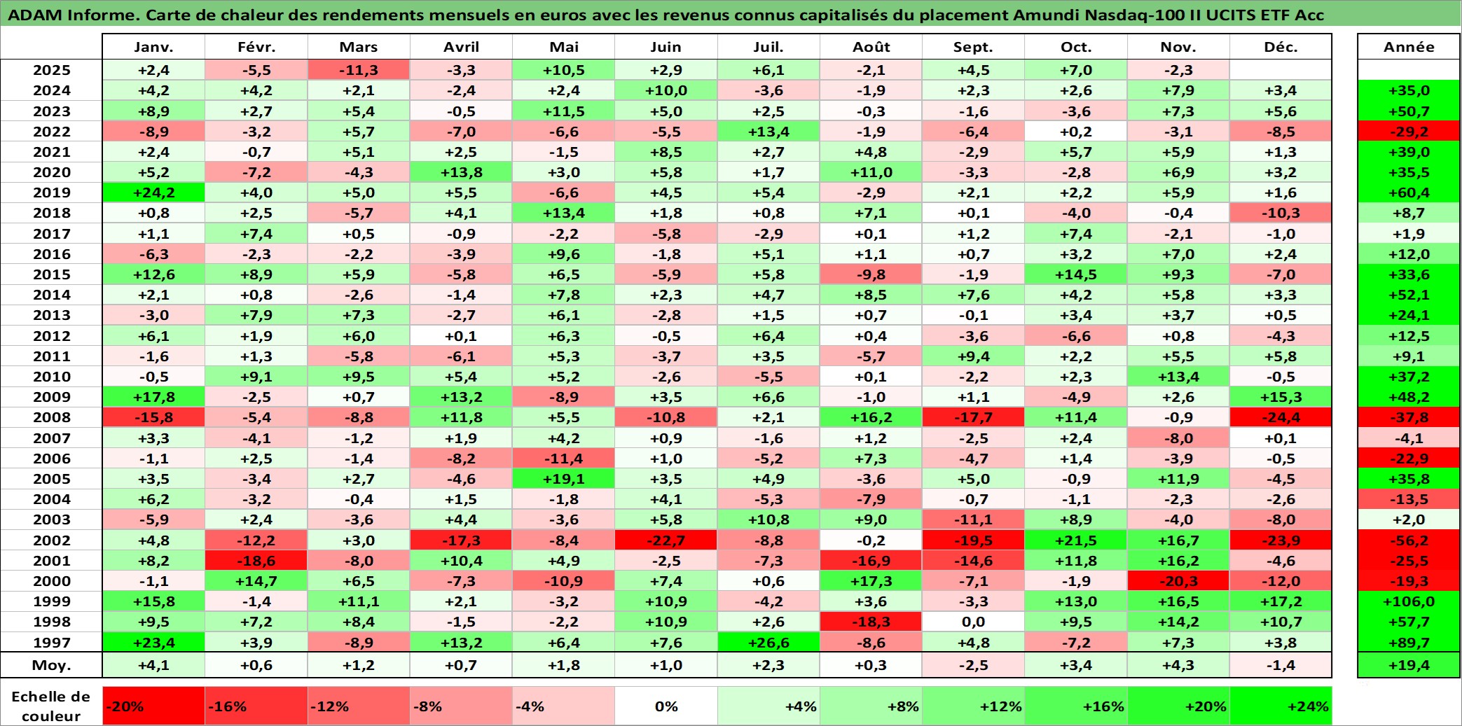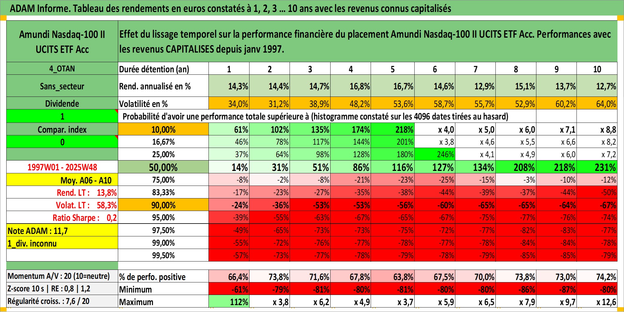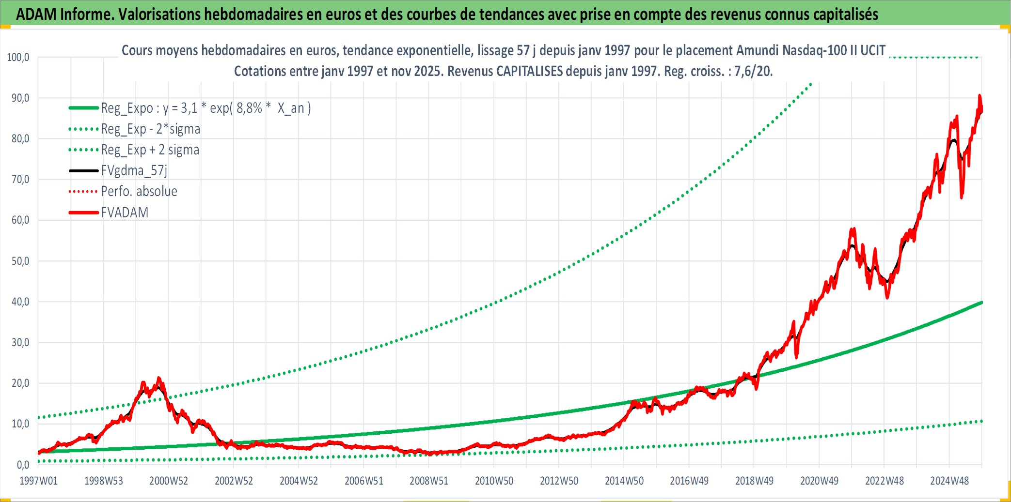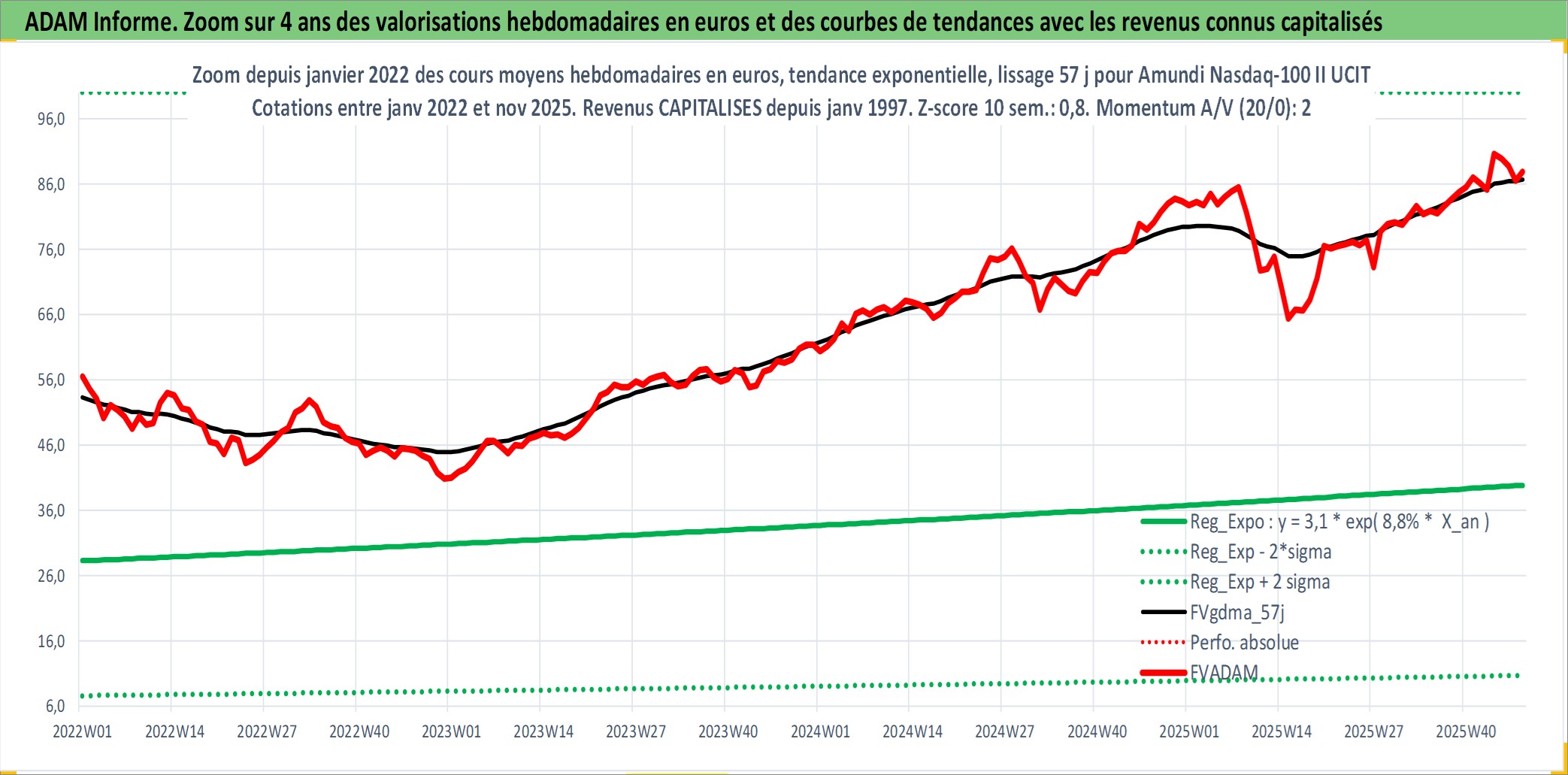 Site dédié aux investisseursPage dédiée sur site financeAnalyse des valorisations hebdomadaires du fonds Amundi Nasdaq-100 II UCITS ETF Acc. Cet actif est cote en USD. Les valorisations sont en contrevaleur EURO et couvrent les semaines 1997W01 a 2025W48. Les revenus de cet actif financier sont pris en compte depuis la semaine 1997W01. La note ESG de cet actif n'est pas connue.