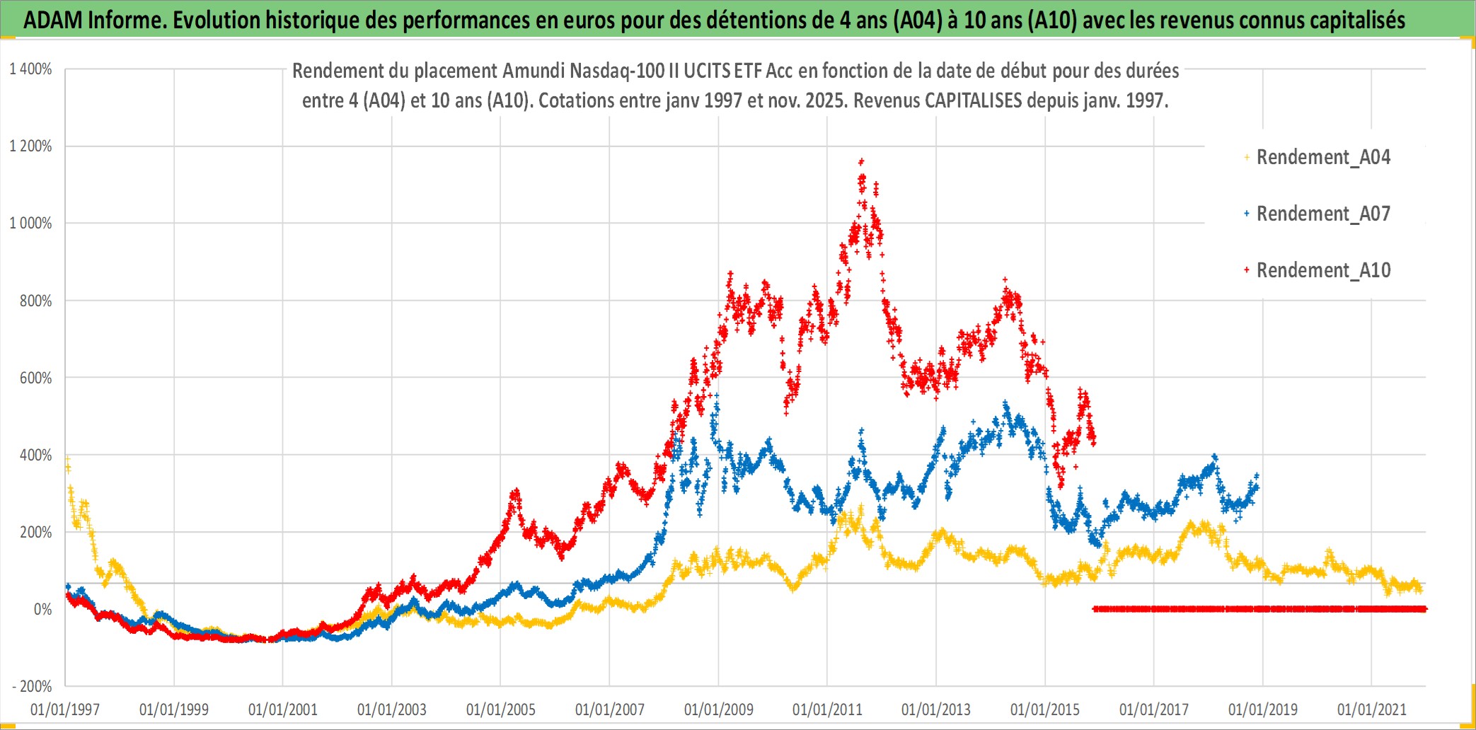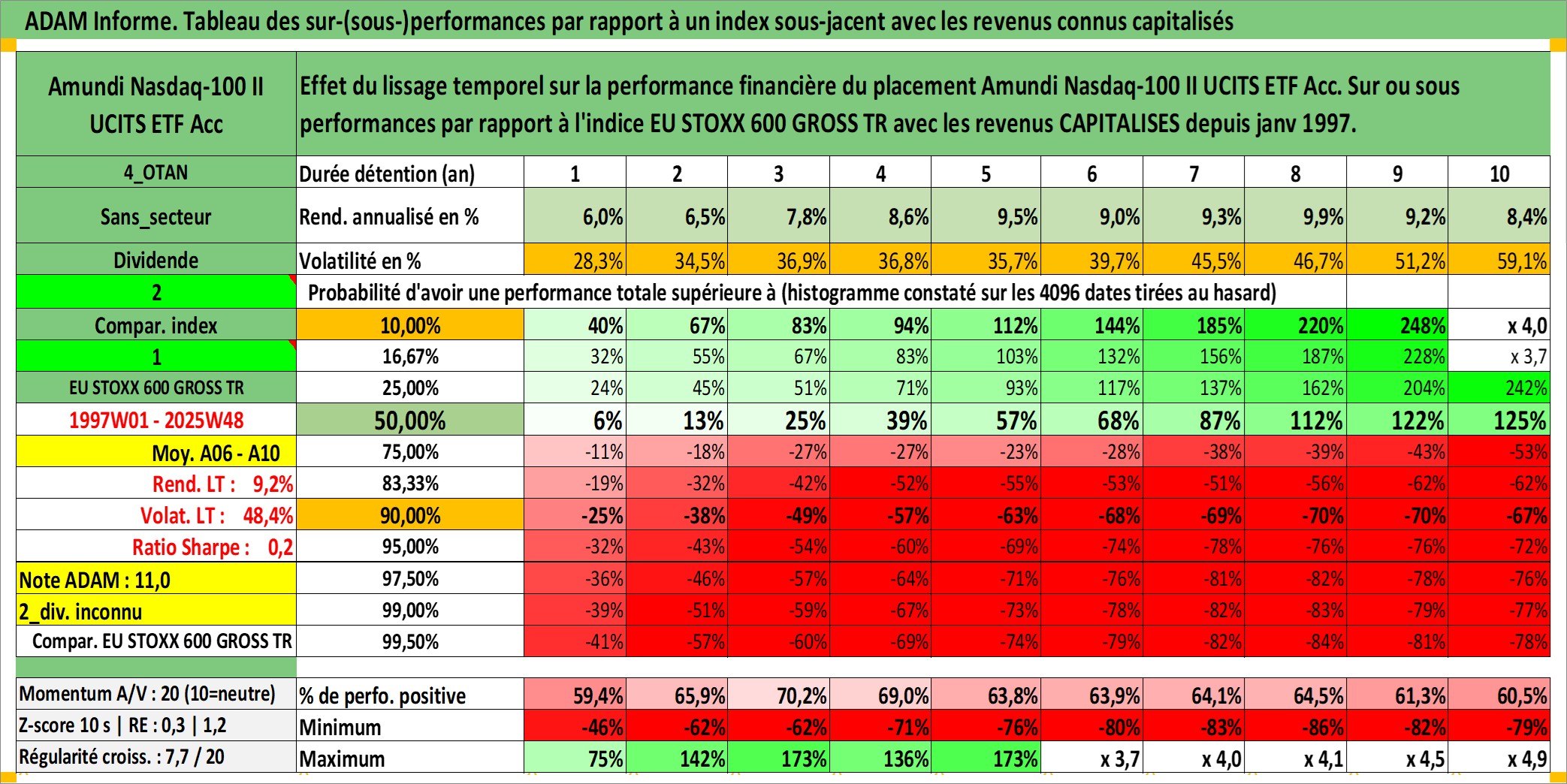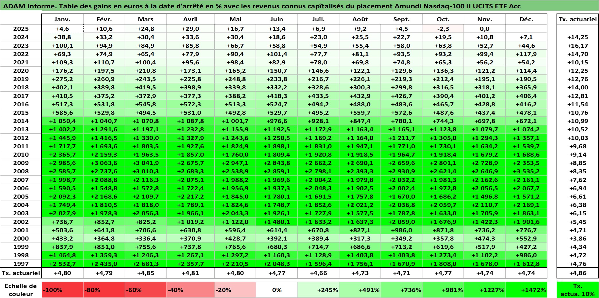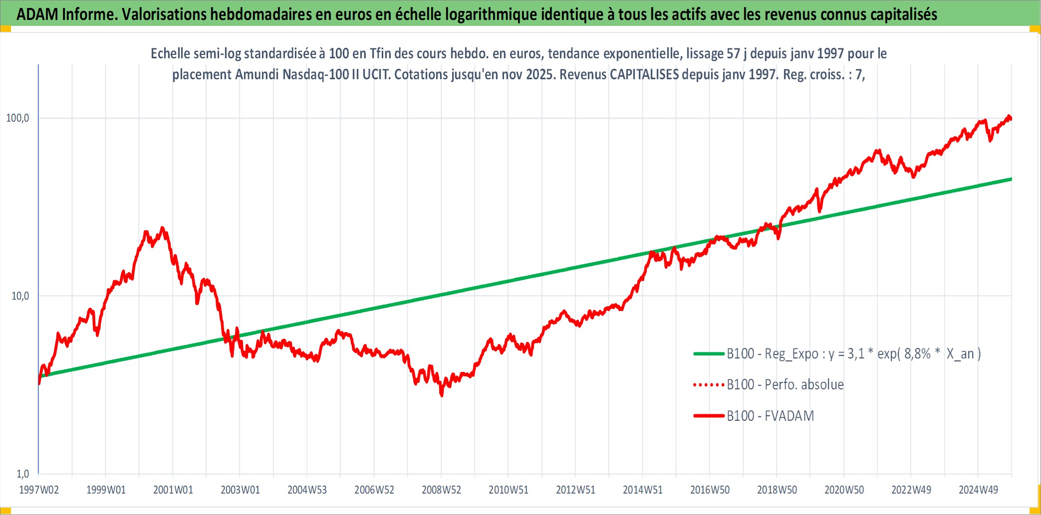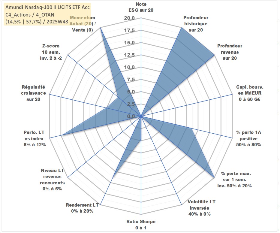 Site dédié aux investisseursPage dédiée sur site financeAnalyse des valorisations hebdomadaires du fonds Amundi Nasdaq-100 II UCITS ETF Acc. Cet actif est cote en USD. Les valorisations sont en contrevaleur EURO et couvrent les semaines 1997W01 a 2025W48. Les revenus de cet actif financier sont pris en compte depuis la semaine 1997W01. La note ESG de cet actif n'est pas connue.
