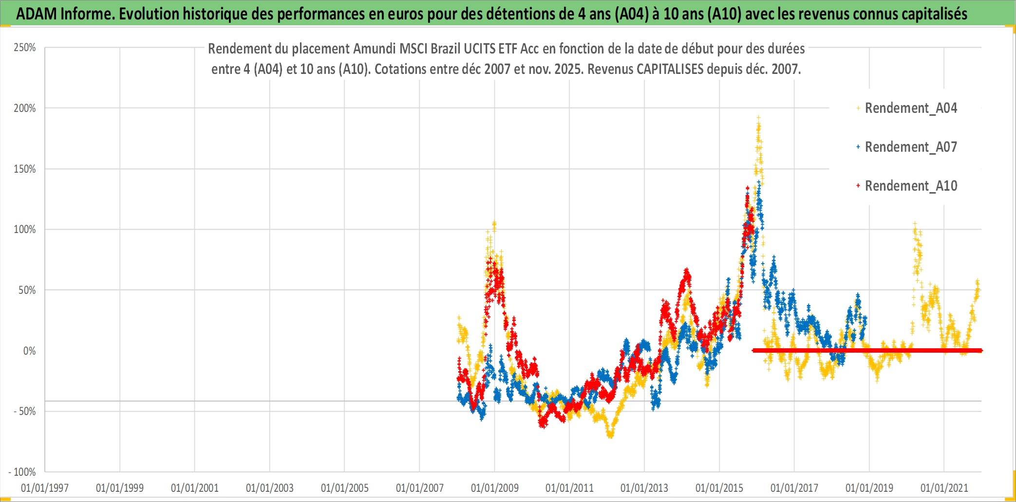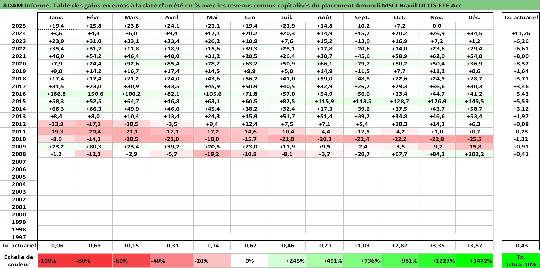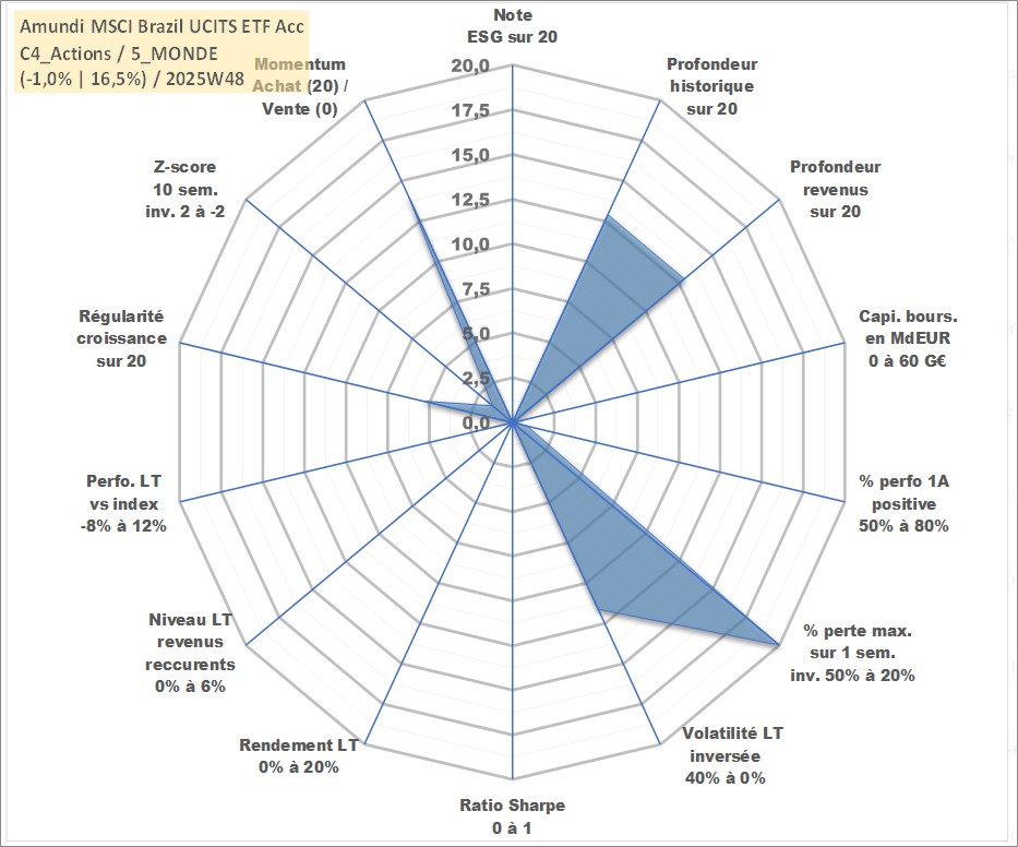 Site dédié aux investisseursPage dédiée sur site financeAnalyse des valorisations hebdomadaires du fonds Amundi MSCI Brazil UCITS ETF Acc. Cet actif est cote en EUR. Les valorisations couvrent les semaines 2008W01 a 2025W48. Les revenus de cet actif financier sont pris en compte depuis la semaine 2008W01. La note ESG de cet actif n'est pas connue.