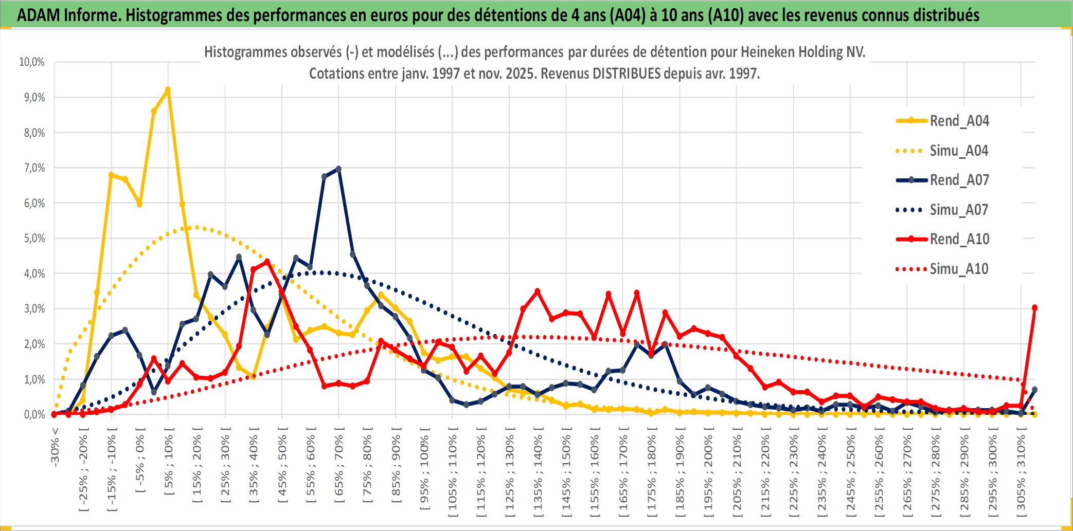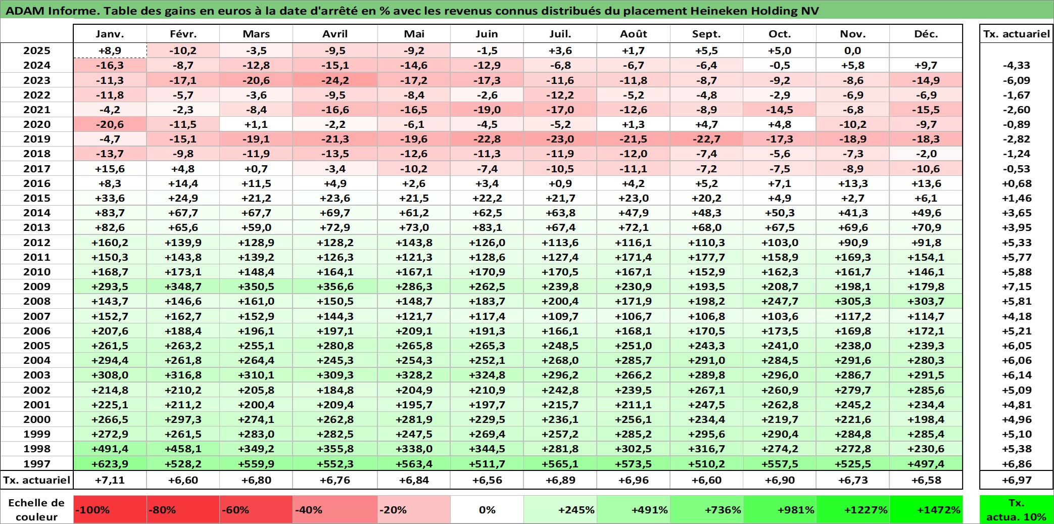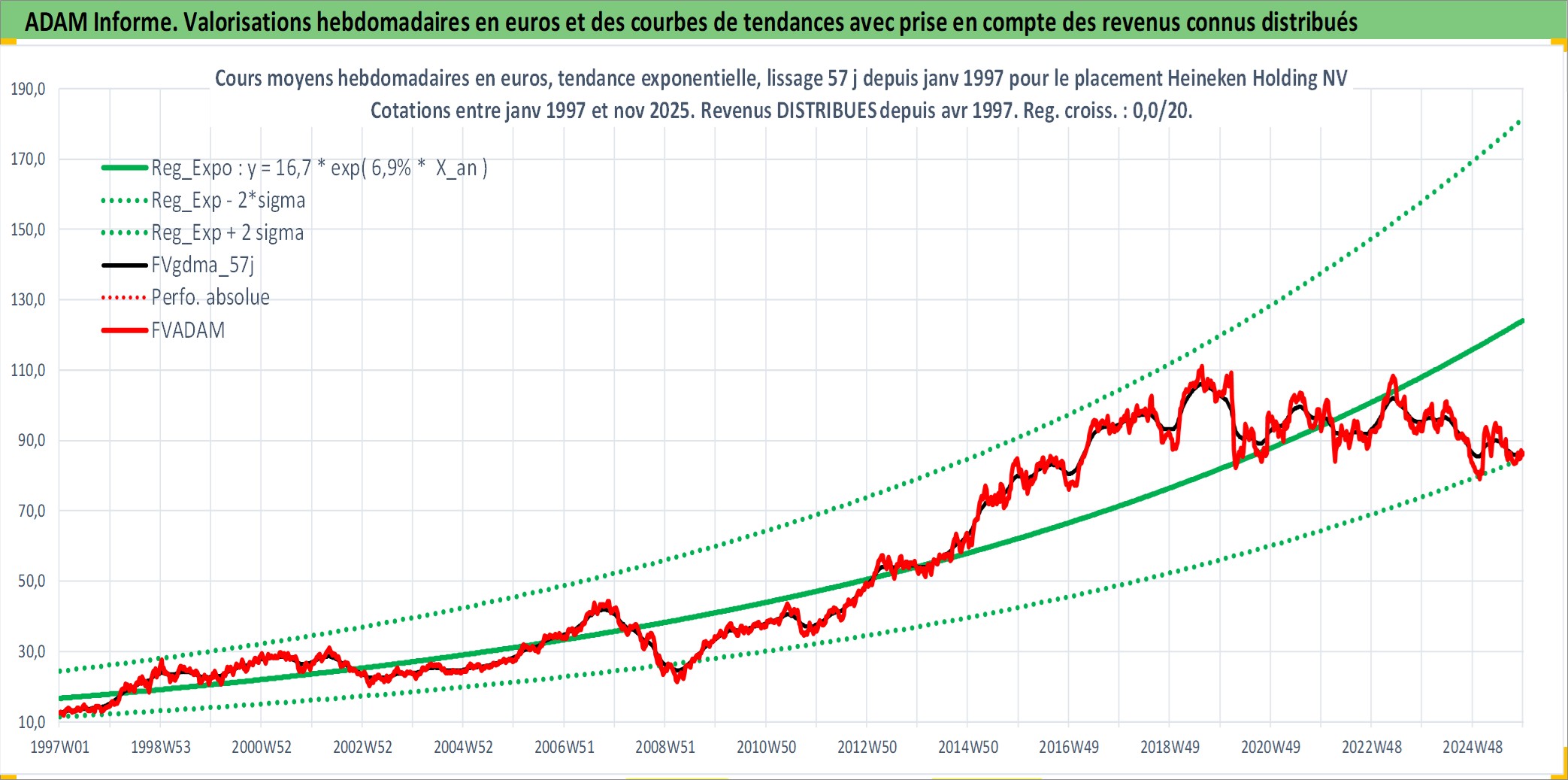 Site dédié aux investisseursPage dédiée sur site financeAnalyse des valorisations hebdomadaires de l'action Heineken Holding NV. Cet actif est cote en EUR. Les valorisations couvrent les semaines 1997W01 a 2025W48. Les revenus de cet actif financier sont pris en compte depuis la semaine 1997W17. La note globale ESG de cet actif est estimee a 10.0 (apres rebasage entre 0 et 20).