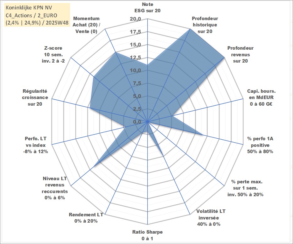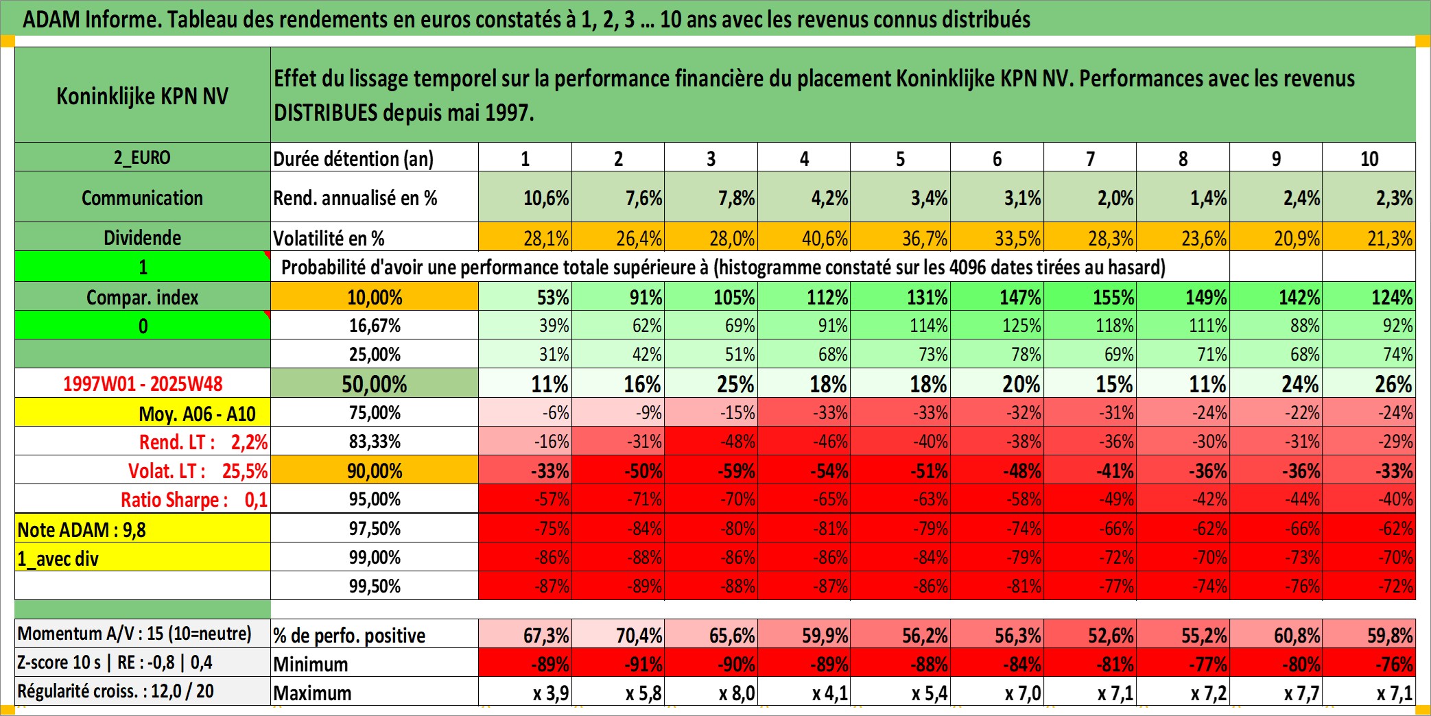 Site dédié aux investisseursPage dédiée sur site financeAnalyse des valorisations hebdomadaires de l'action Koninklijke KPN NV. Cet actif est cote en EUR. Les valorisations couvrent les semaines 1997W01 a 2025W48. Les revenus de cet actif financier sont pris en compte depuis la semaine 1997W19. La note globale ESG de cet actif est estimee a 11.0 (apres rebasage entre 0 et 20).