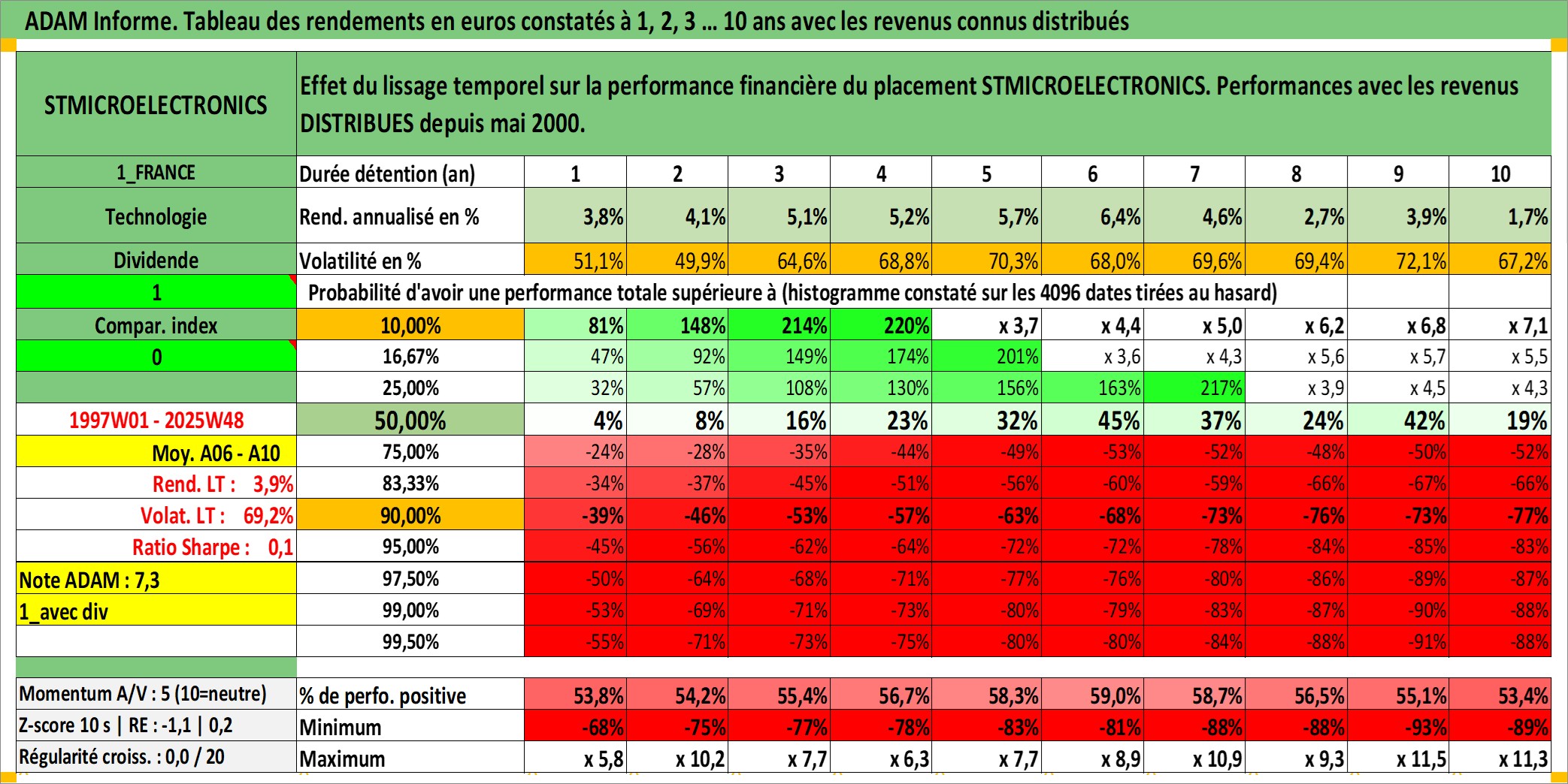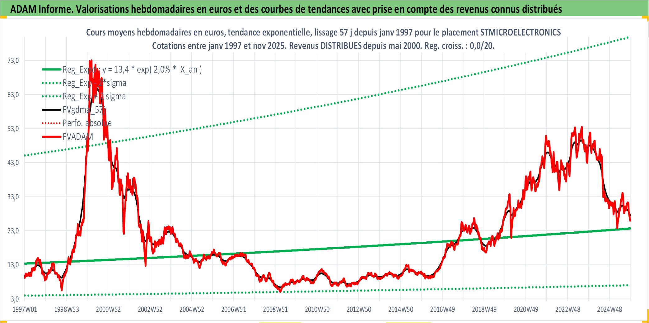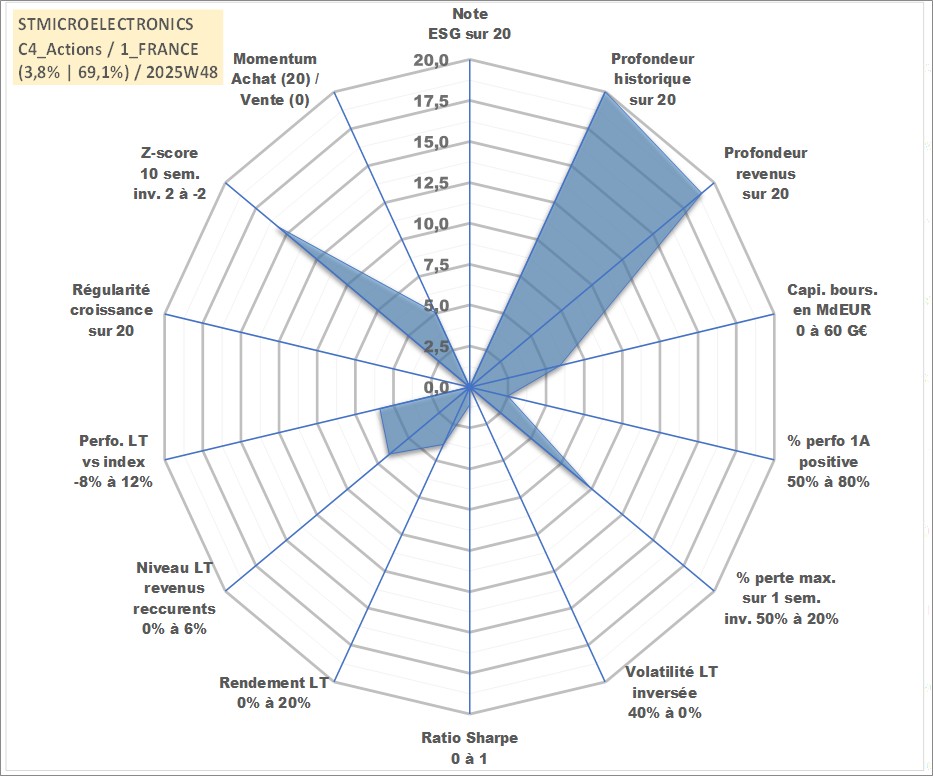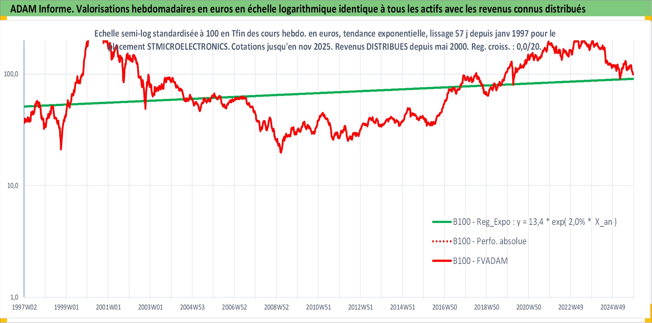 Site dédié aux investisseursPage dédiée sur site financeAnalyse des valorisations hebdomadaires de l'action STMICROELECTRONICS. Cet actif est cote en EUR. Les valorisations couvrent les semaines 1997W01 a 2025W48. Les revenus de cet actif financier sont pris en compte depuis la semaine 2000W18. La note ESG de cet actif n'est pas connue.