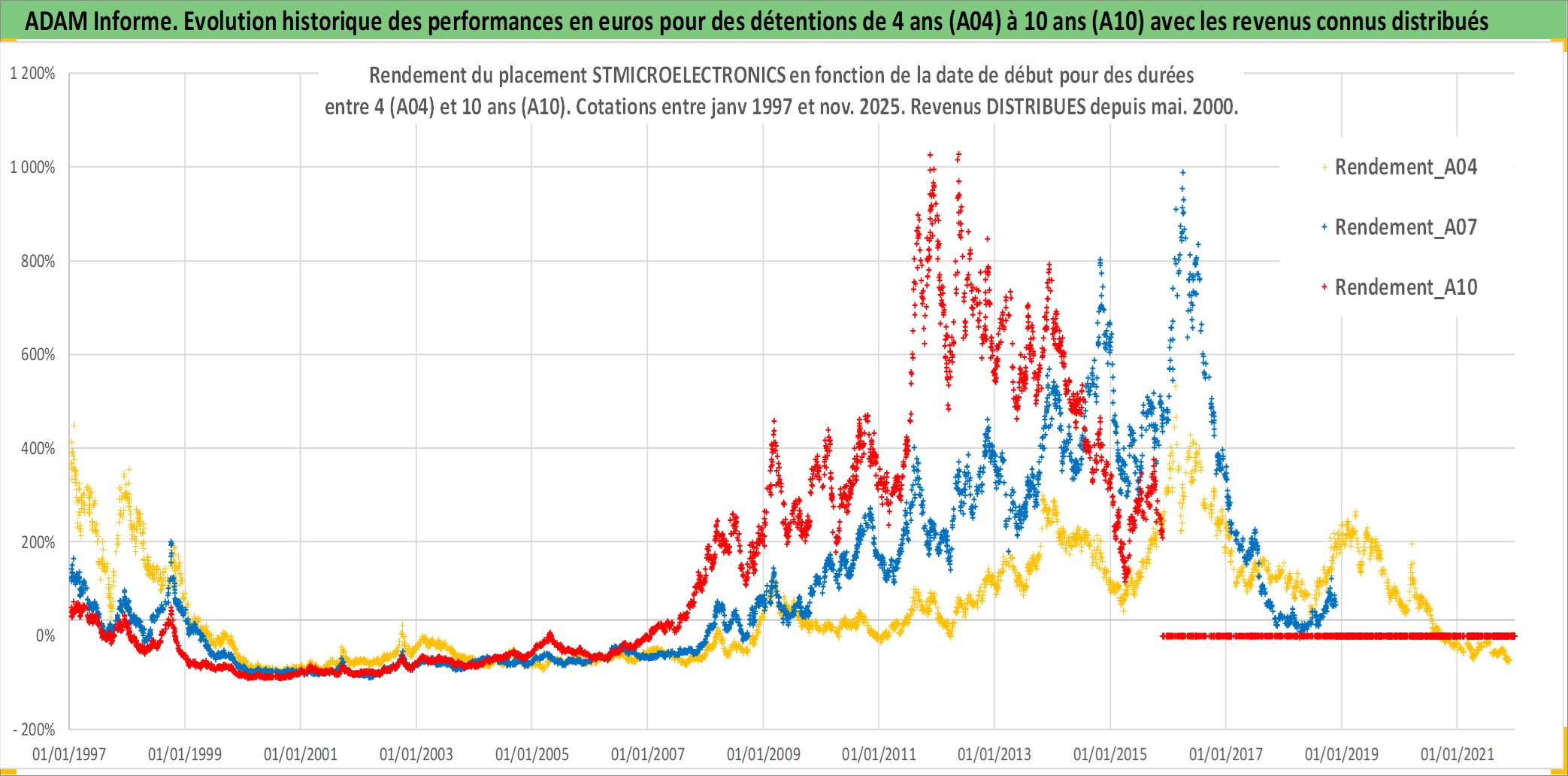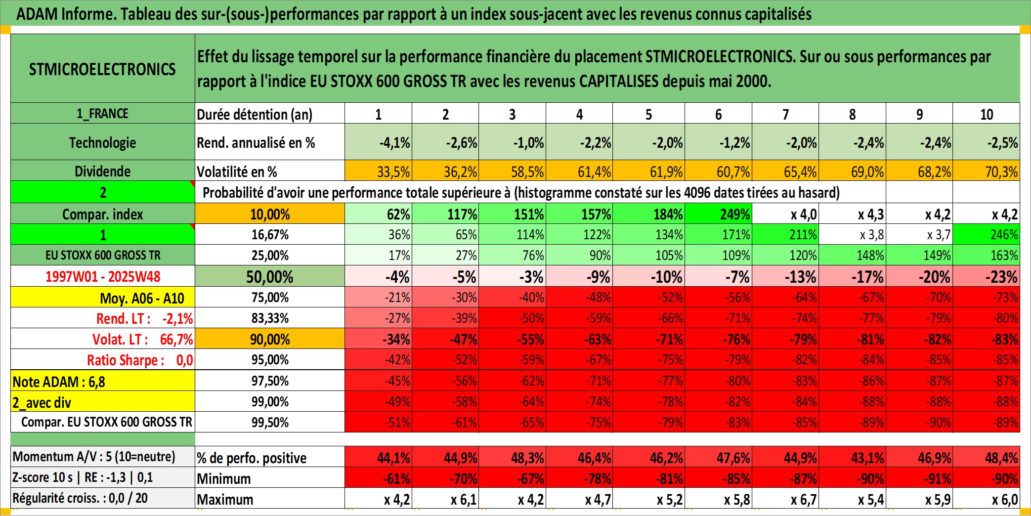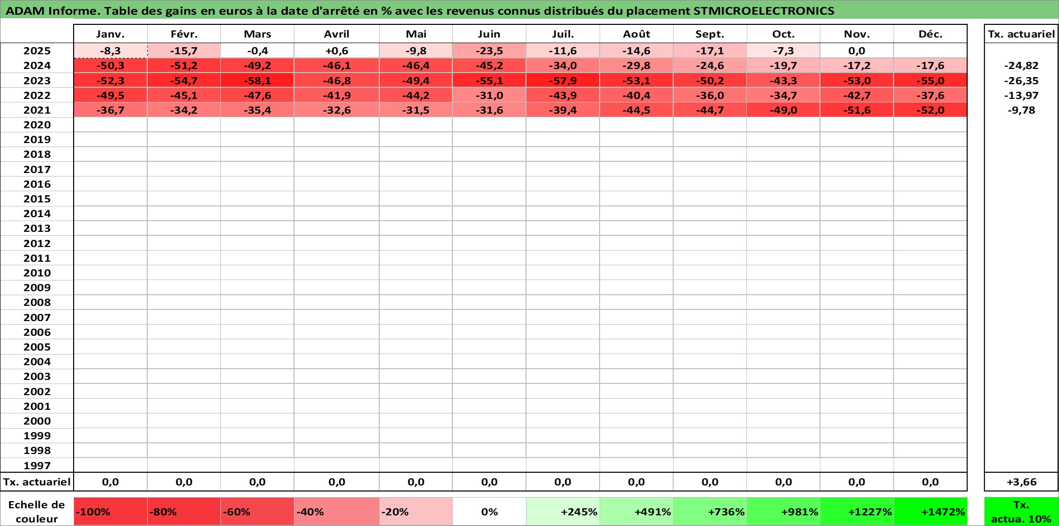 Site dédié aux investisseursPage dédiée sur site financeAnalyse des valorisations hebdomadaires de l'action STMICROELECTRONICS. Cet actif est cote en EUR. Les valorisations couvrent les semaines 1997W01 a 2025W48. Les revenus de cet actif financier sont pris en compte depuis la semaine 2000W18. La note ESG de cet actif n'est pas connue.