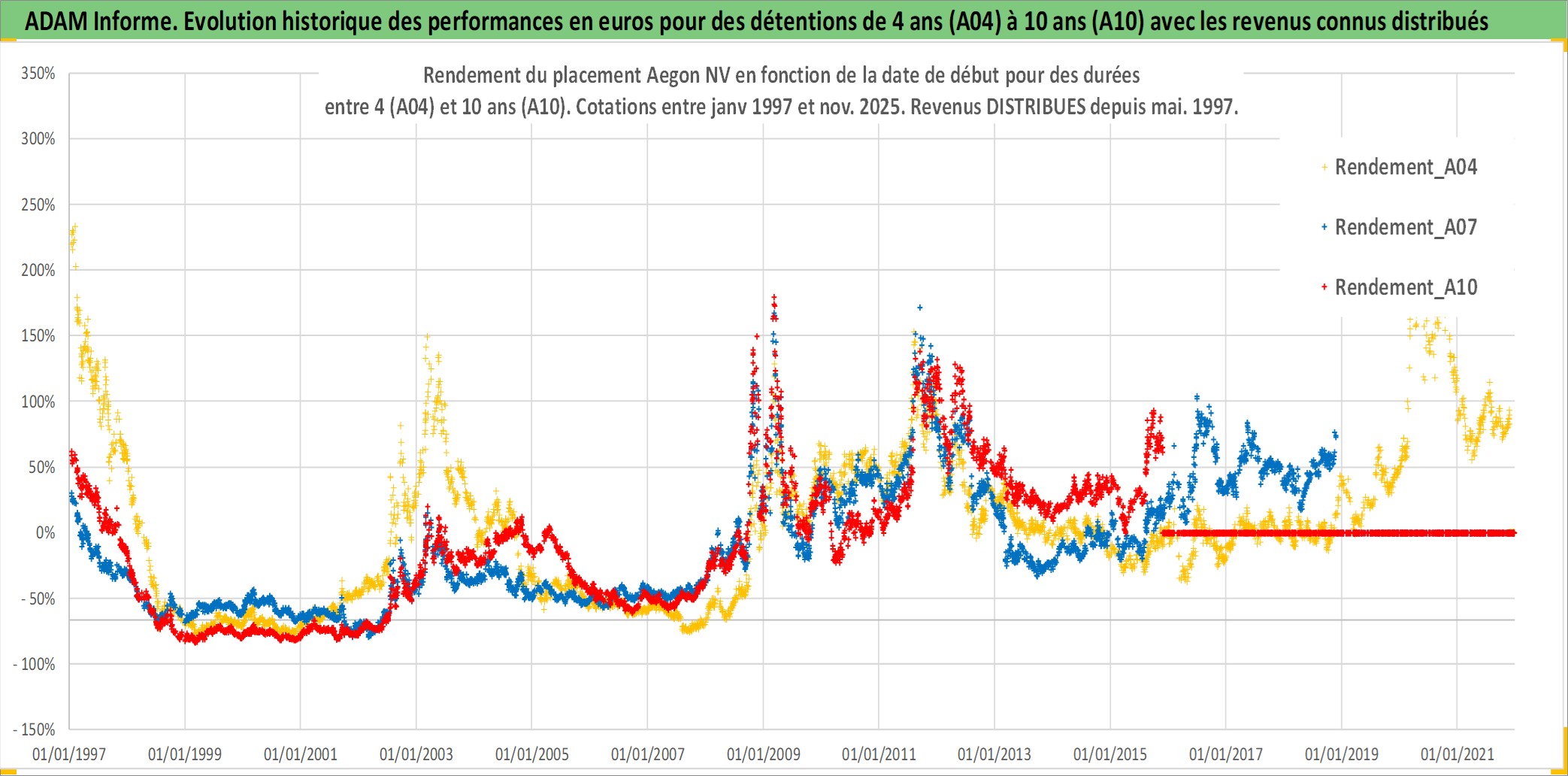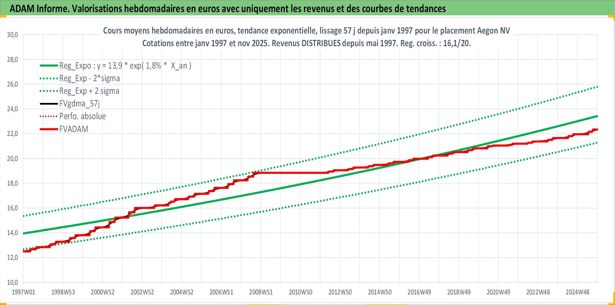 Site dédié aux investisseursPage dédiée sur site financeAnalyse des valorisations hebdomadaires de l'action Aegon NV. Cet actif est cote en EUR. Les valorisations couvrent les semaines 1997W01 a 2025W48. Les revenus de cet actif financier sont pris en compte depuis la semaine 1997W20. La note globale ESG de cet actif est estimee a 14.0 (apres rebasage entre 0 et 20).