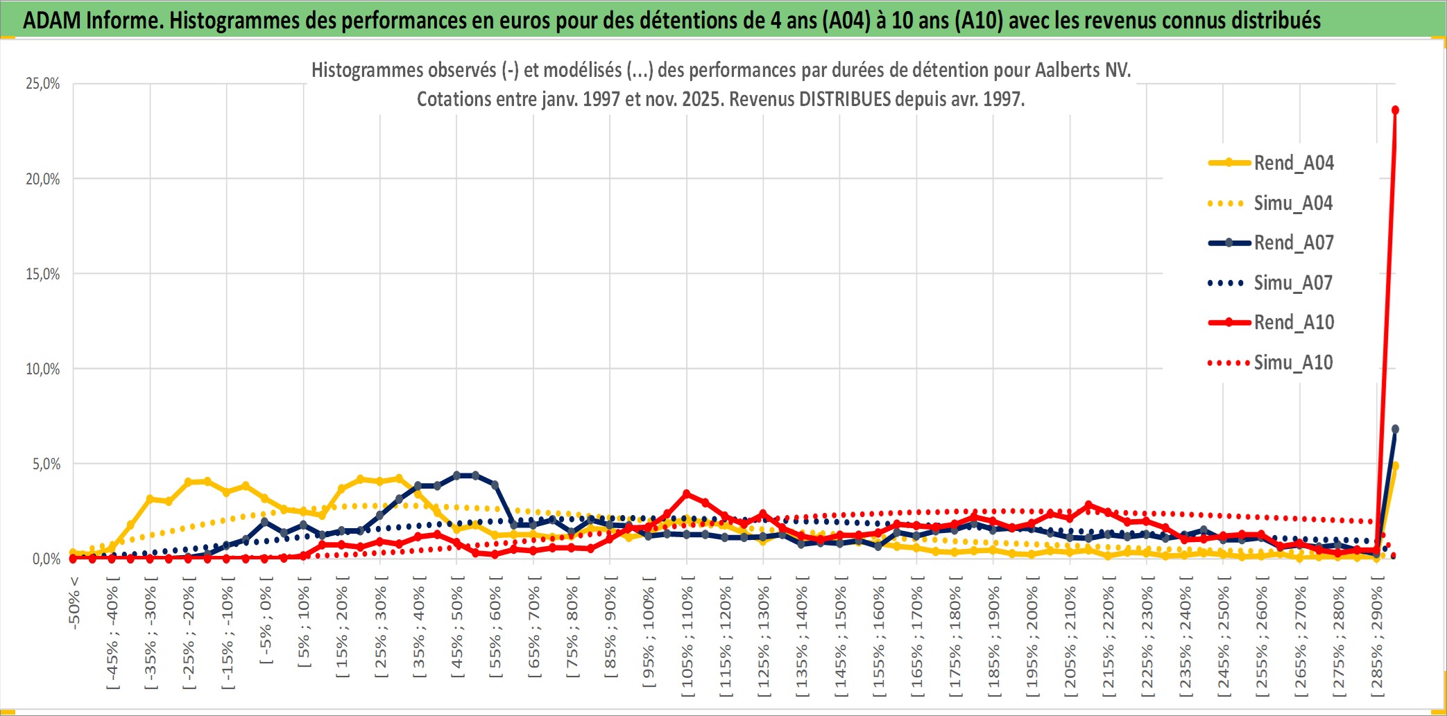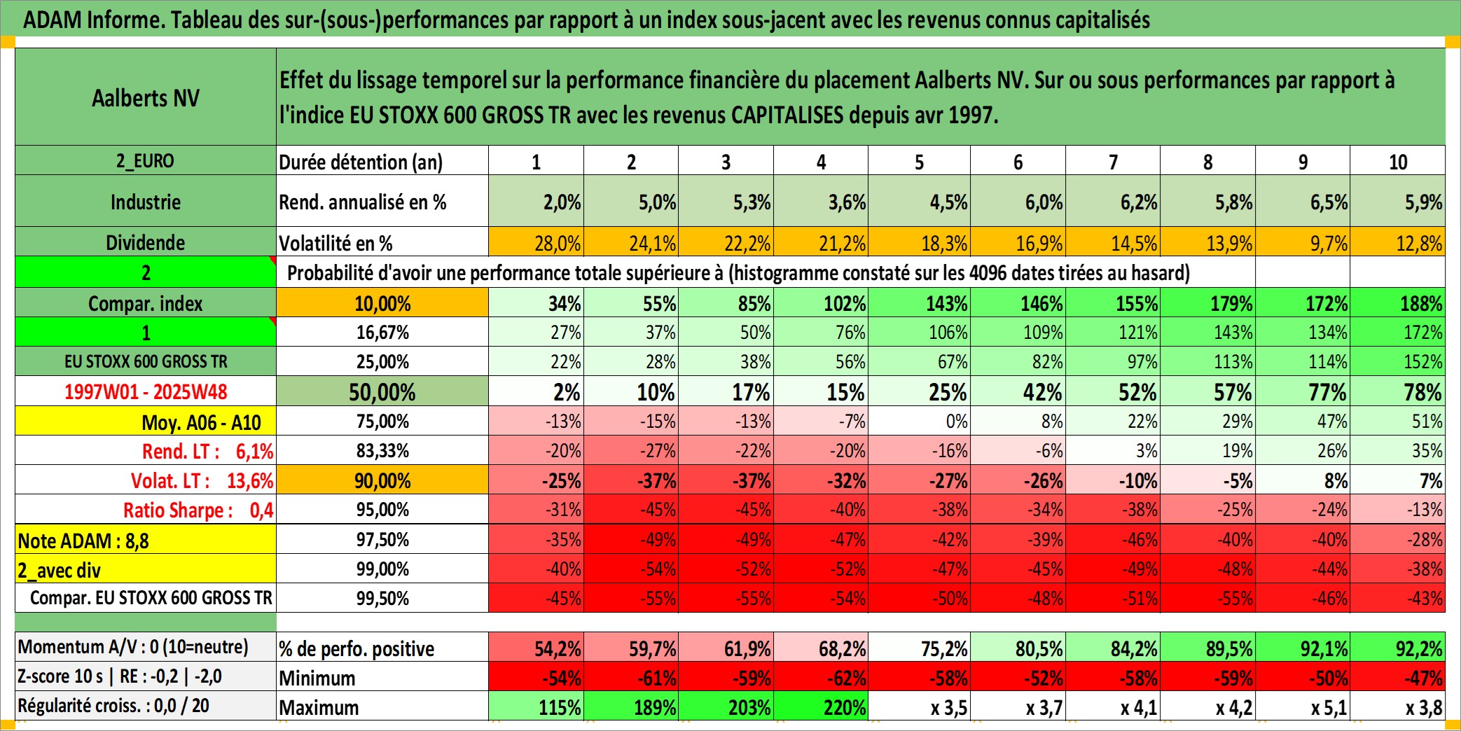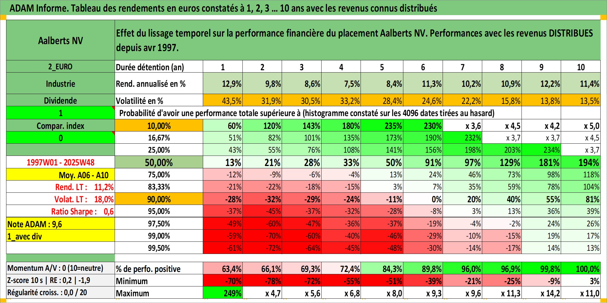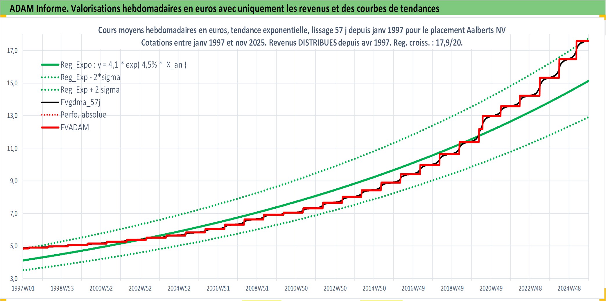 Site dédié aux investisseursPage dédiée sur site financeAnalyse des valorisations hebdomadaires de l'action Aalberts NV. Cet actif est cote en EUR. Les valorisations couvrent les semaines 1997W01 a 2025W48. Les revenus de cet actif financier sont pris en compte depuis la semaine 1997W16. La note ESG de cet actif n'est pas connue.
