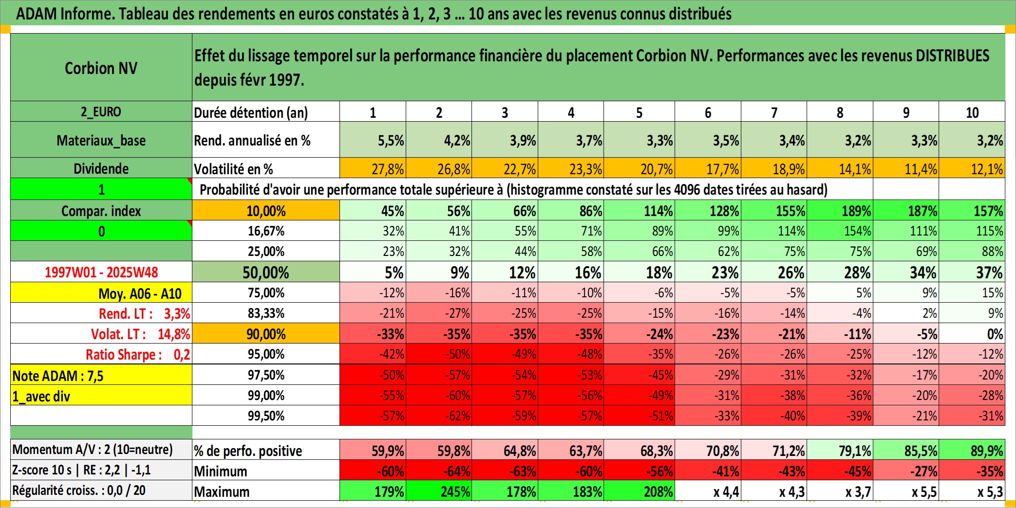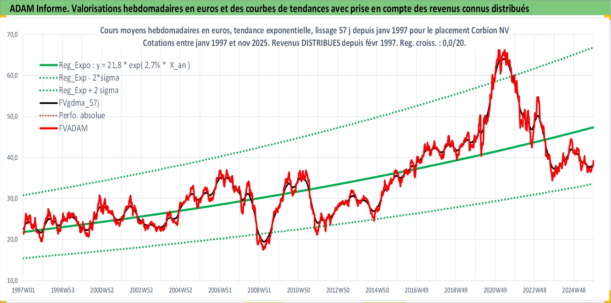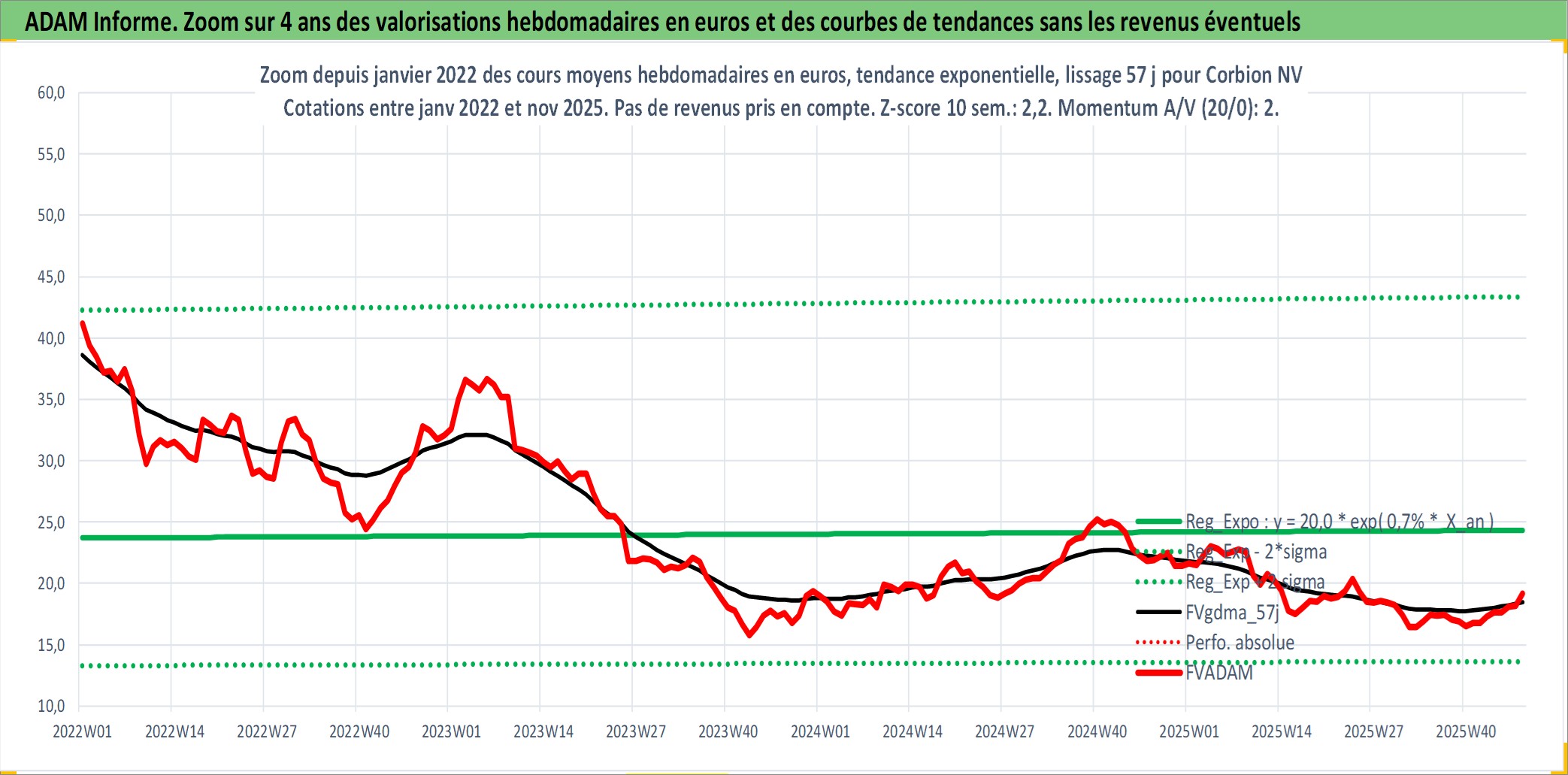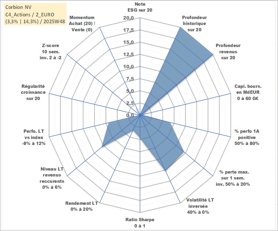 Site dédié aux investisseursPage dédiée sur site financeAnalyse des valorisations hebdomadaires de l'action Corbion NV. Cet actif est cote en EUR. Les valorisations couvrent les semaines 1997W01 a 2025W48. Les revenus de cet actif financier sont pris en compte depuis la semaine 1997W08. La note ESG de cet actif n'est pas connue.