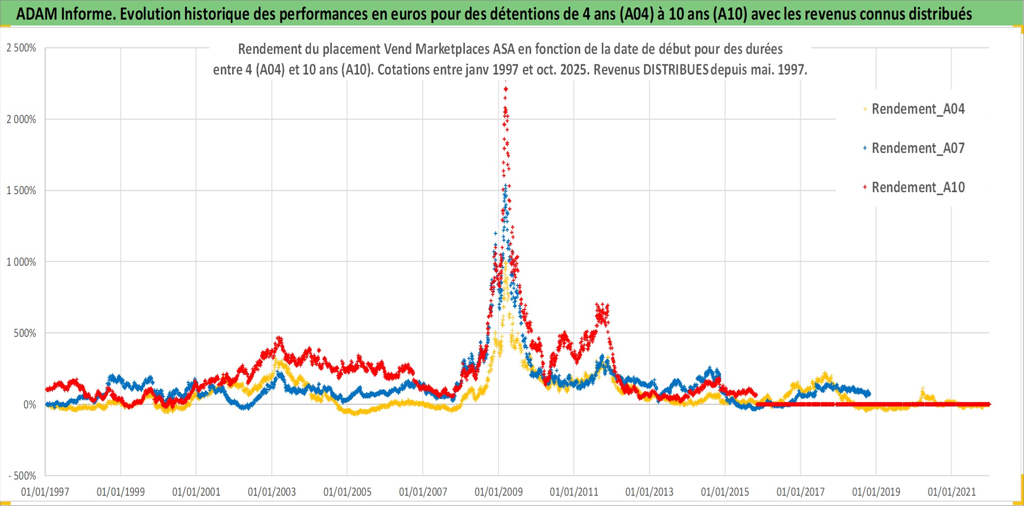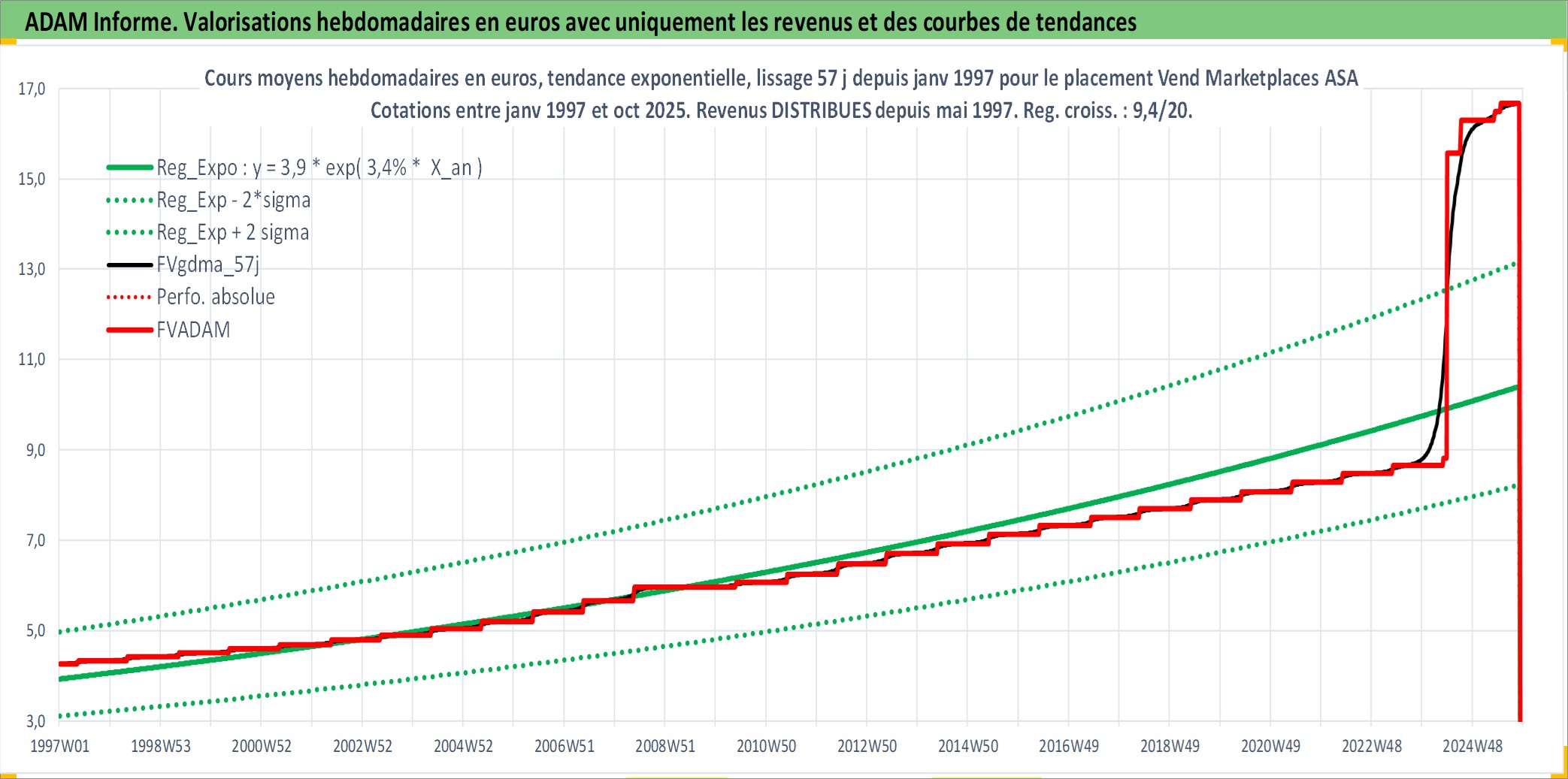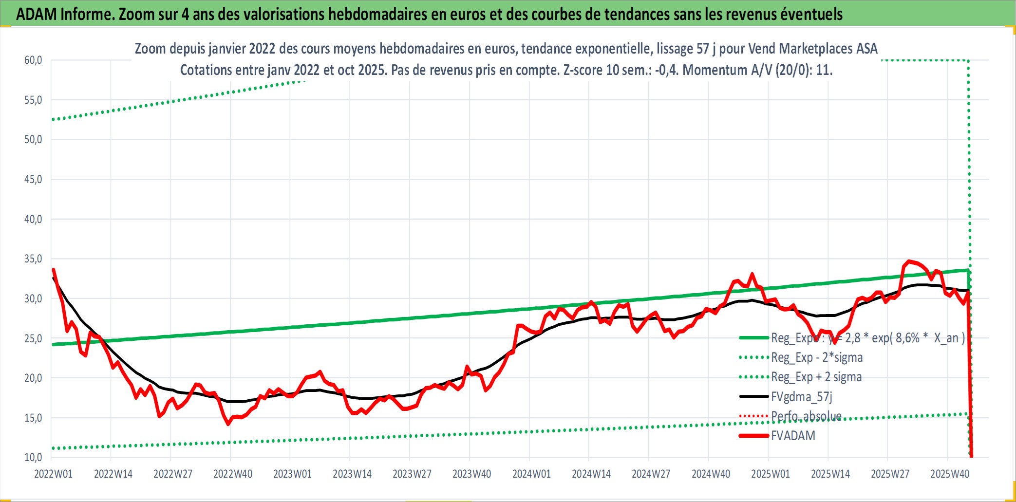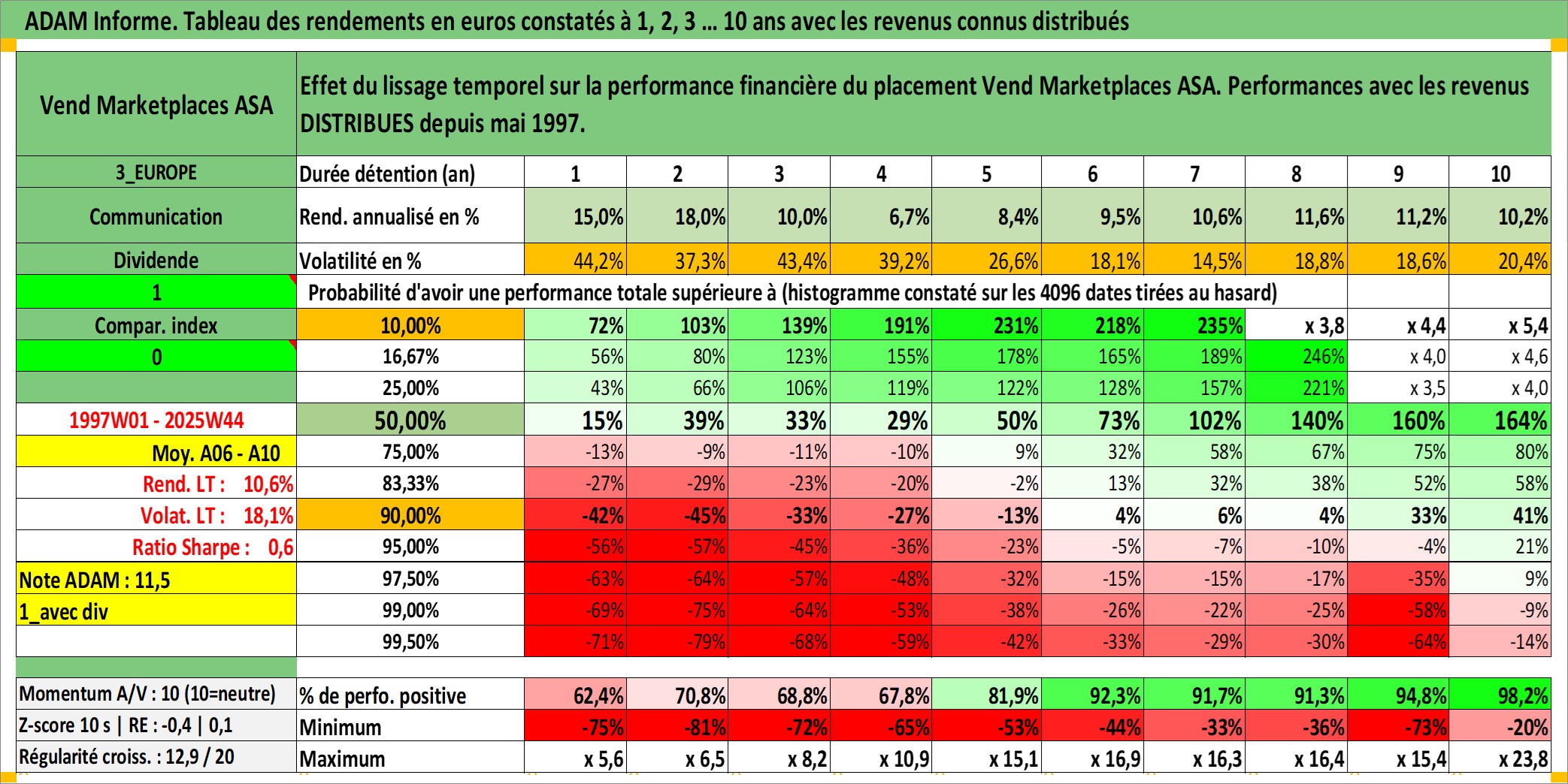 Site dédié aux investisseursPage dédiée sur site financeAnalyse des valorisations hebdomadaires de l'action Vend Marketplaces ASA. Cet actif est cote en NOK. Les valorisations sont en contrevaleur EURO et couvrent les semaines 1997W01 a 2025W44. Les revenus de cet actif financier sont pris en compte depuis la semaine 1997W20. La note globale ESG de cet actif est estimee a 16.0 (apres rebasage entre 0 et 20).