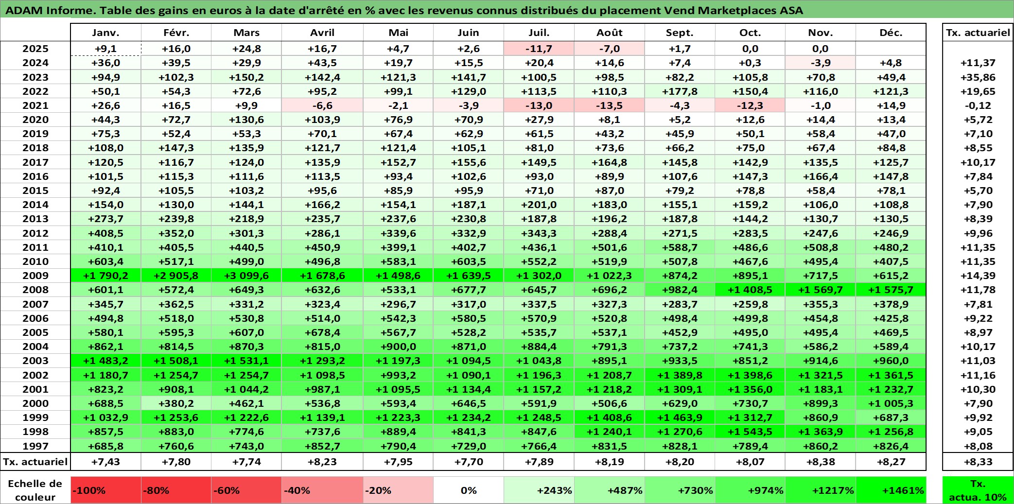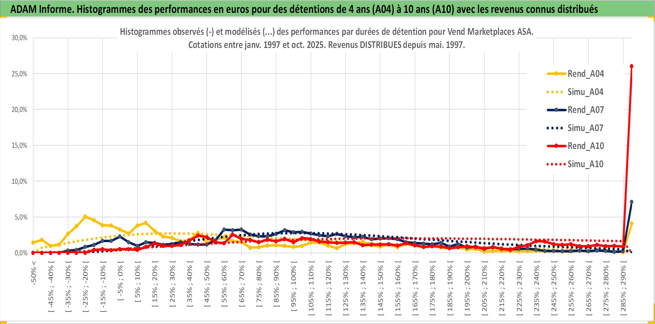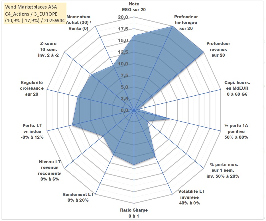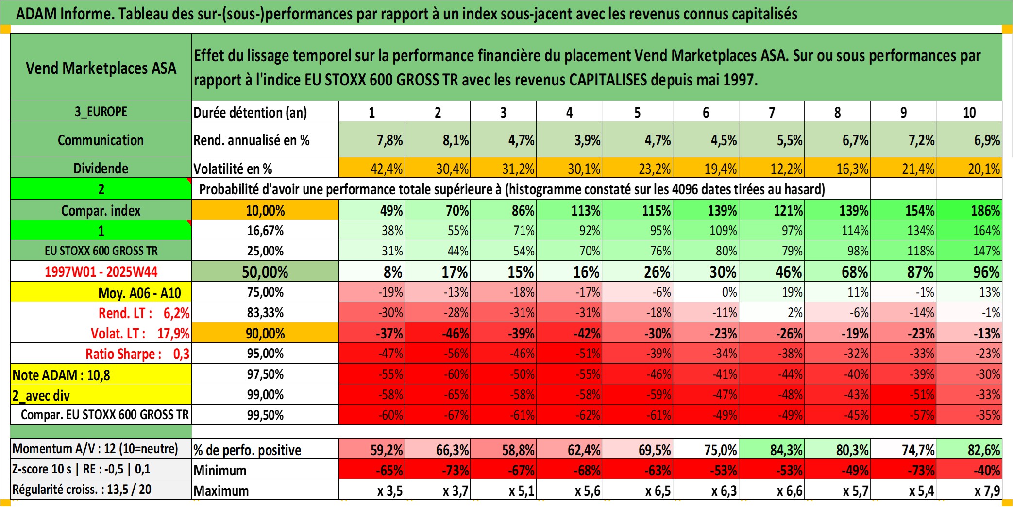 Site dédié aux investisseursPage dédiée sur site financeAnalyse des valorisations hebdomadaires de l'action Vend Marketplaces ASA. Cet actif est cote en NOK. Les valorisations sont en contrevaleur EURO et couvrent les semaines 1997W01 a 2025W44. Les revenus de cet actif financier sont pris en compte depuis la semaine 1997W20. La note globale ESG de cet actif est estimee a 16.0 (apres rebasage entre 0 et 20).