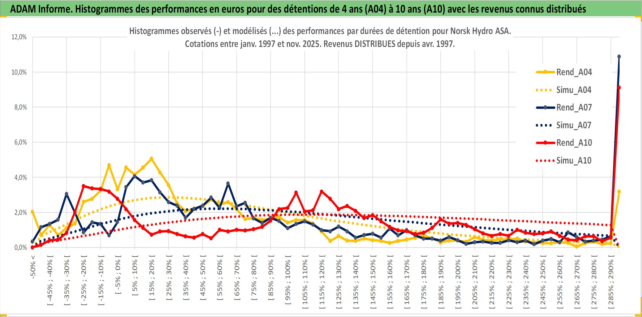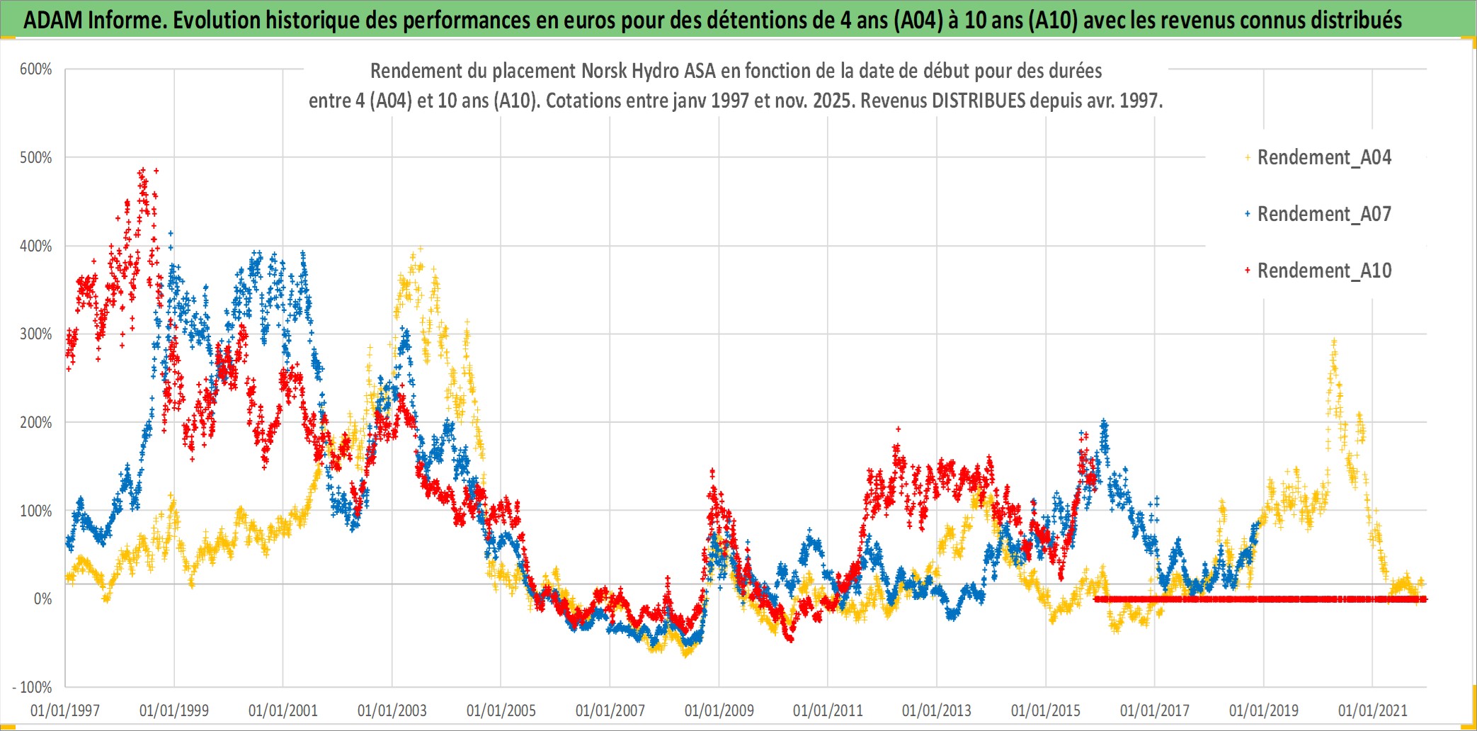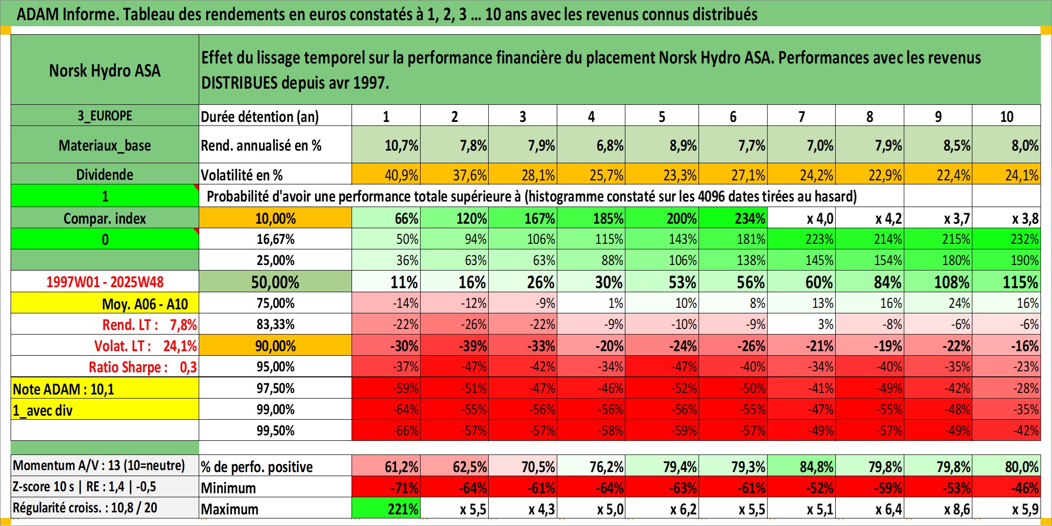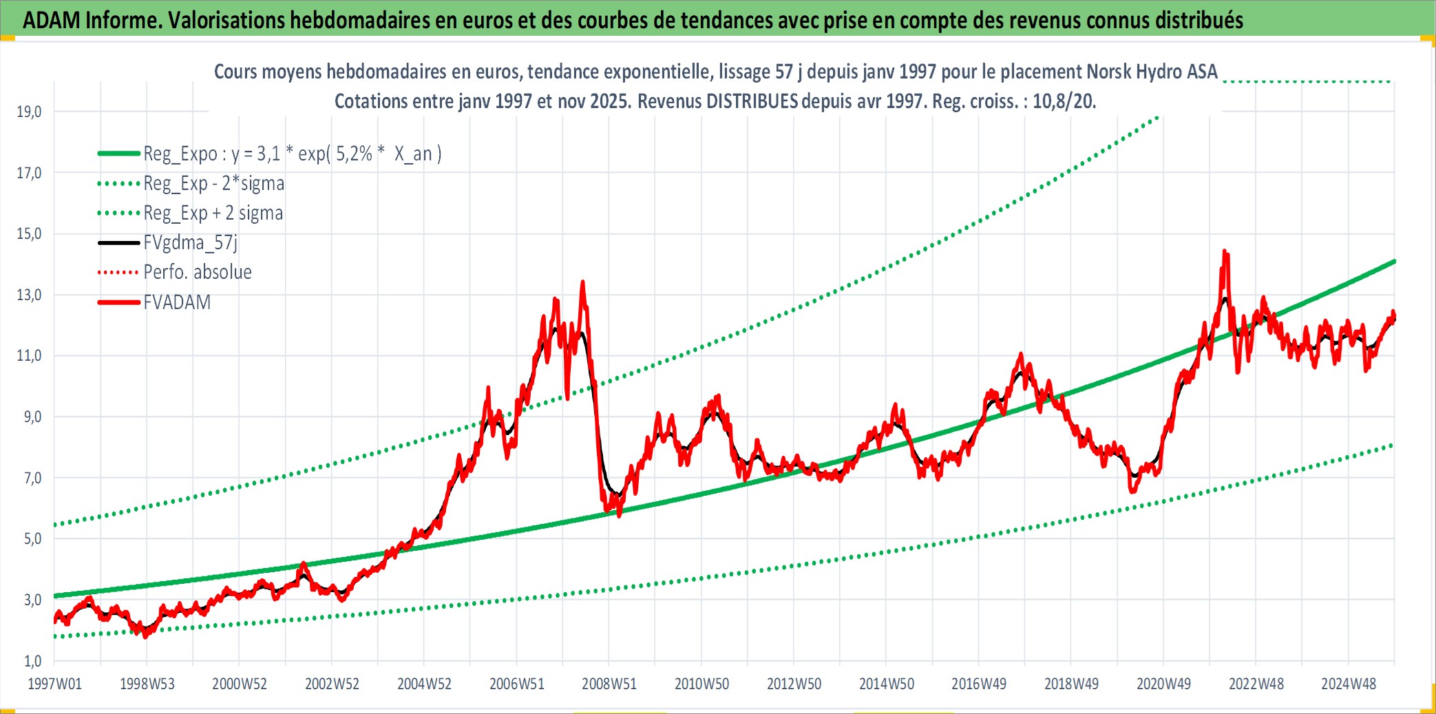 Site dédié aux investisseursPage dédiée sur site financeAnalyse des valorisations hebdomadaires de l'action Norsk Hydro ASA. Cet actif est cote en NOK. Les valorisations sont en contrevaleur EURO et couvrent les semaines 1997W01 a 2025W48. Les revenus de cet actif financier sont pris en compte depuis la semaine 1997W17. La note globale ESG de cet actif est estimee a 10.0 (apres rebasage entre 0 et 20).