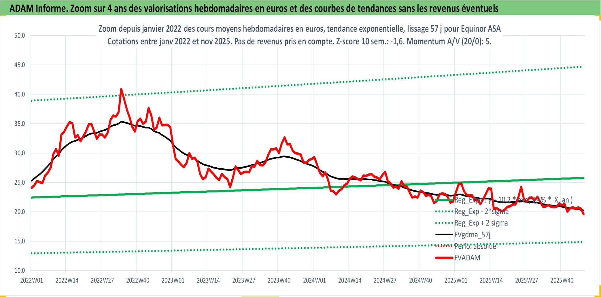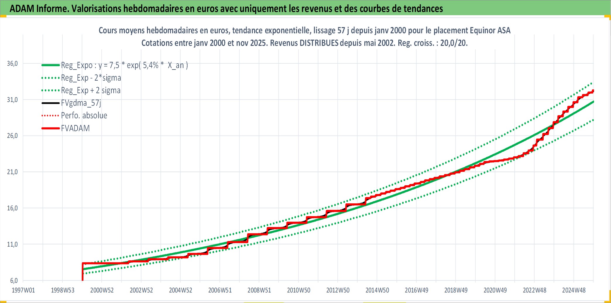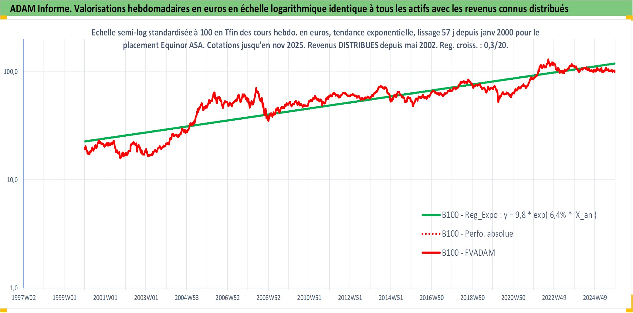 Site dédié aux investisseursPage dédiée sur site financeAnalyse des valorisations hebdomadaires de l'action Equinor ASA. Cet actif est cote en NOK. Les valorisations sont en contrevaleur EURO et couvrent les semaines 2000W01 a 2025W48. Les revenus de cet actif financier sont pris en compte depuis la semaine 2002W19. La note globale ESG de cet actif est estimee a 4.0 (apres rebasage entre 0 et 20).