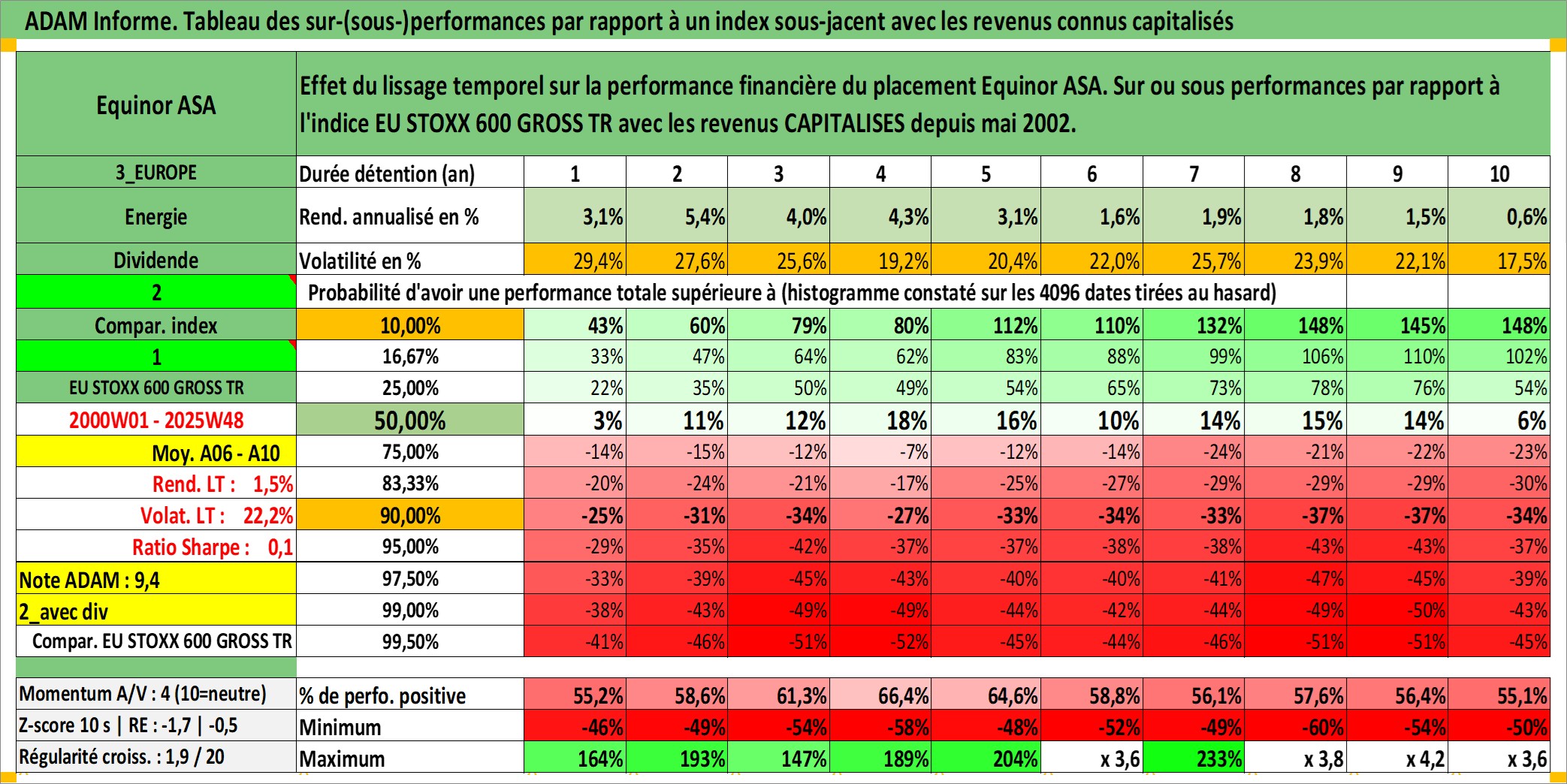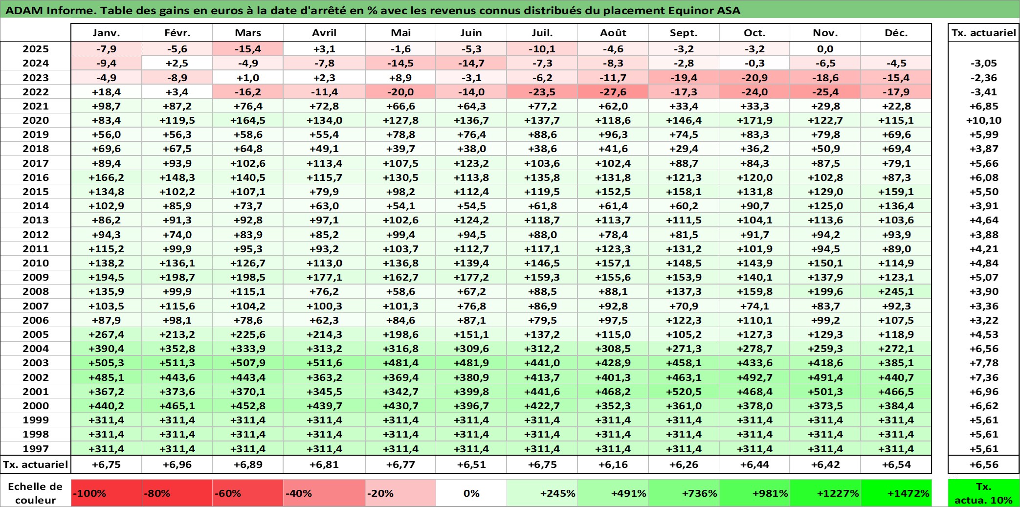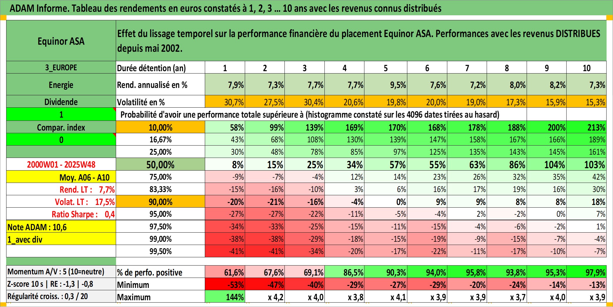 Site dédié aux investisseursPage dédiée sur site financeAnalyse des valorisations hebdomadaires de l'action Equinor ASA. Cet actif est cote en NOK. Les valorisations sont en contrevaleur EURO et couvrent les semaines 2000W01 a 2025W48. Les revenus de cet actif financier sont pris en compte depuis la semaine 2002W19. La note globale ESG de cet actif est estimee a 4.0 (apres rebasage entre 0 et 20).