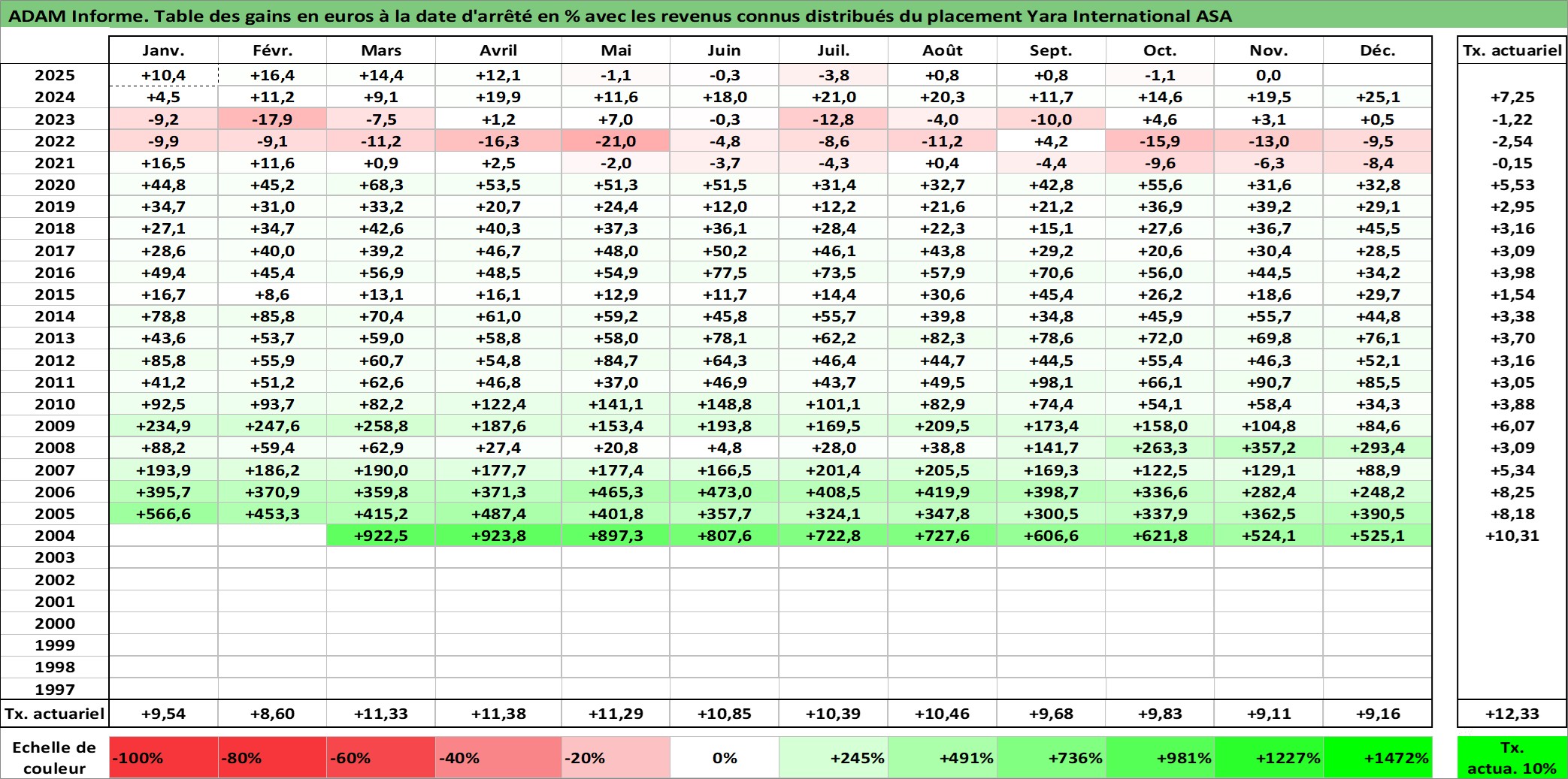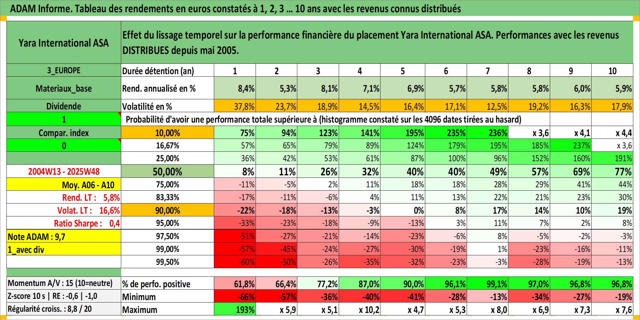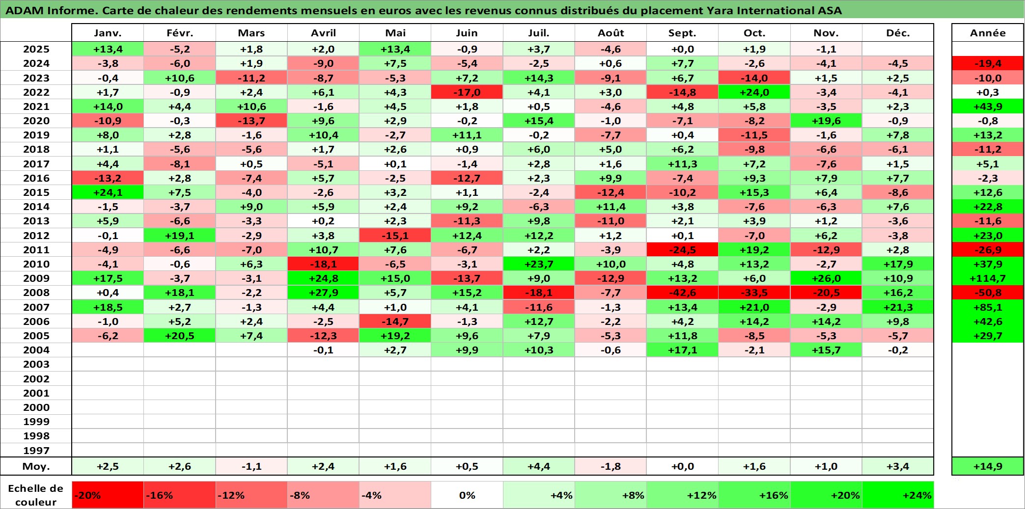 Site dédié aux investisseursPage dédiée sur site financeAnalyse des valorisations hebdomadaires de l'action Yara International ASA. Cet actif est cote en NOK. Les valorisations sont en contrevaleur EURO et couvrent les semaines 2004W13 a 2025W48. Les revenus de cet actif financier sont pris en compte depuis la semaine 2005W20. La note globale ESG de cet actif est estimee a 7.0 (apres rebasage entre 0 et 20).
