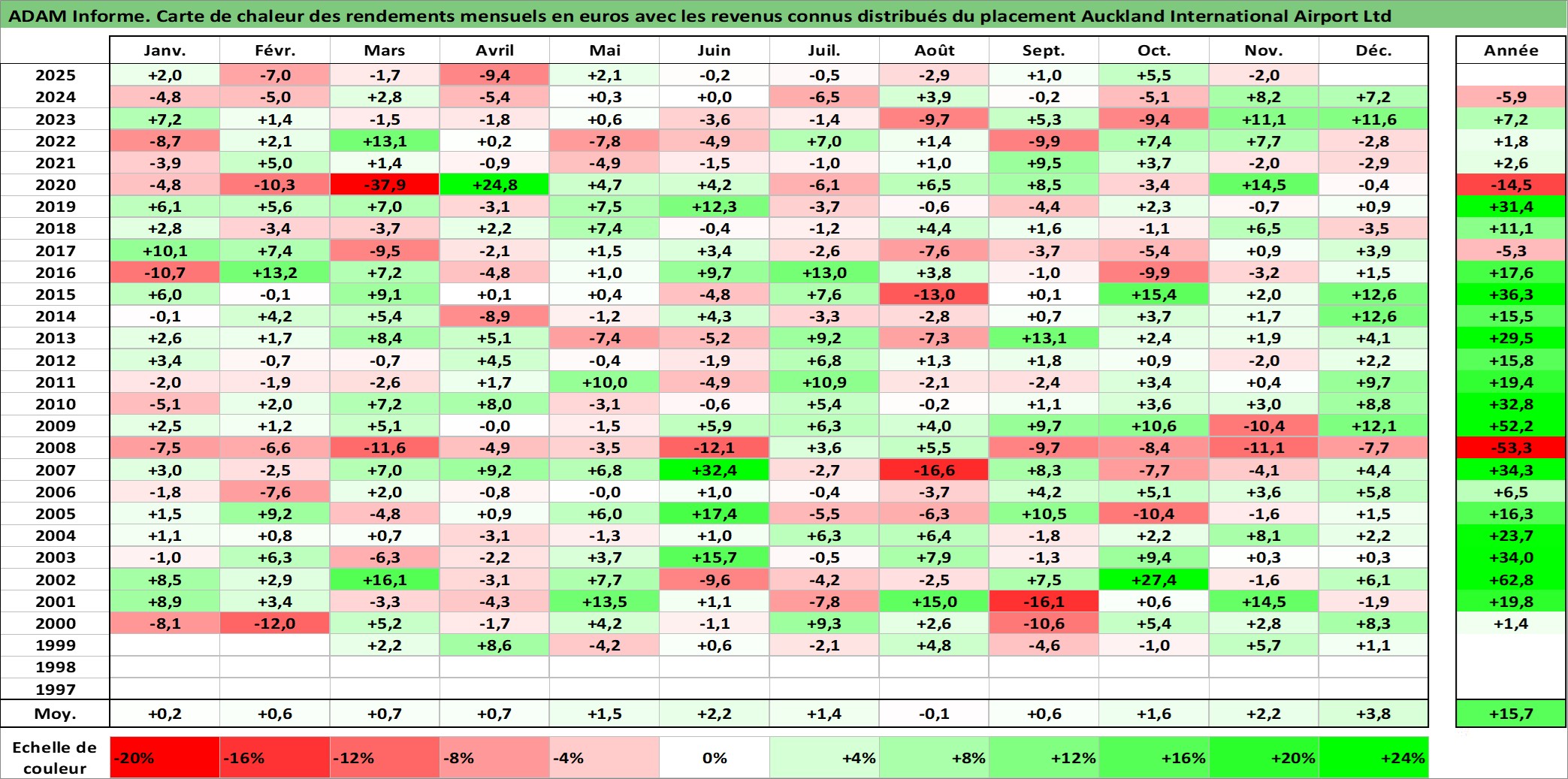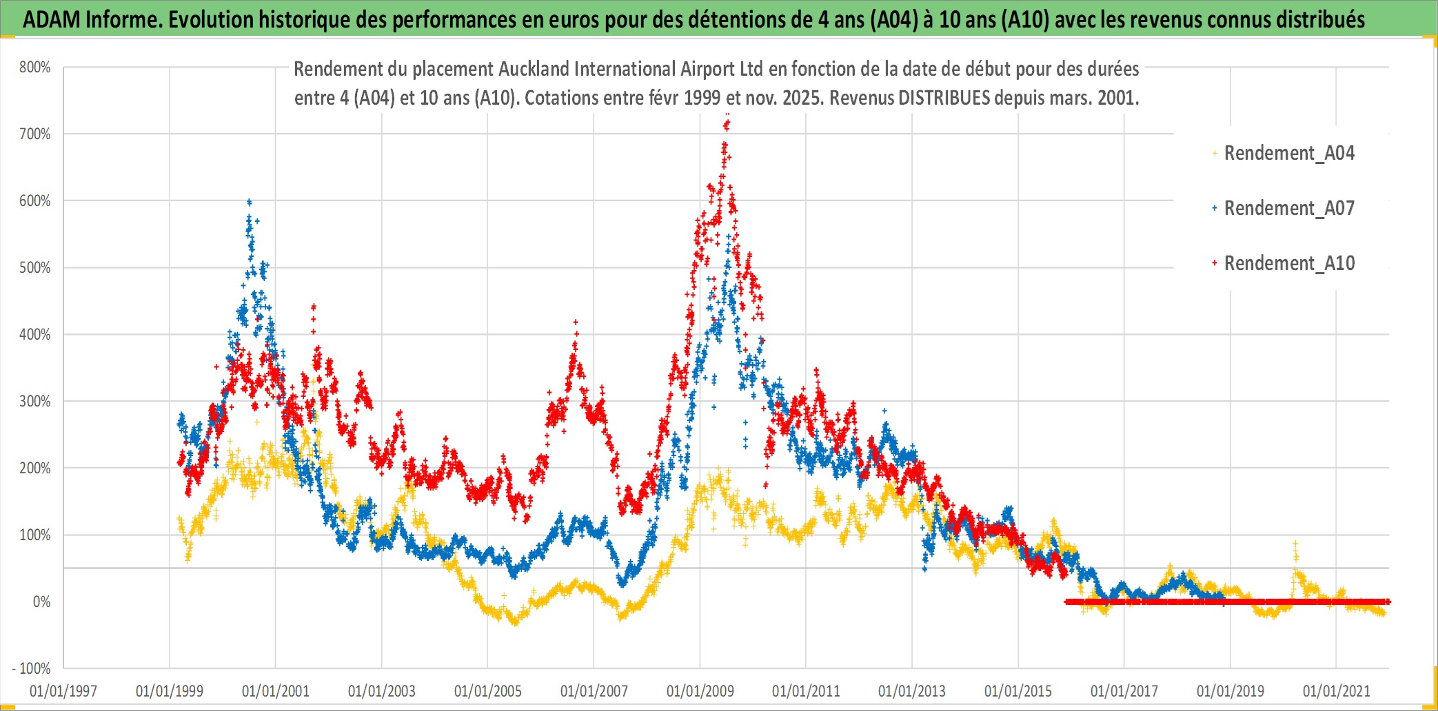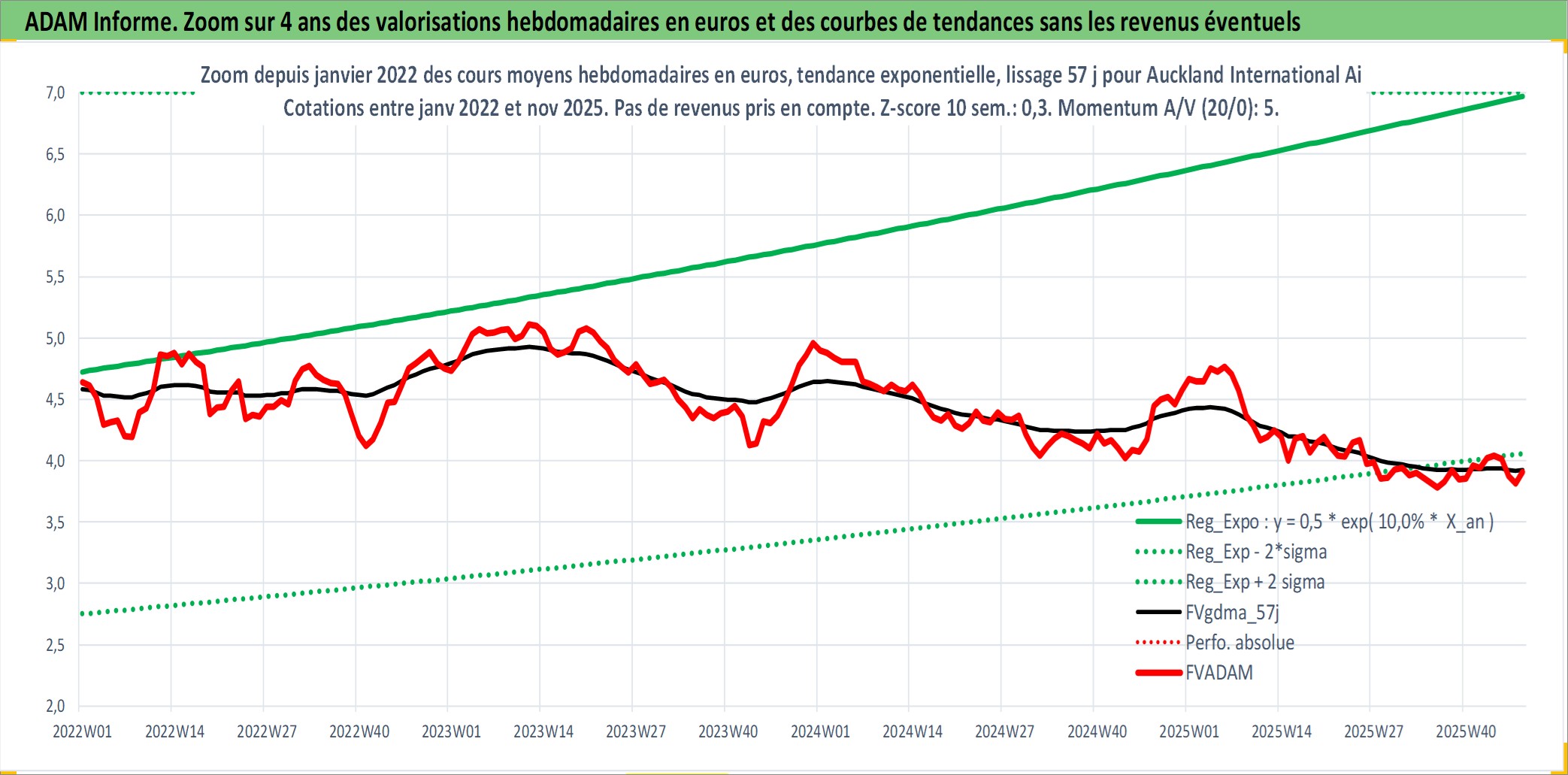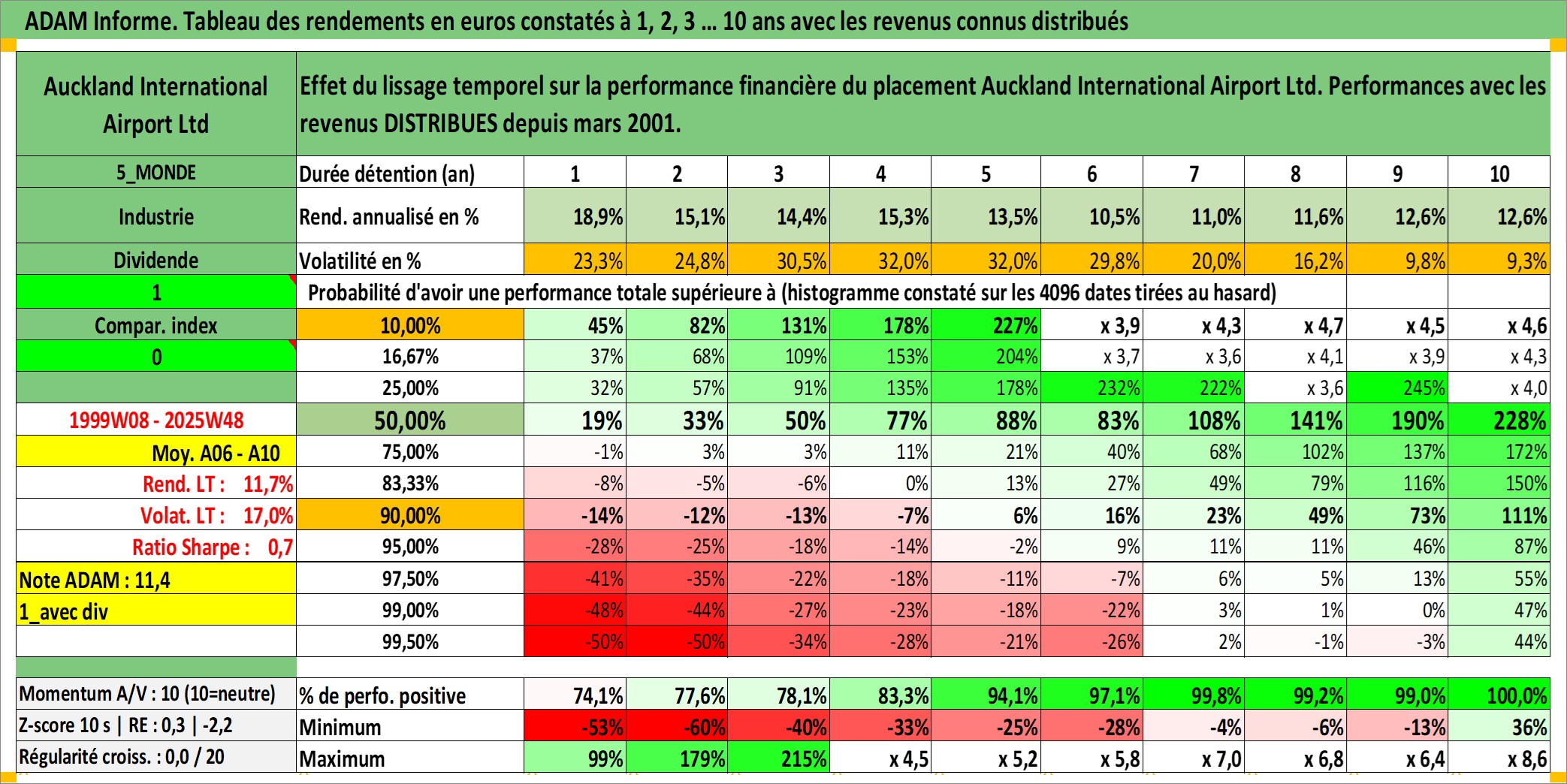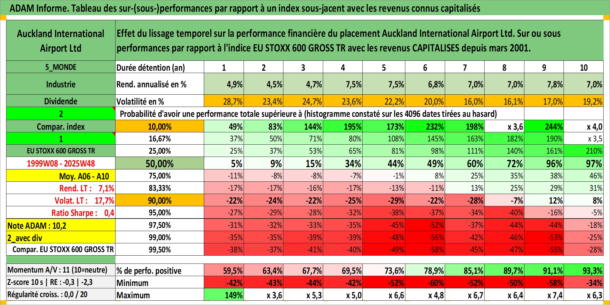 Site dédié aux investisseursPage dédiée sur site financeAnalyse des valorisations hebdomadaires de l'action Auckland International Airport Ltd. Cet actif est cote en AUD. Les valorisations sont en contrevaleur EURO et couvrent les semaines 1999W08 a 2025W48. Les revenus de cet actif financier sont pris en compte depuis la semaine 2001W11. La note globale ESG de cet actif est estimee a 11.0 (apres rebasage entre 0 et 20).