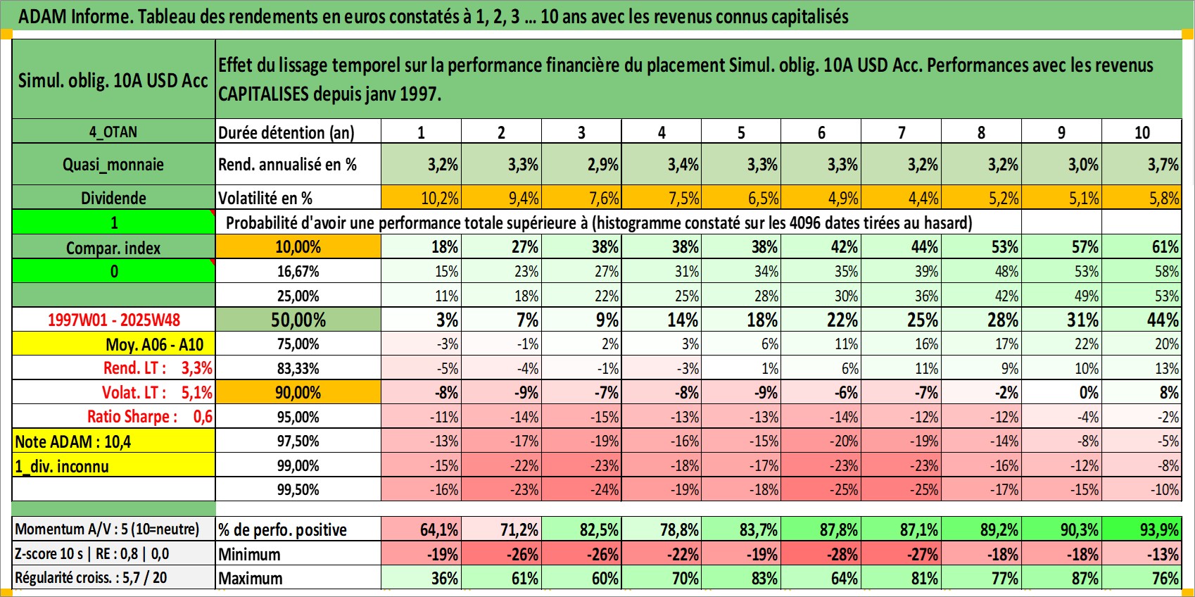 Site dédié aux investisseursPage dédiée sur site financeAnalyse des valorisations hebdomadaires de l'action Simul. oblig. 10A USD Acc. Cet actif est cote en USD. Les valorisations sont en contrevaleur EURO et couvrent les semaines 1997W01 a 2025W48. Les revenus de cet actif financier sont pris en compte depuis la semaine 1997W01. La note ESG de cet actif n'est pas connue.