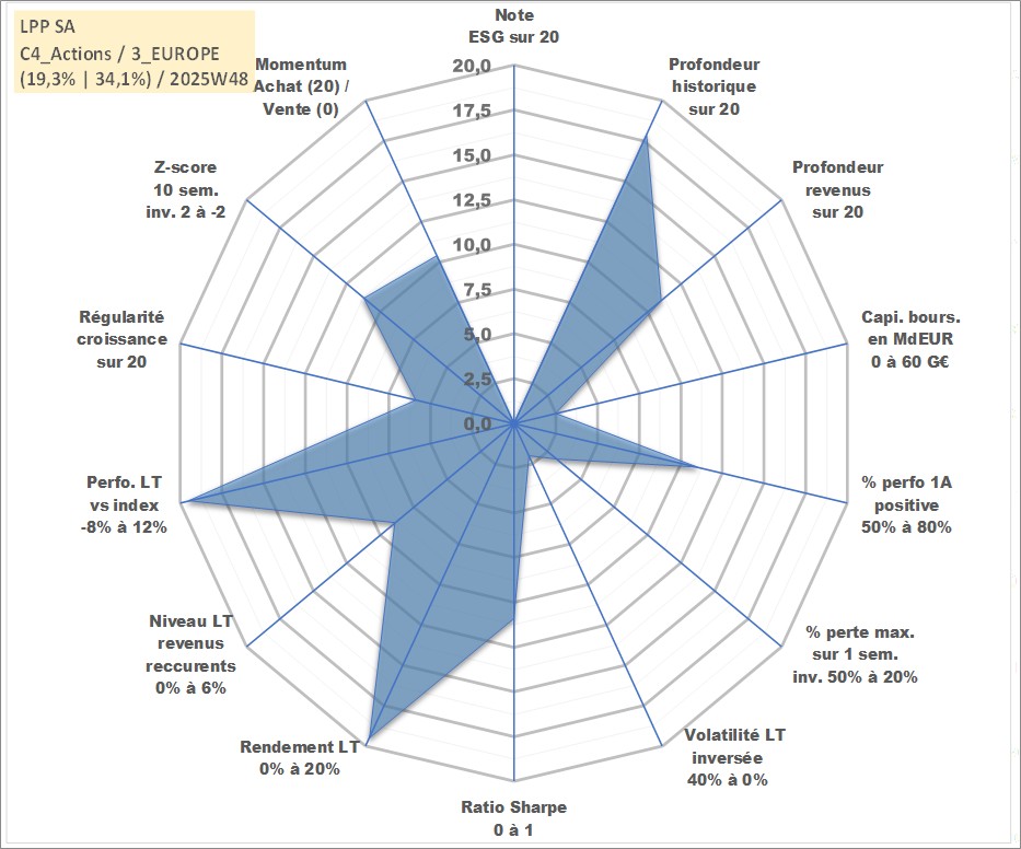 Site dédié aux investisseursPage dédiée sur site financeAnalyse des valorisations hebdomadaires de l'action LPP SA. Cet actif est cote en PLN. Les valorisations sont en contrevaleur EURO et couvrent les semaines 2001W20 a 2025W48. Les revenus de cet actif financier sont pris en compte depuis la semaine 2010W37. La note ESG de cet actif n'est pas connue.