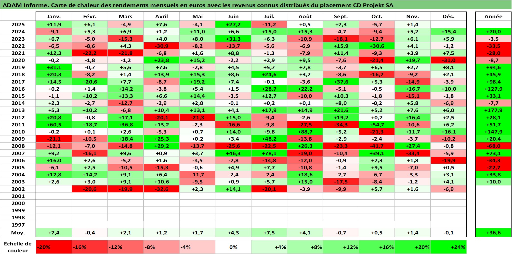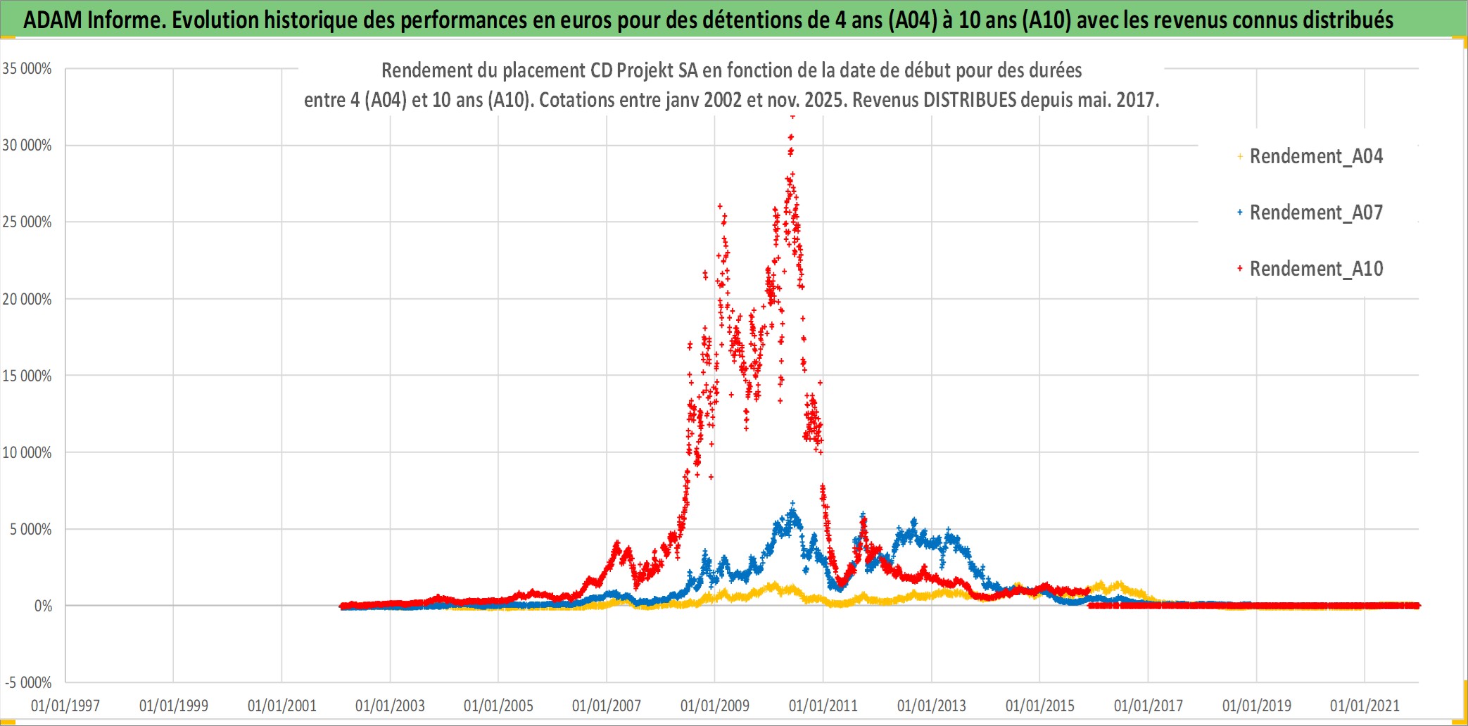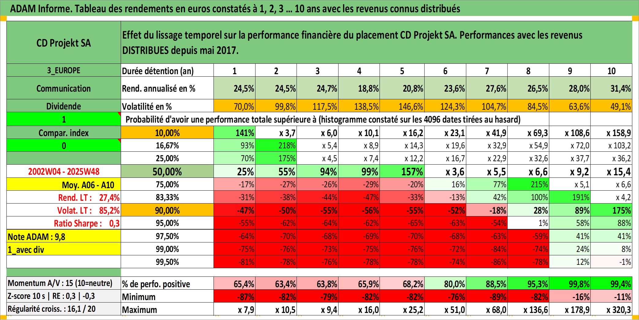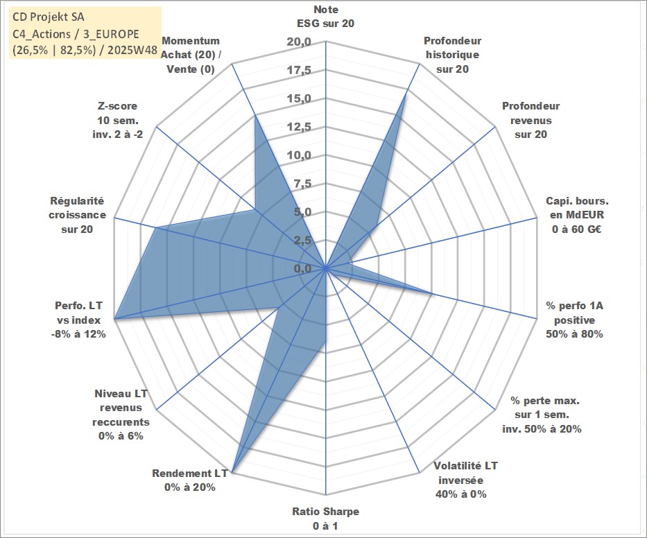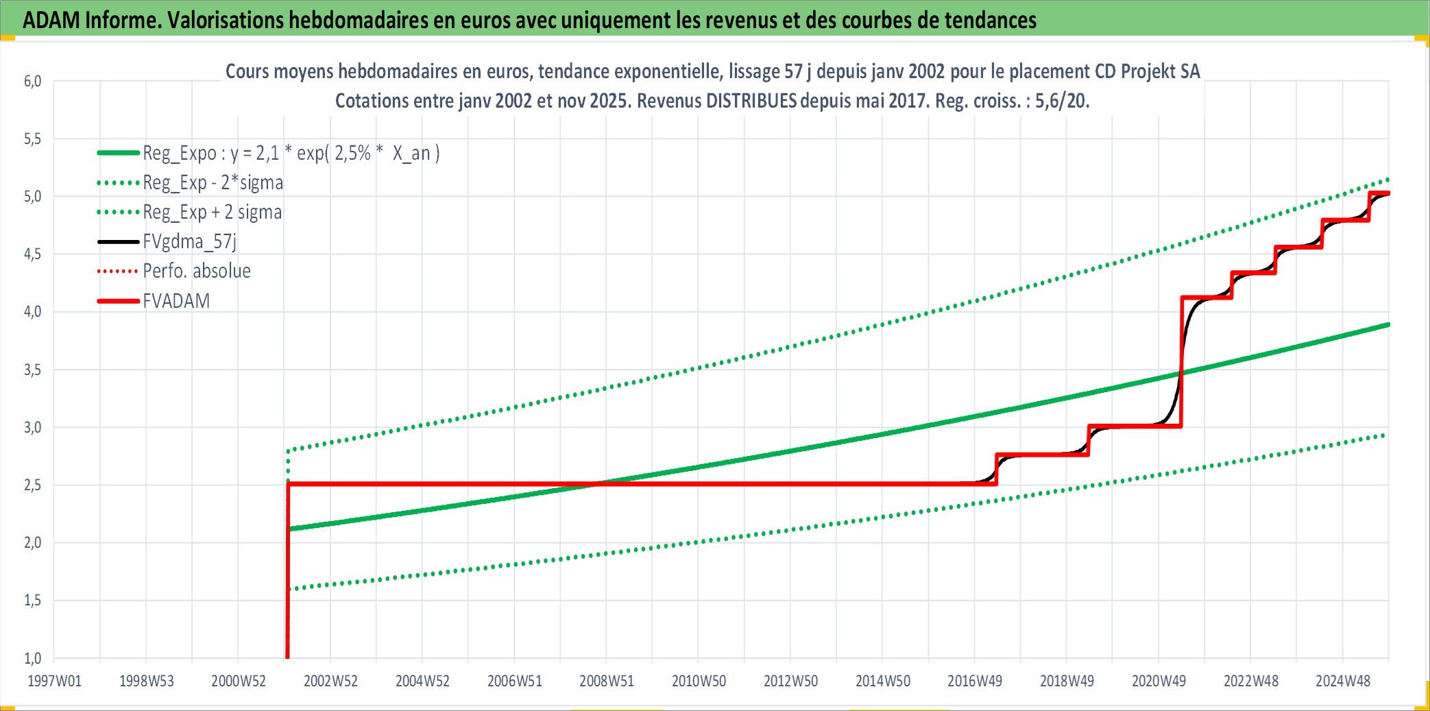 Site dédié aux investisseursPage dédiée sur site financeAnalyse des valorisations hebdomadaires de l'action CD Projekt SA. Cet actif est cote en PLN. Les valorisations sont en contrevaleur EURO et couvrent les semaines 2002W04 a 2025W48. Les revenus de cet actif financier sont pris en compte depuis la semaine 2017W22. La note ESG de cet actif n'est pas connue.
