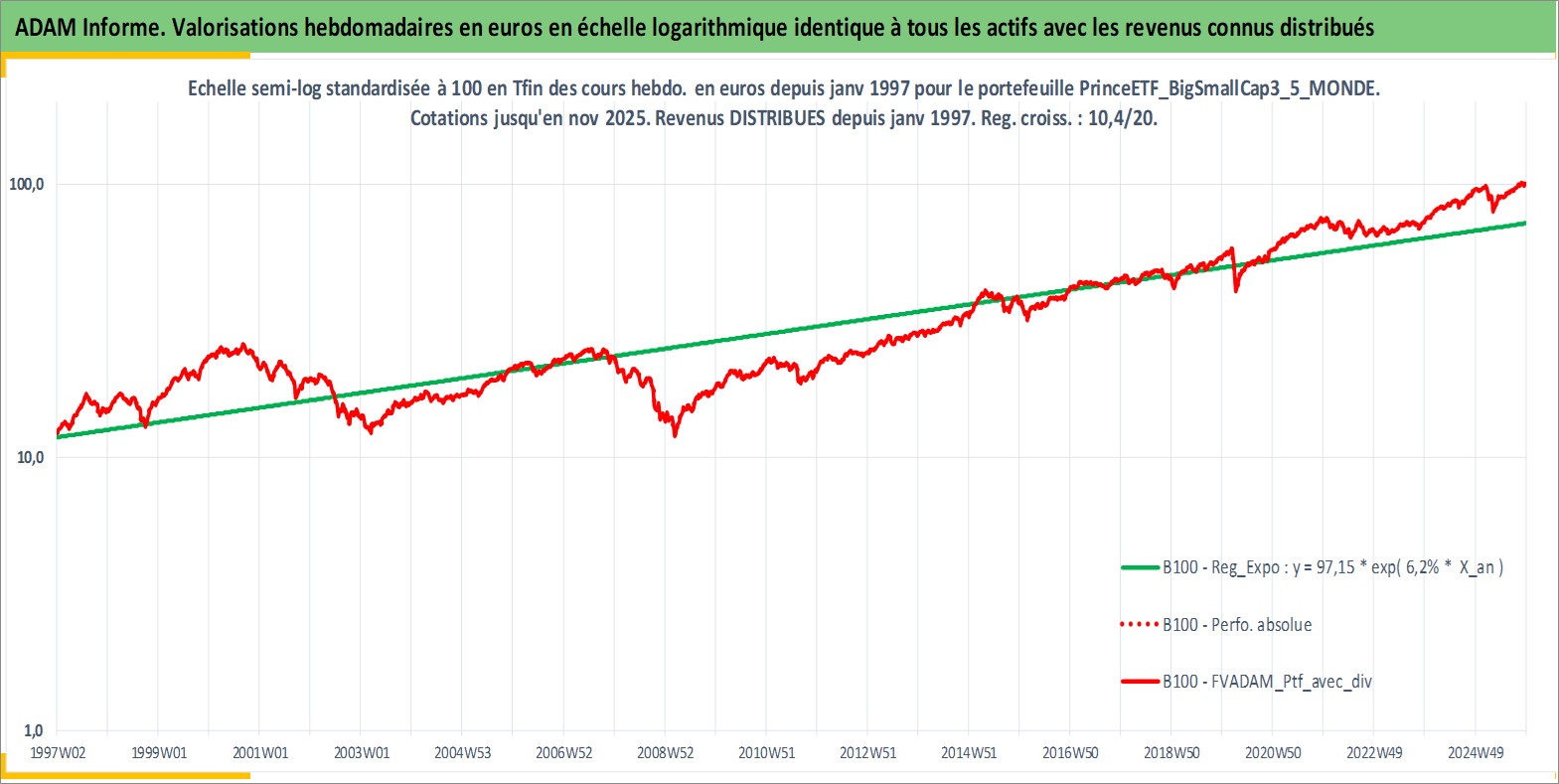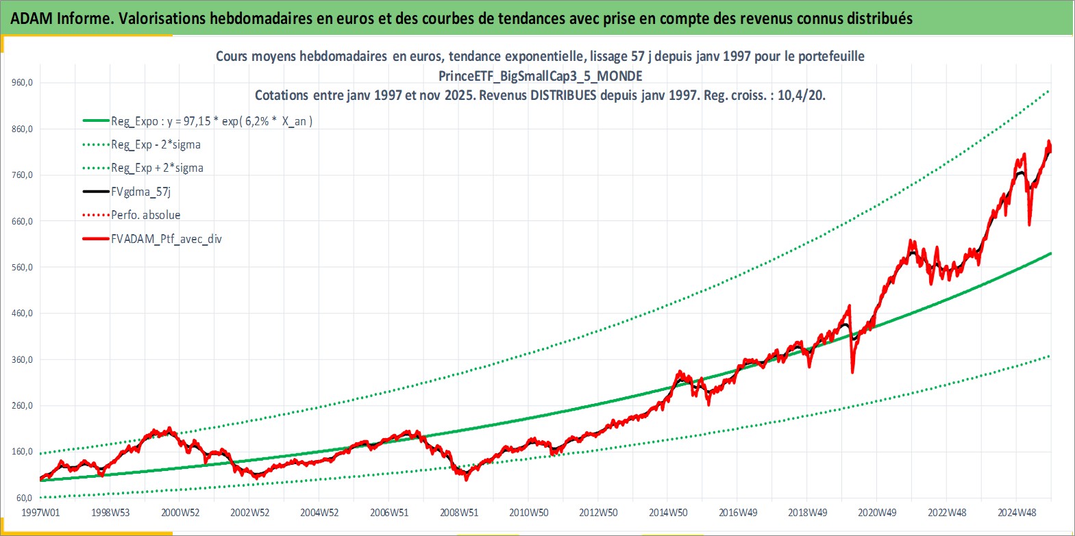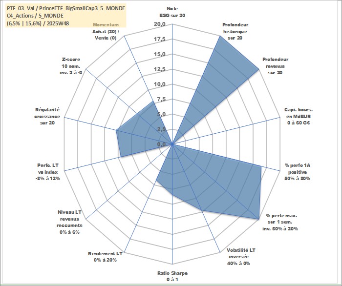 Site dédié aux investisseursPage dédiée sur site financeAnalyse des valorisations hebdomadaires du portefeuille PrinceETF_BigSmallCap3_5_MONDE_3actifs avec un profil P6_PurActions. Ce portefeuille est cote en EUR. Les valorisations couvrent les semaines 1997W01 a 2025W48. Les revenus de cet actif financier sont pris en compte depuis la semaine 1997W01. La note ESG de cet actif n'est pas connue.