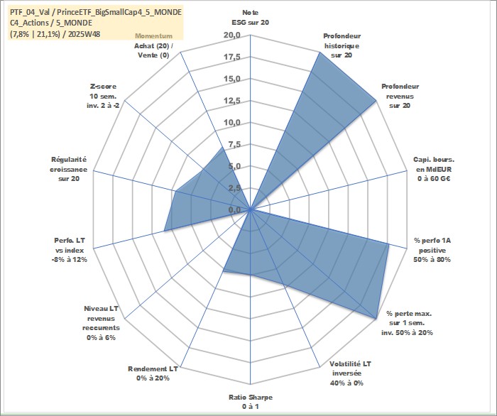 Site dédié aux investisseursPage dédiée sur site financeAnalyse des valorisations hebdomadaires du portefeuille PrinceETF_BigSmallCap4_5_MONDE_4actifs avec un profil P6_PurActions. Ce portefeuille est cote en EUR. Les valorisations couvrent les semaines 1997W01 a 2025W48. Les revenus de cet actif financier sont pris en compte depuis la semaine 1997W01. La note ESG de cet actif n'est pas connue.