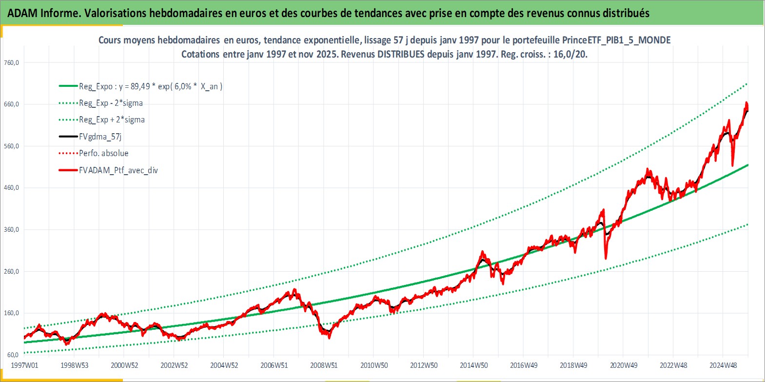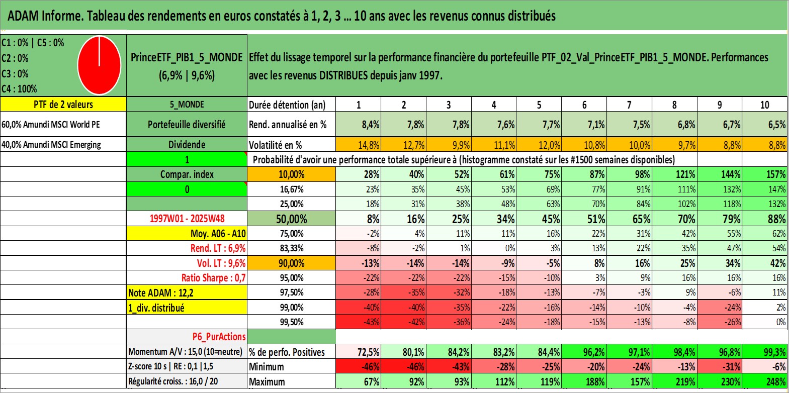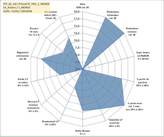 Site dédié aux investisseursPage dédiée sur site financeAnalyse des valorisations hebdomadaires du portefeuille PrinceETF_PIB1_5_MONDE_2actifs avec un profil P6_PurActions. Ce portefeuille est cote en EUR. Les valorisations couvrent les semaines 1997W01 a 2025W48. Les revenus de cet actif financier sont pris en compte depuis la semaine 1997W01. La note ESG de cet actif n'est pas connue.