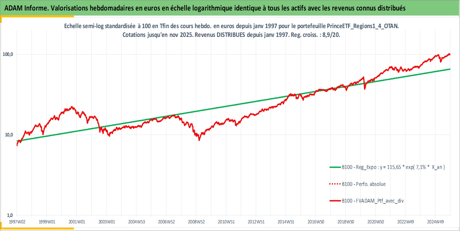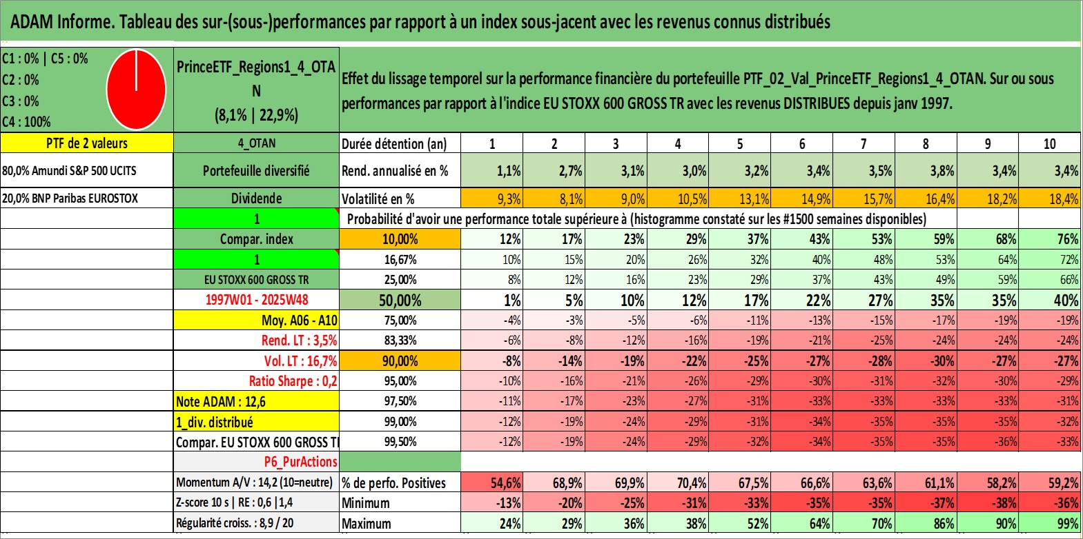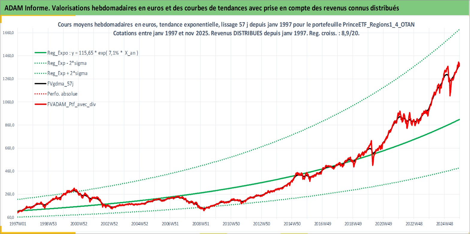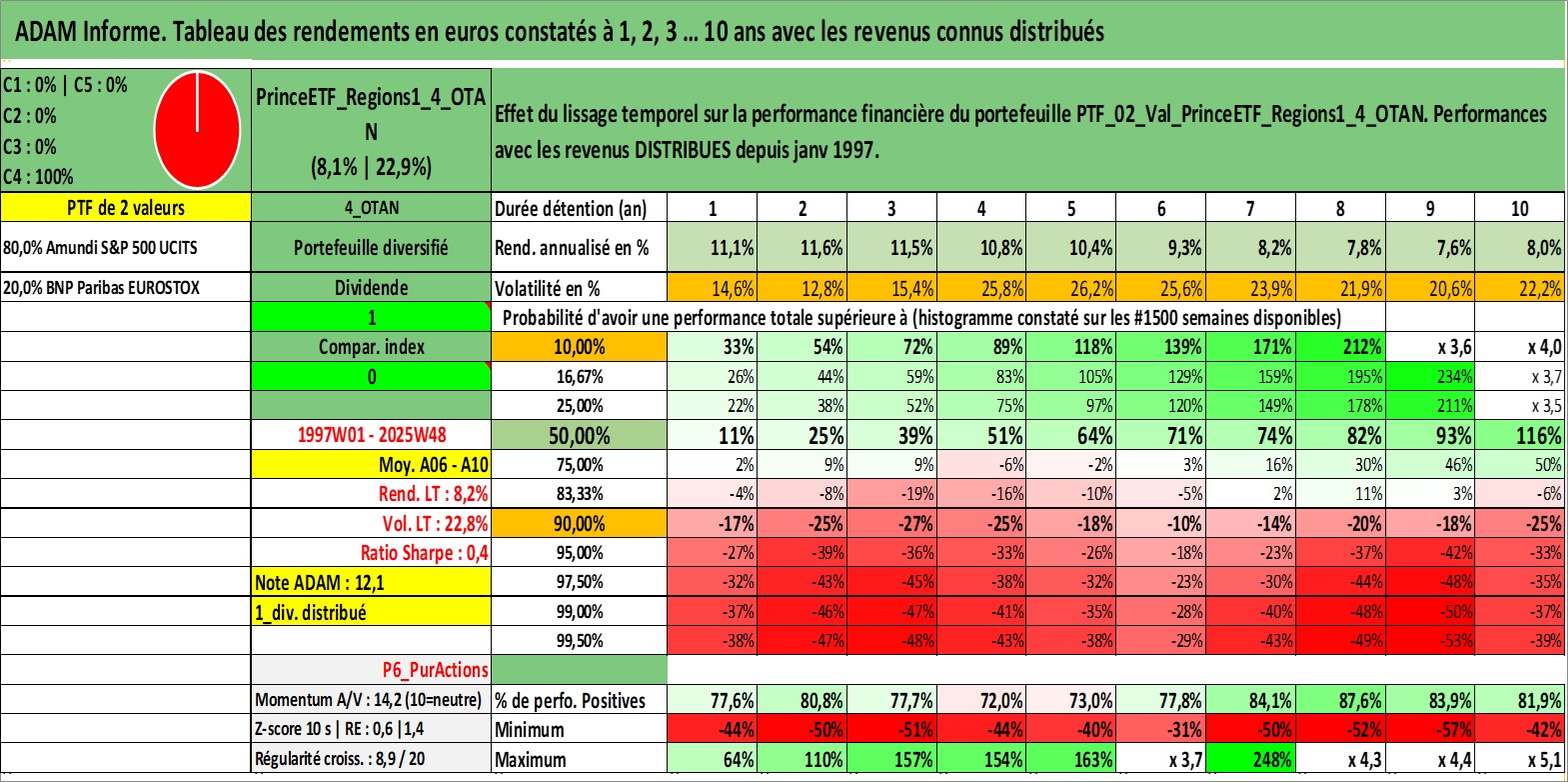 Site dédié aux investisseursPage dédiée sur site financeAnalyse des valorisations hebdomadaires du portefeuille PrinceETF_Regions1_4_OTAN_2actifs avec un profil P6_PurActions. Ce portefeuille est cote en EUR. Les valorisations couvrent les semaines 1997W01 a 2025W48. Les revenus de cet actif financier sont pris en compte depuis la semaine 1997W01. La note ESG de cet actif n'est pas connue.