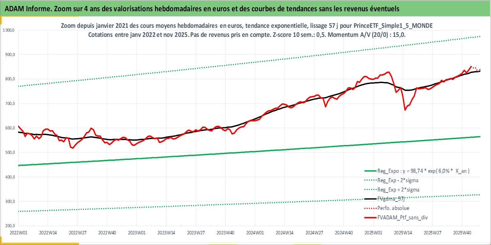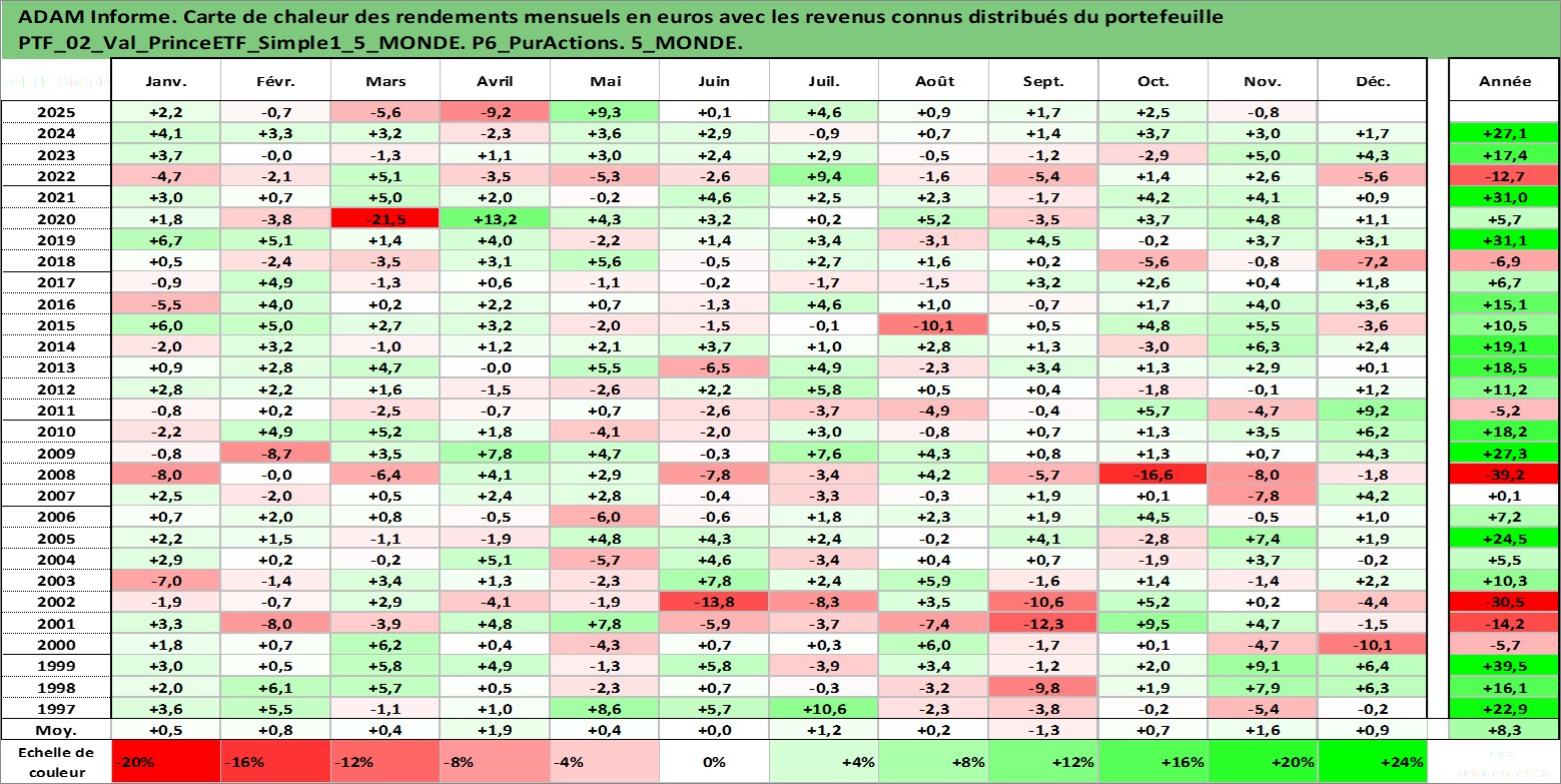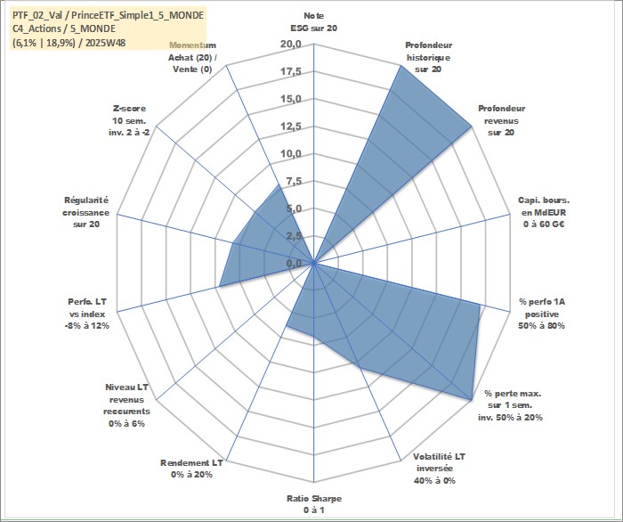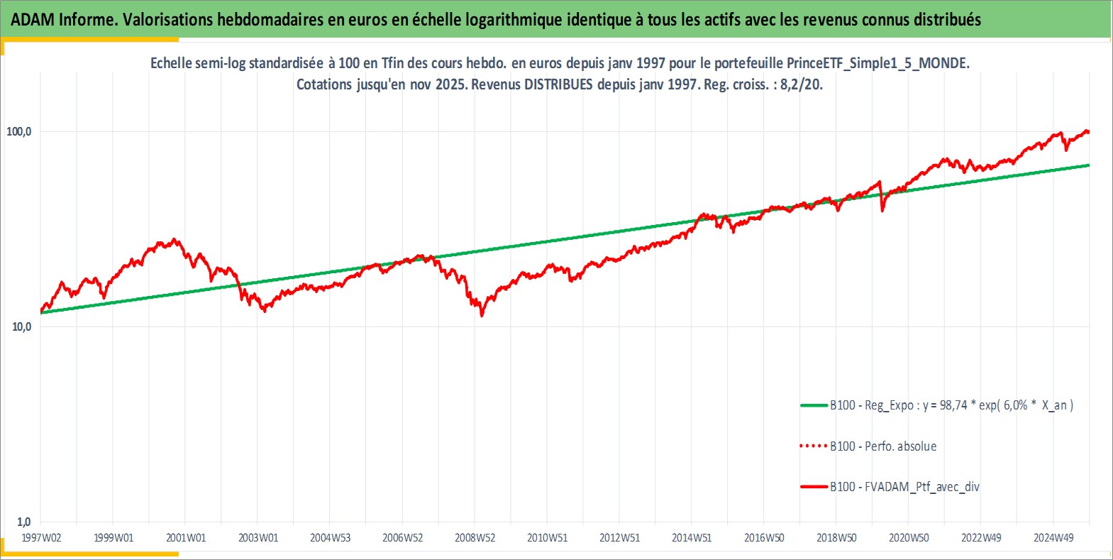 Site dédié aux investisseursPage dédiée sur site financeAnalyse des valorisations hebdomadaires du portefeuille PrinceETF_Simple1_5_MONDE_2actifs avec un profil P6_PurActions. Ce portefeuille est cote en EUR. Les valorisations couvrent les semaines 1997W01 a 2025W48. Les revenus de cet actif financier sont pris en compte depuis la semaine 1997W01. La note ESG de cet actif n'est pas connue.