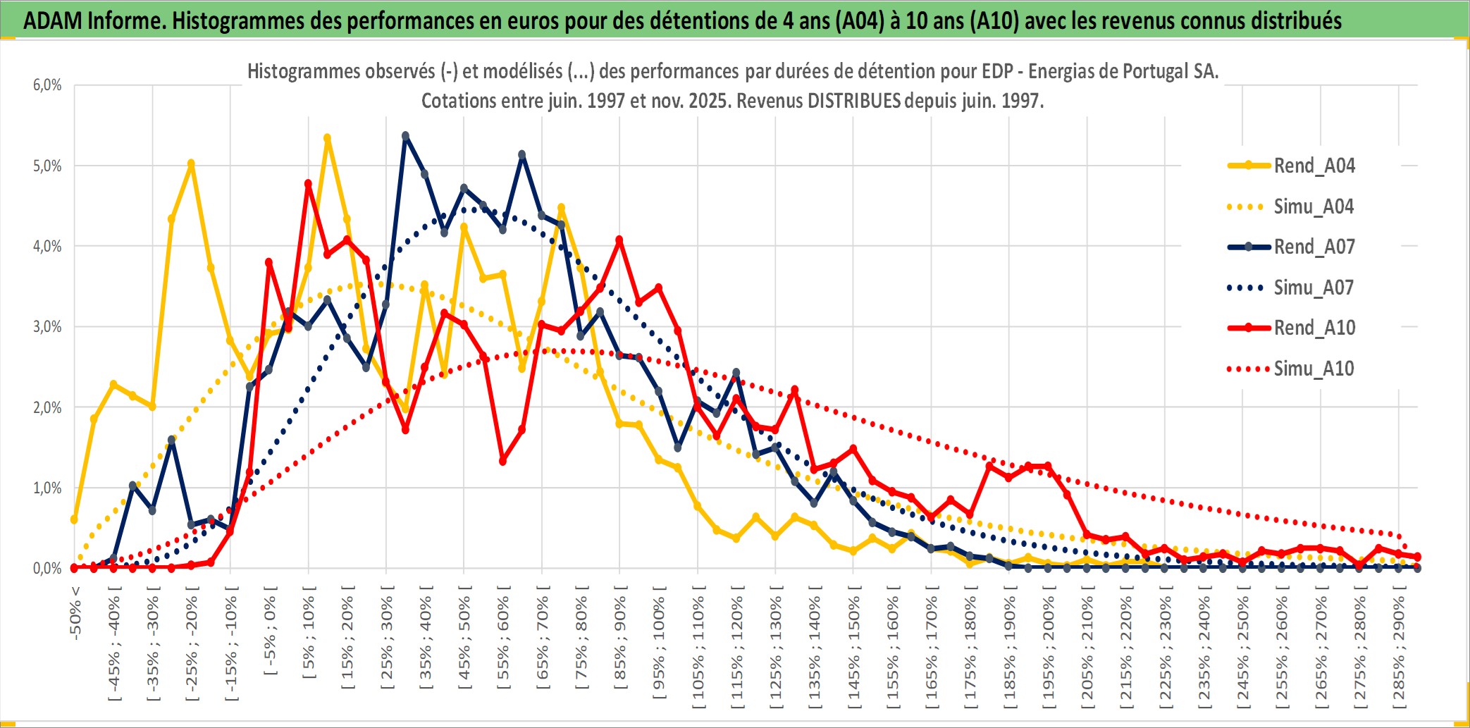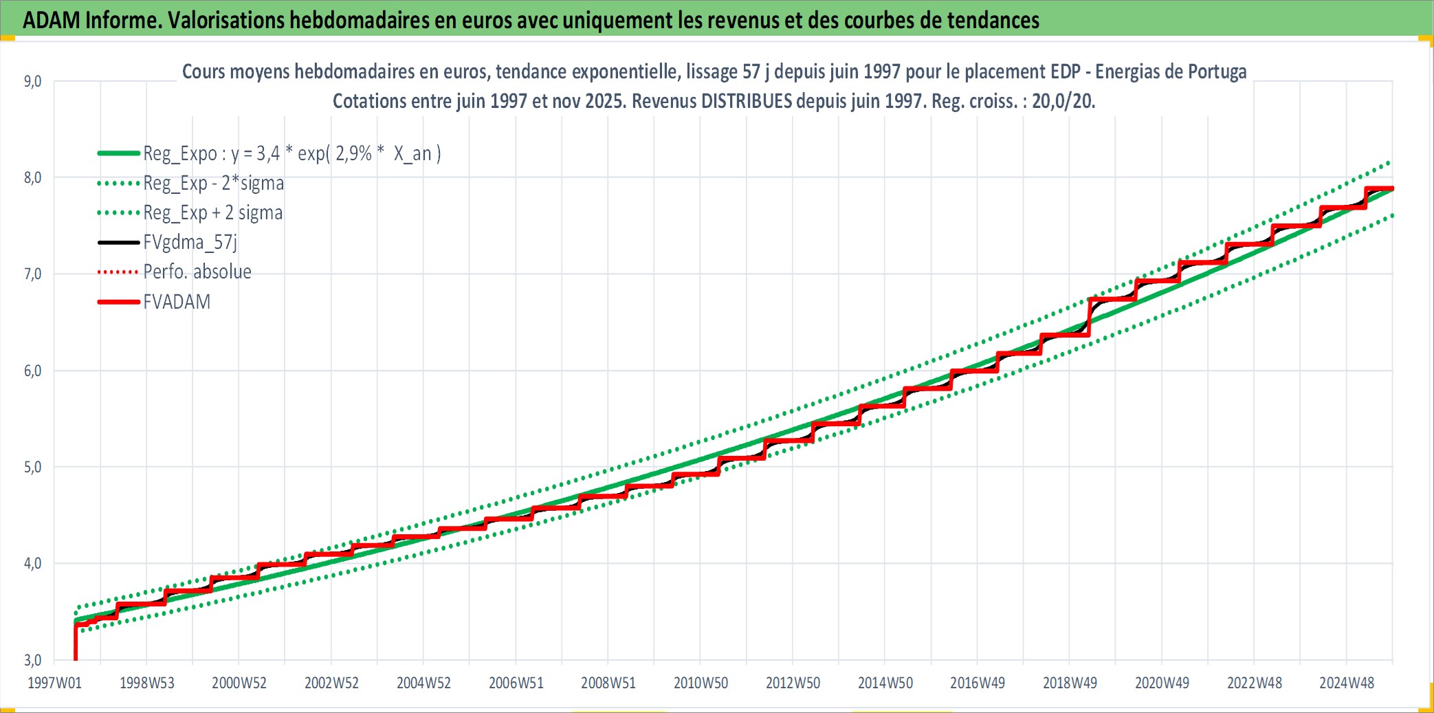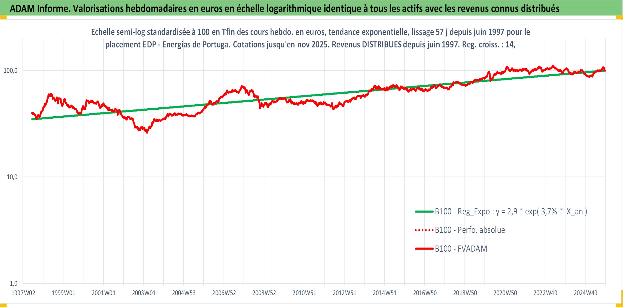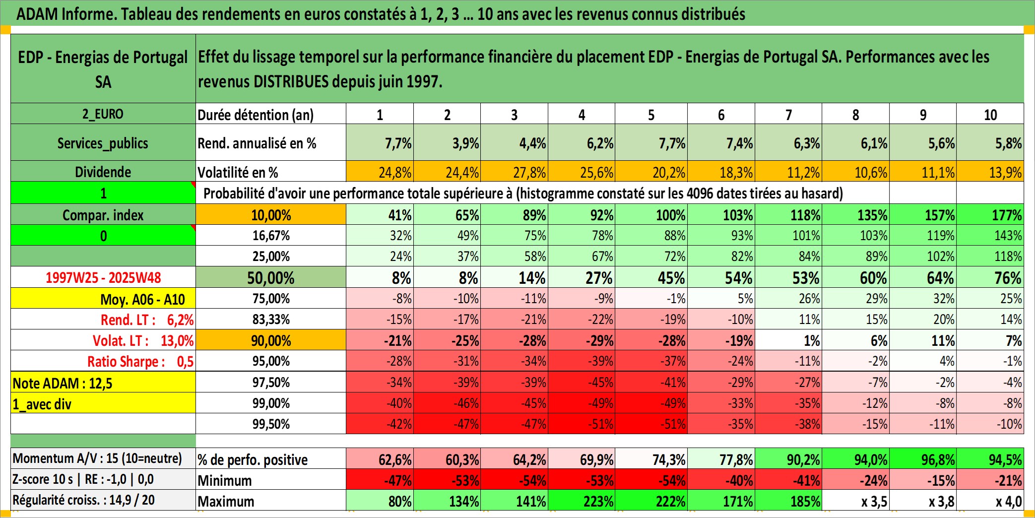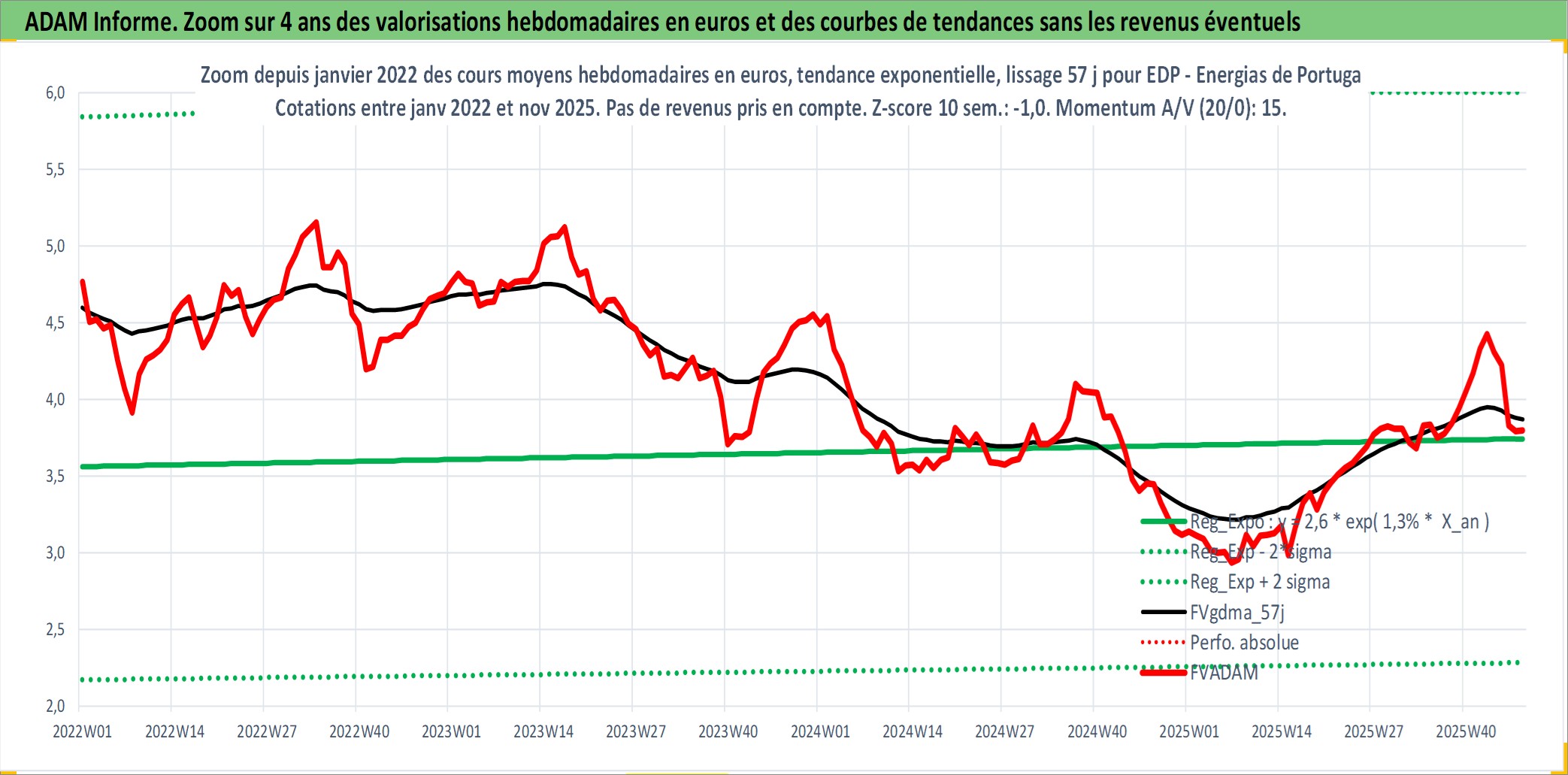 Site dédié aux investisseursPage dédiée sur site financeAnalyse des valorisations hebdomadaires de l'action EDP - Energias de Portugal SA. Cet actif est cote en EUR. Les valorisations couvrent les semaines 1997W25 a 2025W48. Les revenus de cet actif financier sont pris en compte depuis la semaine 1997W26. La note globale ESG de cet actif est estimee a 10.0 (apres rebasage entre 0 et 20).