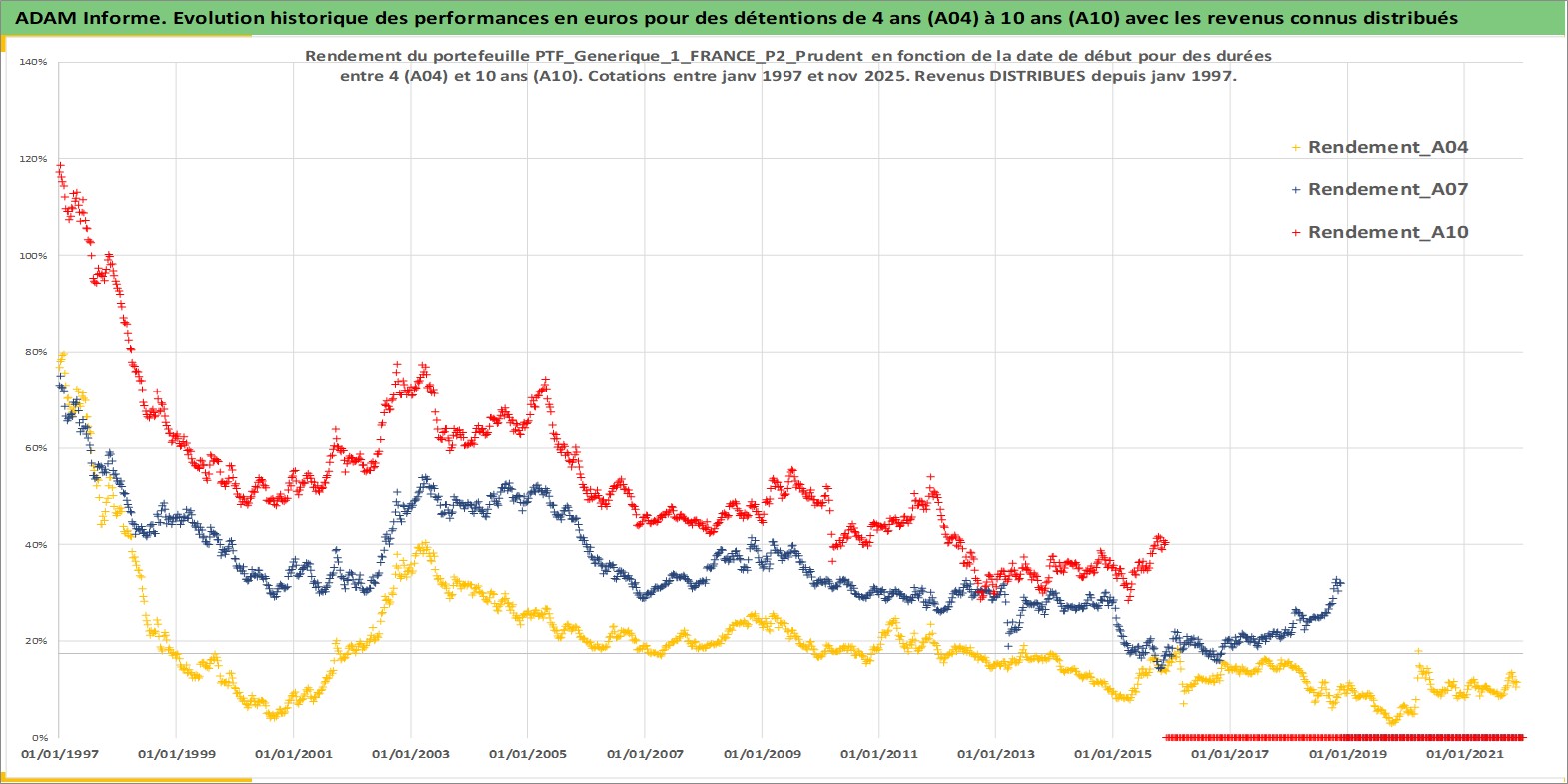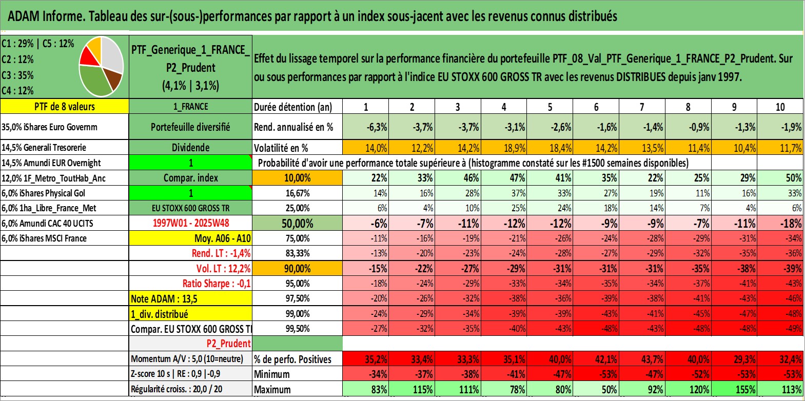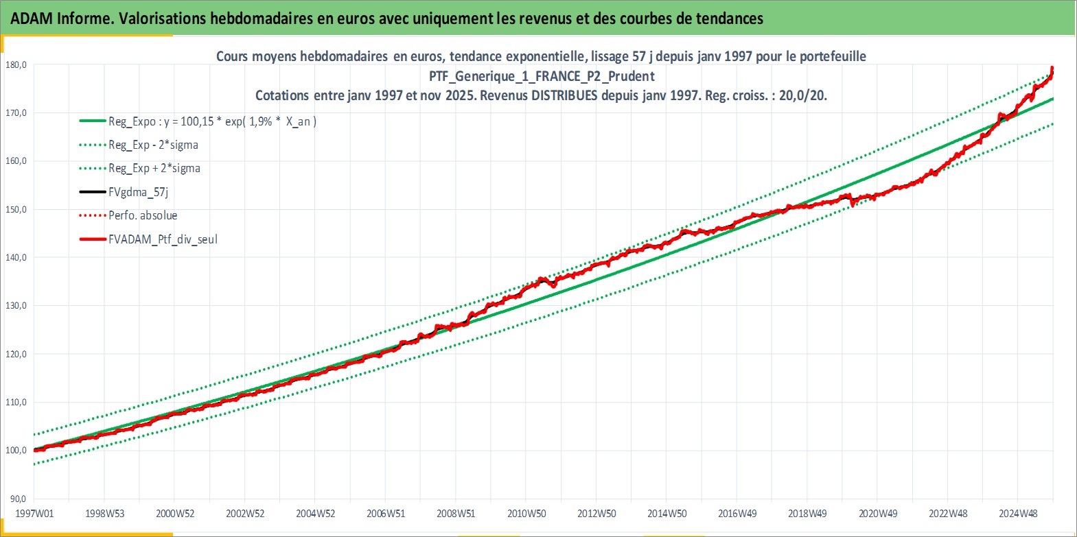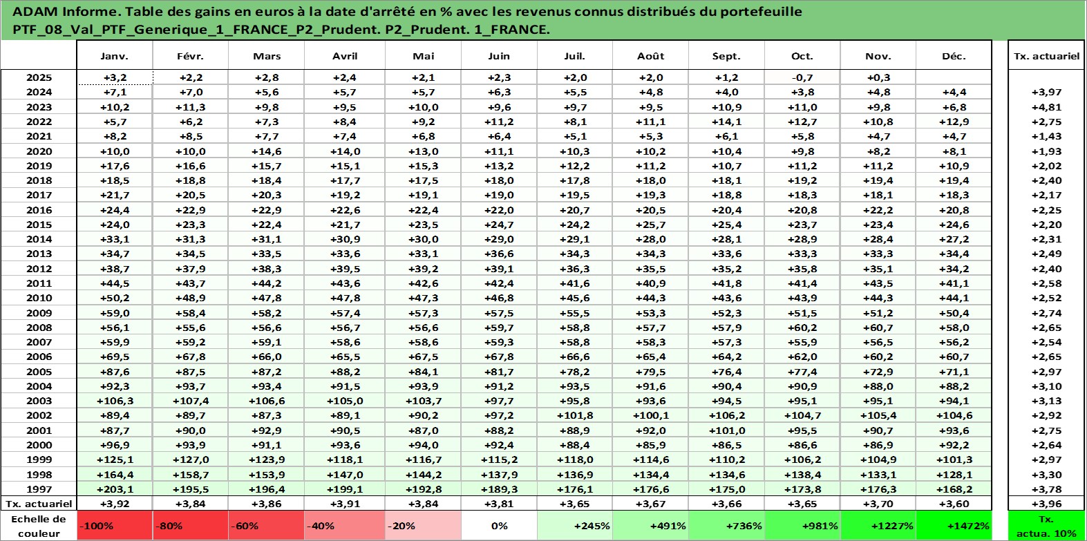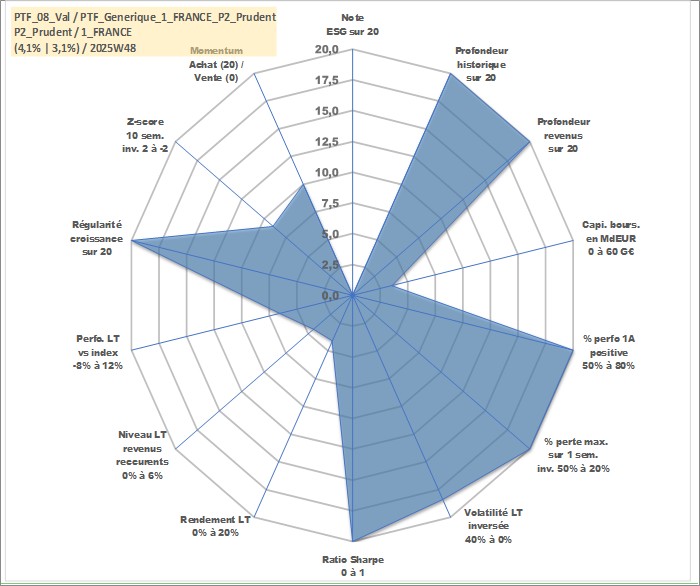 Site dédié aux investisseursPage dédiée sur site financeAnalyse des valorisations hebdomadaires du portefeuille PTF_Generique_1_FRANCE_P2_Prudent_8actifs avec un profil P2_Prudent. Ce portefeuille est cote en EUR. Les valorisations couvrent les semaines 1997W01 a 2025W48. Les revenus de cet actif financier sont pris en compte depuis la semaine 1997W01. La note ESG de cet actif n'est pas connue.