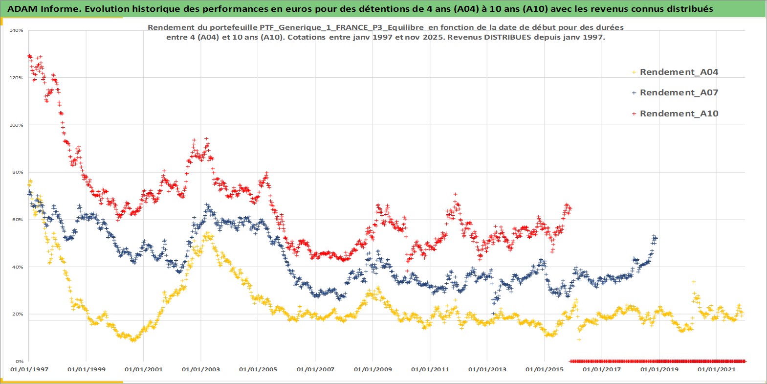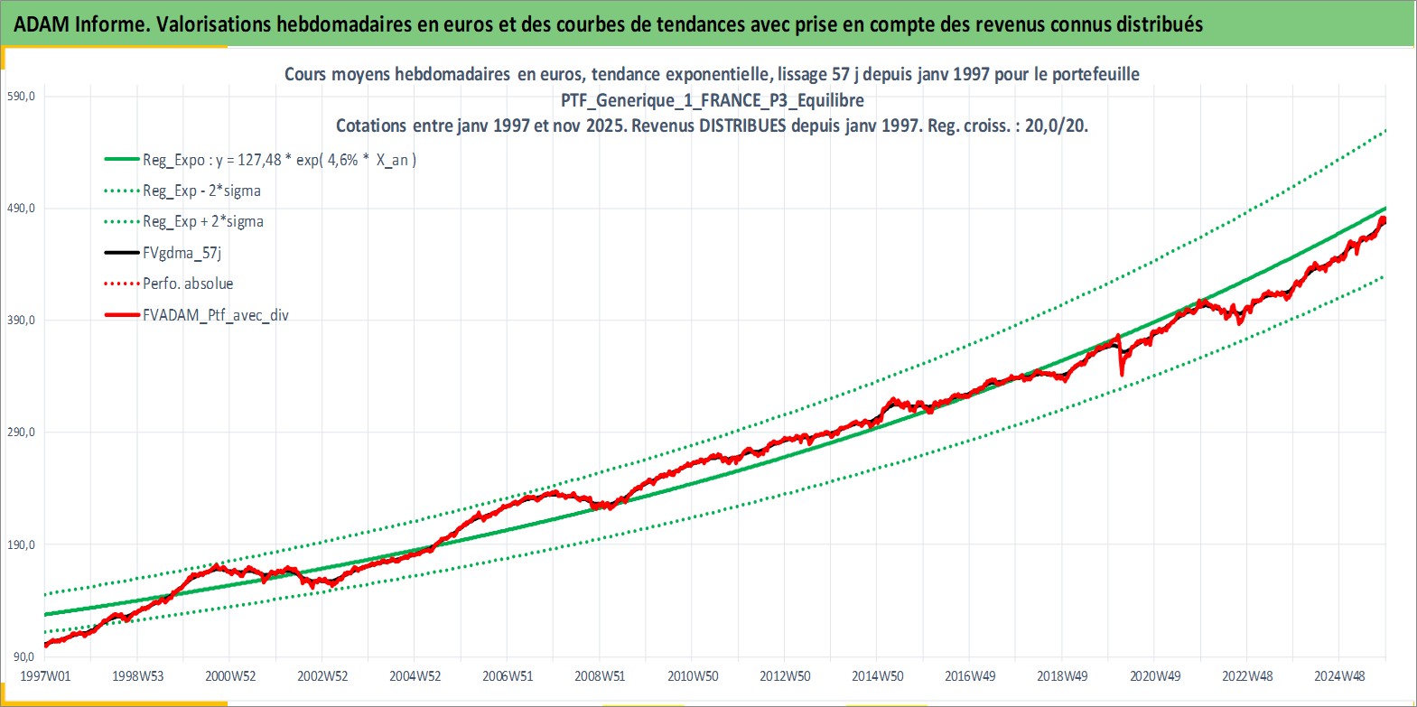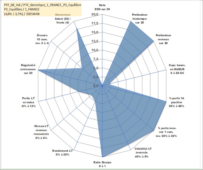 Site dédié aux investisseursPage dédiée sur site financeAnalyse des valorisations hebdomadaires du portefeuille PTF_Generique_1_FRANCE_P3_Equilibre_8actifs avec un profil P3_Equilibre. Ce portefeuille est cote en EUR. Les valorisations couvrent les semaines 1997W01 a 2025W48. Les revenus de cet actif financier sont pris en compte depuis la semaine 1997W01. La note ESG de cet actif n'est pas connue.
